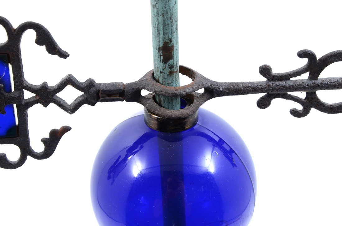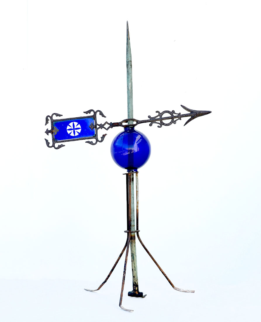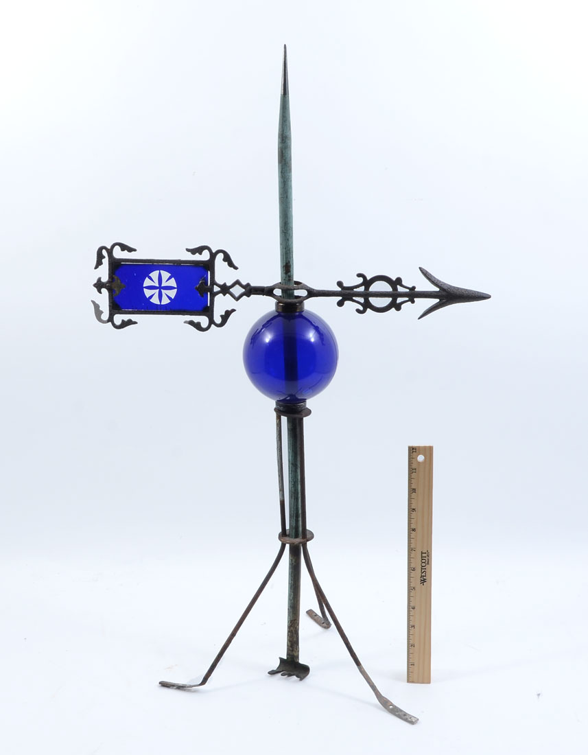 COPPER, IRON AND COBALT GLASS WEATHERVANE & ARROW: Painted copper shaft with cobalt blue glass globe, wrought iron feet. Sold with a cast iron arrow with etched blue glass insert. Base 30 1/4'' h. x 13'' dia. Arrow measures 18 1/2'' long.