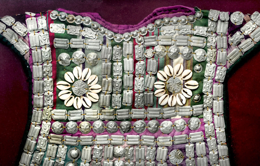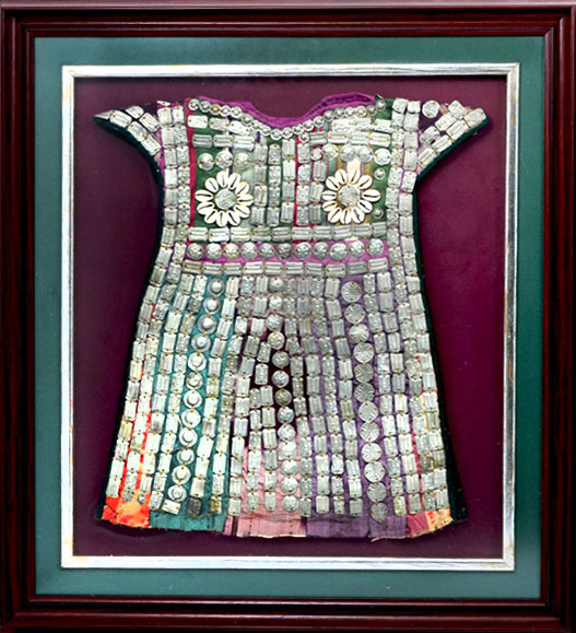 CEREMONIAL TURKMEN CHERJEW CHILDS GARMENT: Nomadic Turkmen childs garment used for ceremonial purposes, patchwork polychrome cloth decorated with embossed silver metal bands and cowrie shells, 19'' h. x 17''. Framed 28 1/4'' x 25 3/4''.