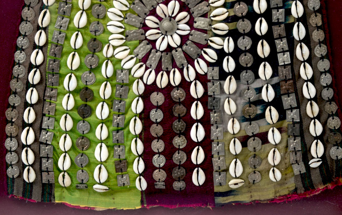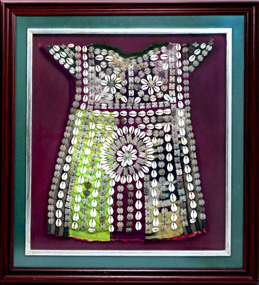 CEREMONIAL TURKMEN CHERJEW CHILDS GARMENT: Nomadic Turkmen childs garment used for ceremonial purposes, patchwork polychrome cloth decorated with embossed silver metal bands and cowrie shells, 19'' h. x 17''. Framed 28 1/4'' x 25 3/4''.