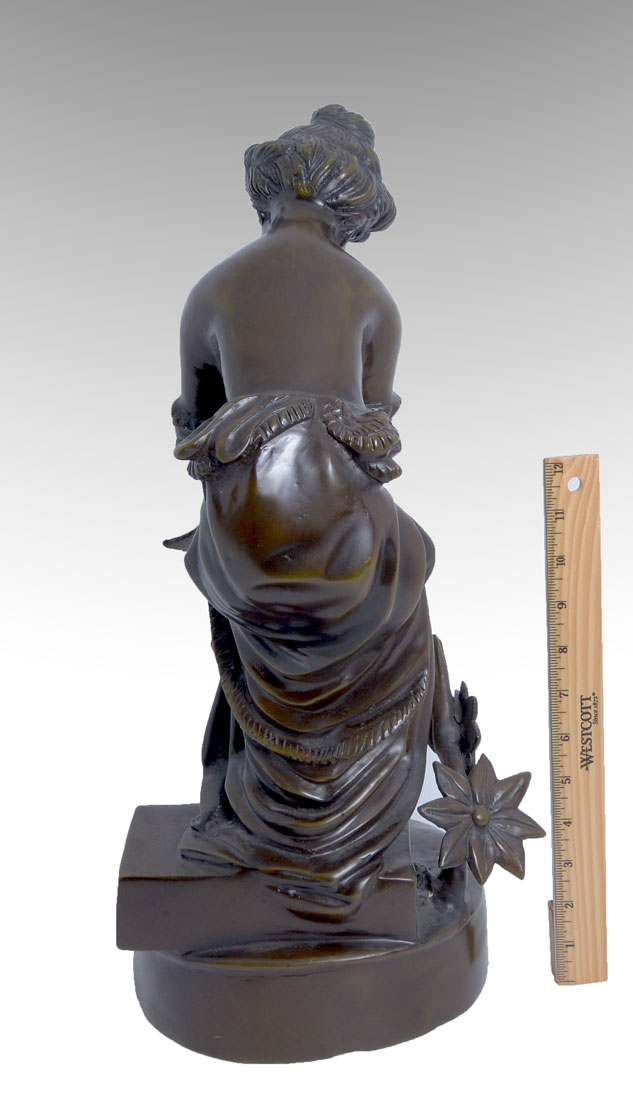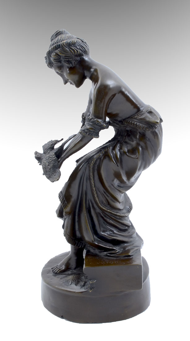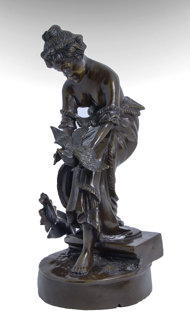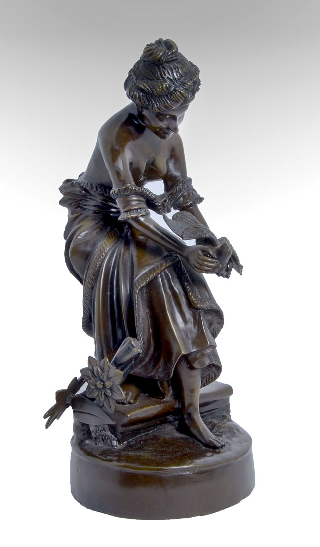 PARTIALLY NUDE BRONZE FEMALE WITH DOVE SCULPTURE: Circa 20th century, approx. 19'' H, incised signature Cayoni.