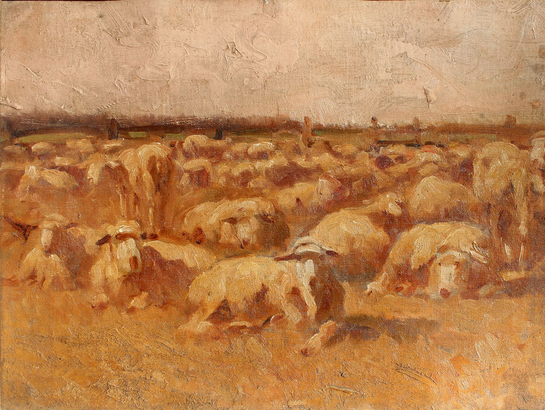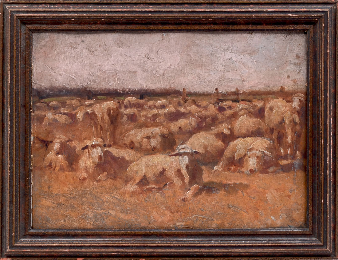 IMPRESSIONIST PAINTING STUDY OF FLOCK OF SHEEP: Oil/Canvasboard, 9.5'' x 12.5'', no visible signature, circa 1920, framed, 12.5'' x 16''.