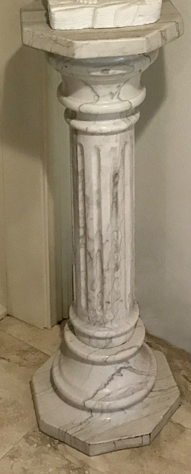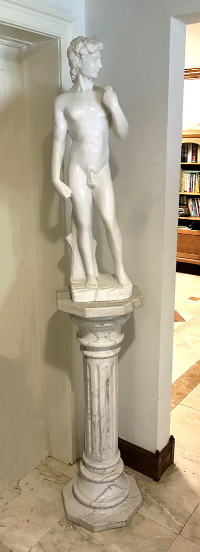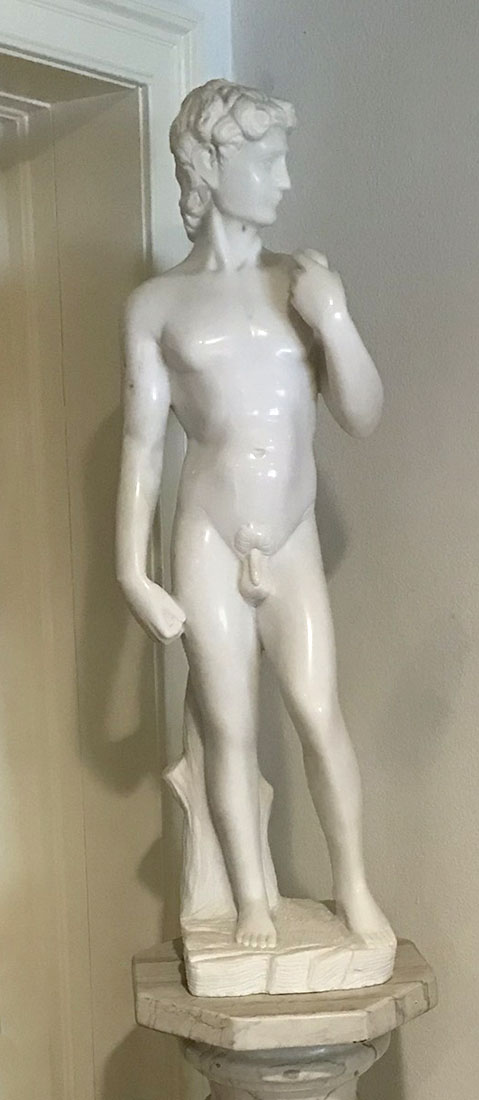 CONDITION: Sculpture of David has several minor blemishes, good overall, sold as is. Pedestal has several minor flaws, very good overall, sold as is.