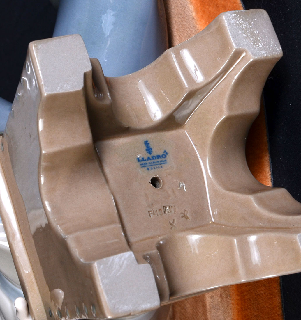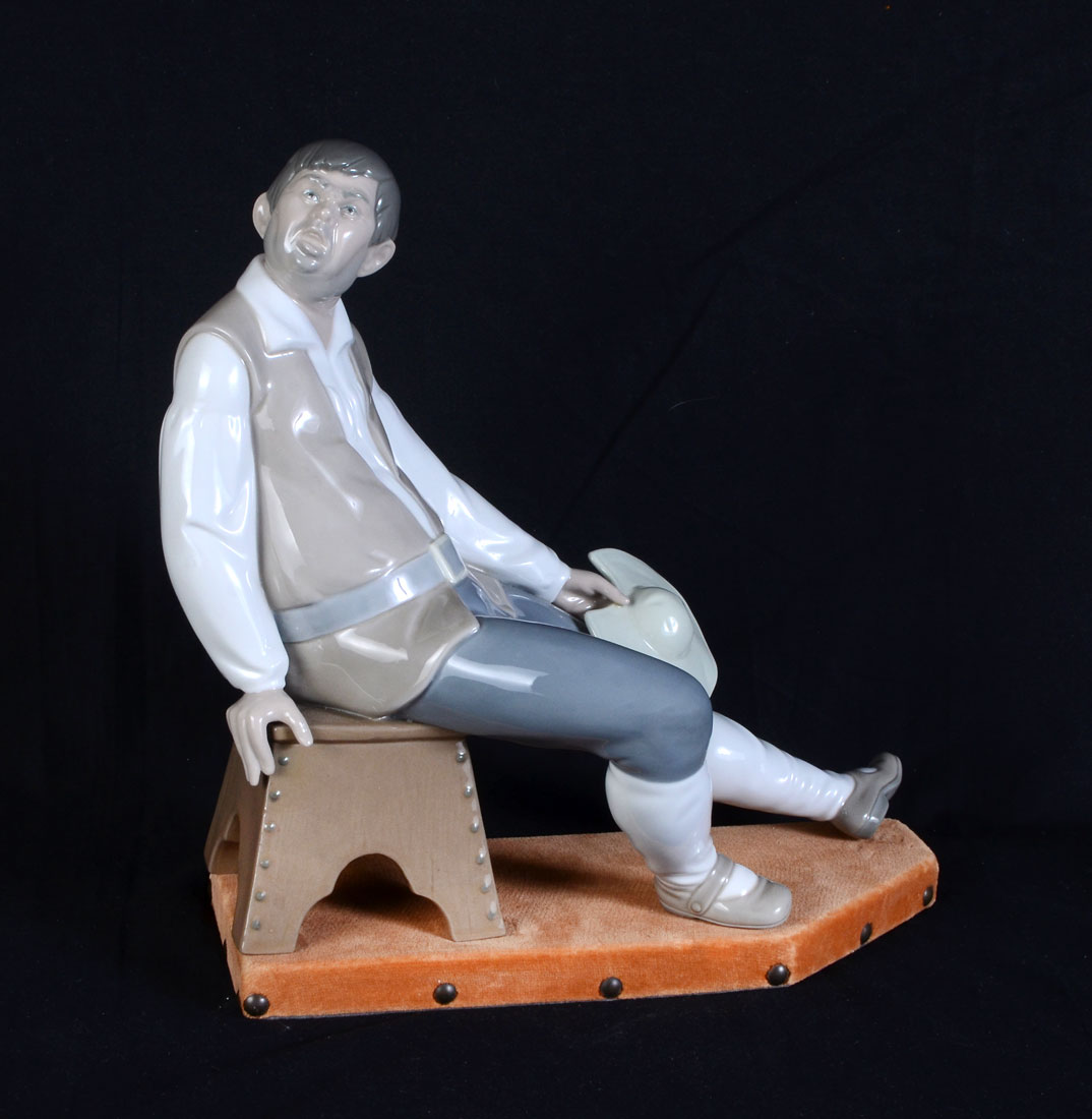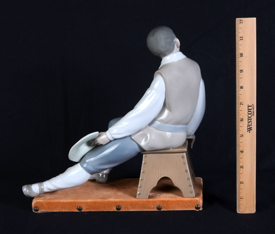 LLADRO MAN ON STOOL: Lladro porcelain shows a puritan man sitting on a stool holding his hat. The porcelain has been retired and is marked on the bottom ''Lladro Made In Spain''. Excellent condition.