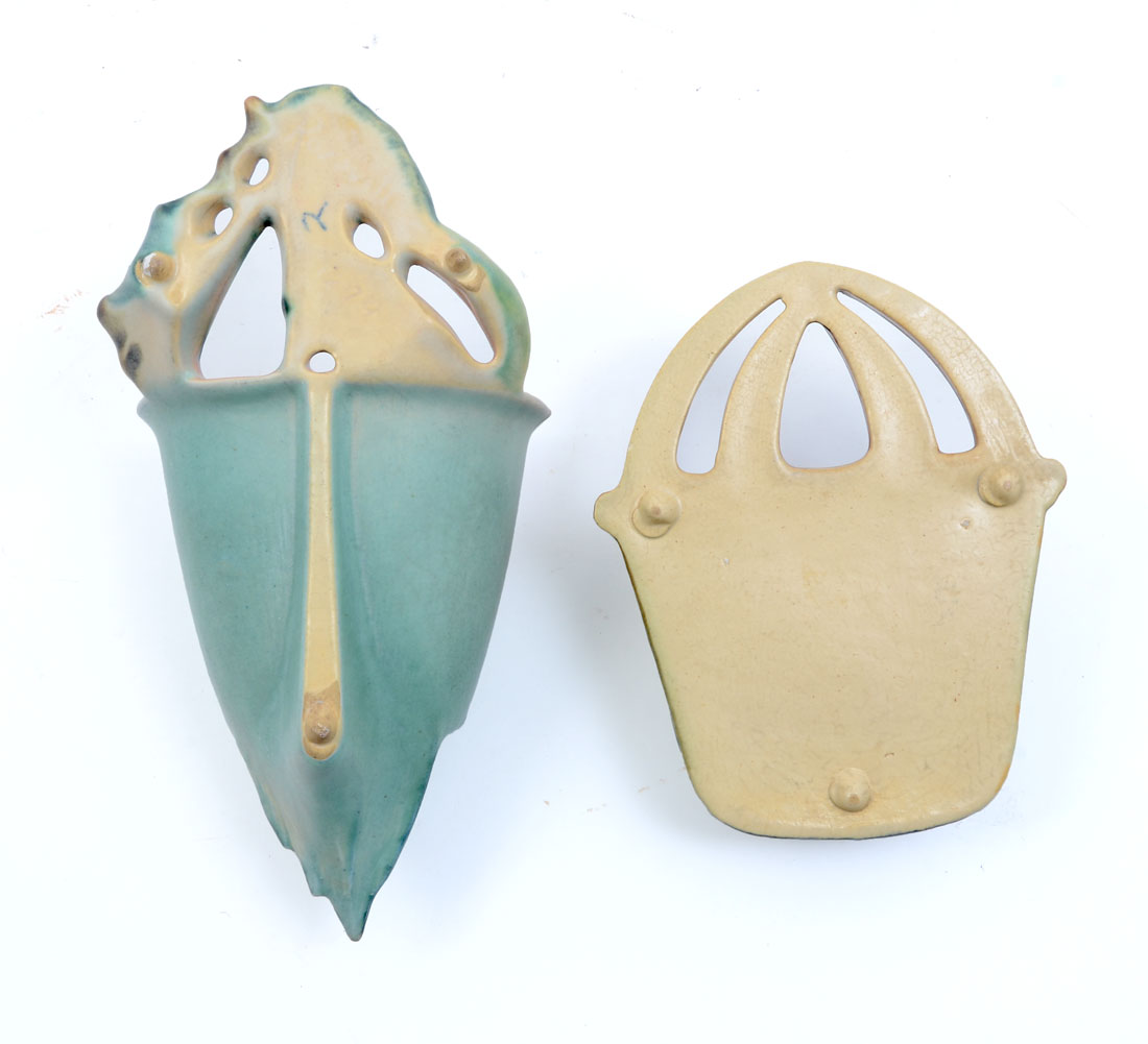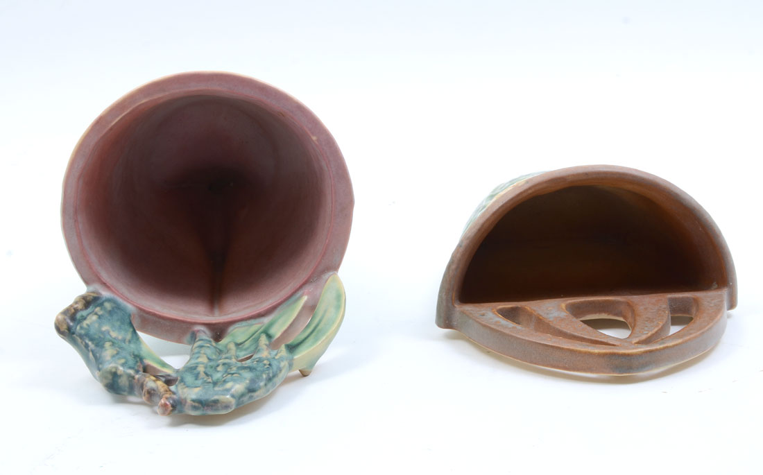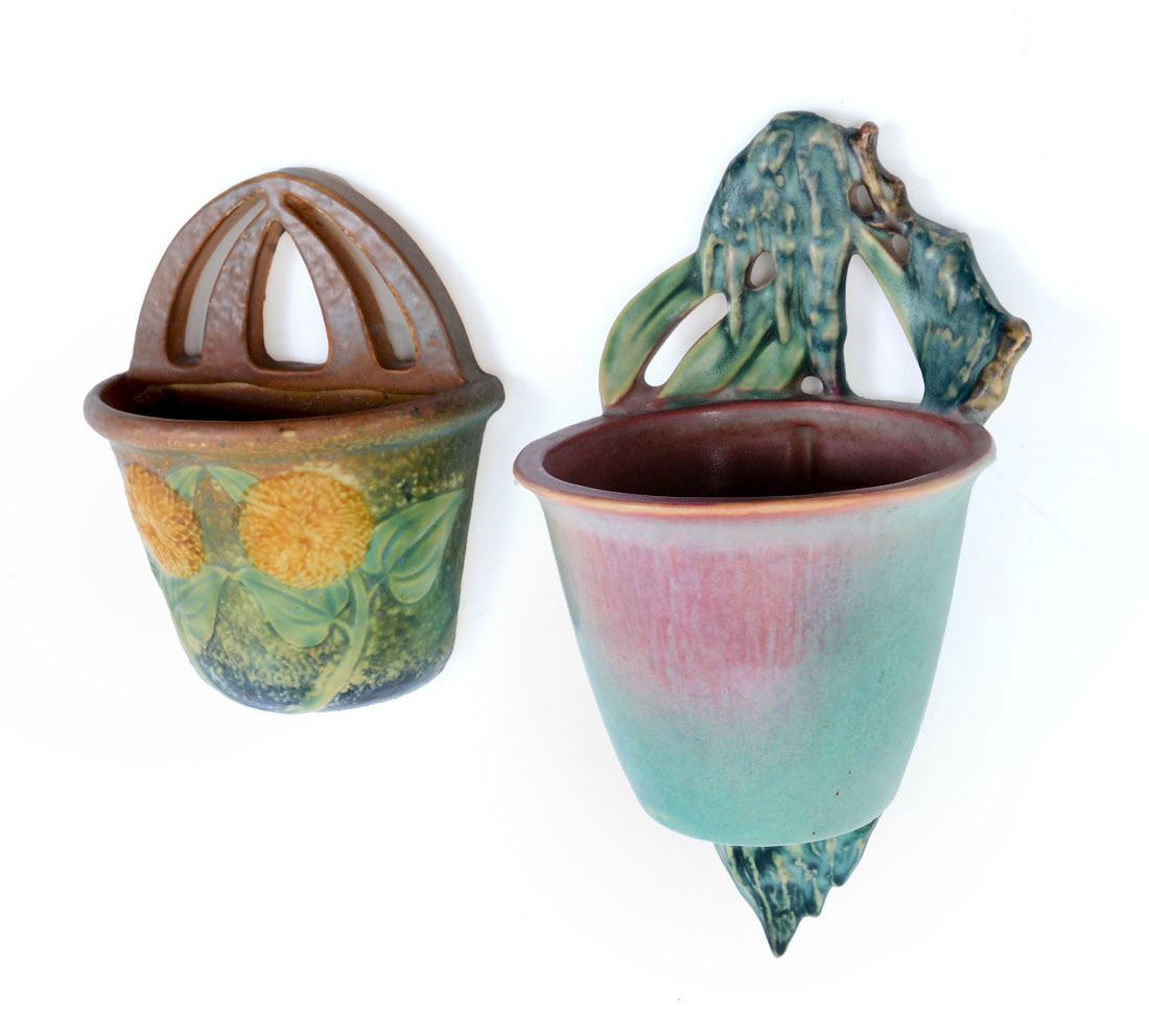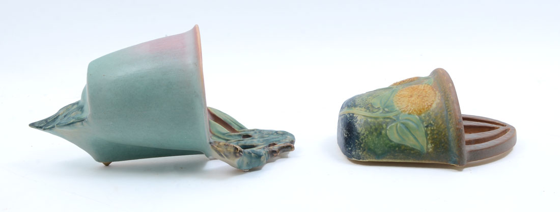 2 PC RARE ROSEVILLE MOSS AND SUNFLOWER WALL POCKETS: 2 Piece lot comprising 1 Roseville Moss Pink Wall Pocket #1279 (10 1/8'') and 1 Roseville Sunflower Wall Pocket #1265 (7 1/4''). Sold as a lot.
