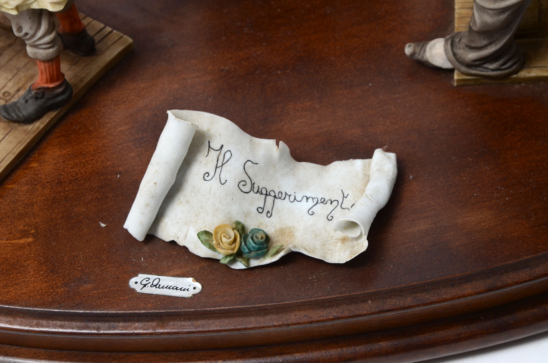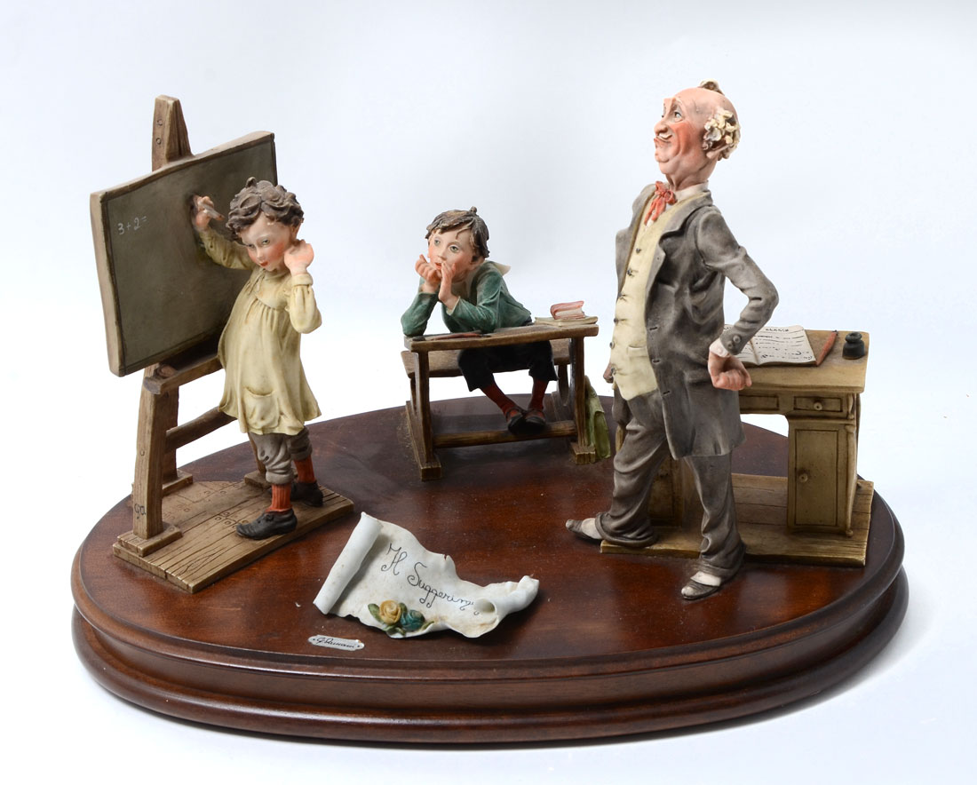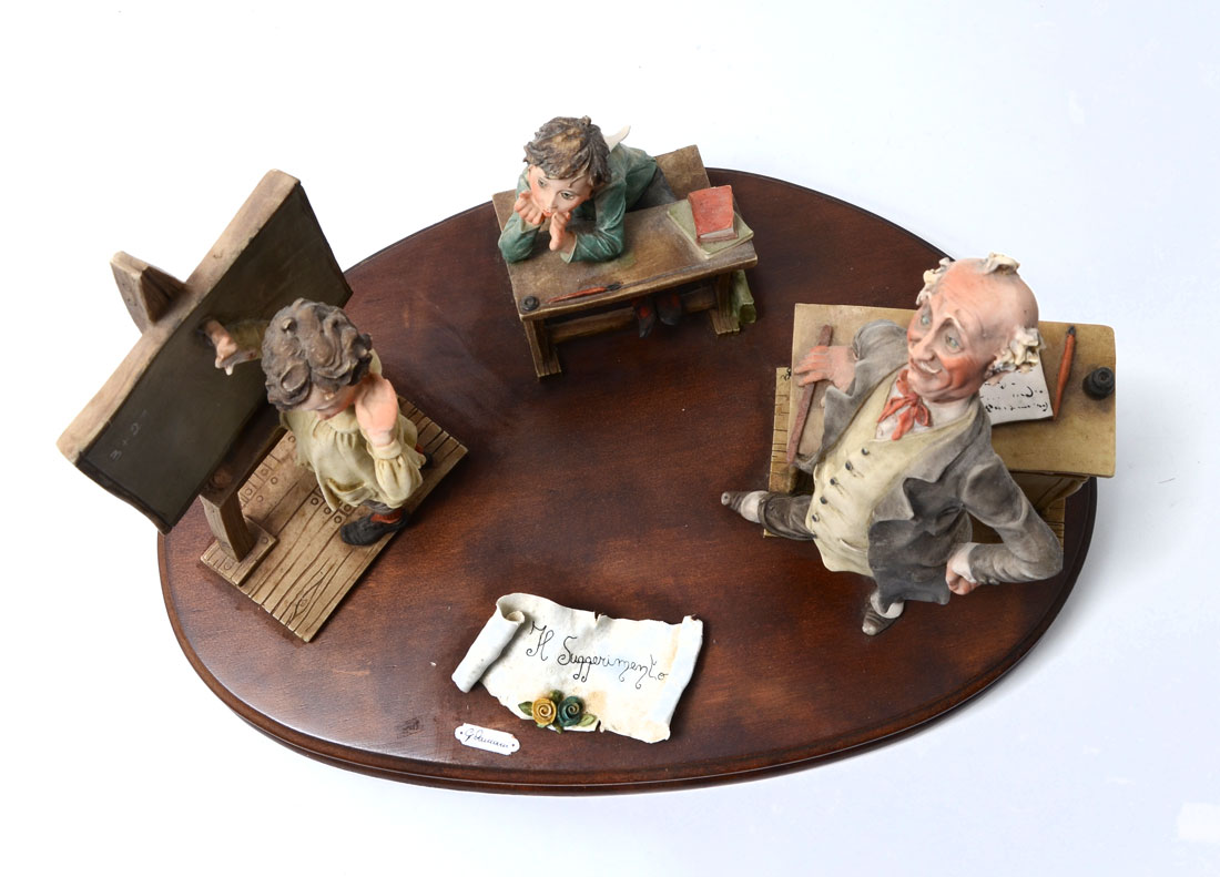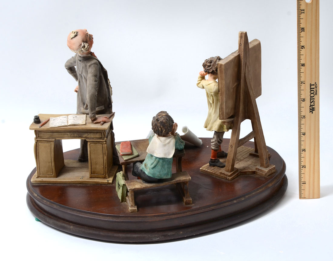 GUISEPPE ARMANI ''THE SCHOOL TEACHER'' FIGURAL GROUP: Composite figural group featuring a school teacher and 2 students, one seated at a desk, the other at the black board. On wood base, 10 ''h. x 15 1/4'' x 10''.