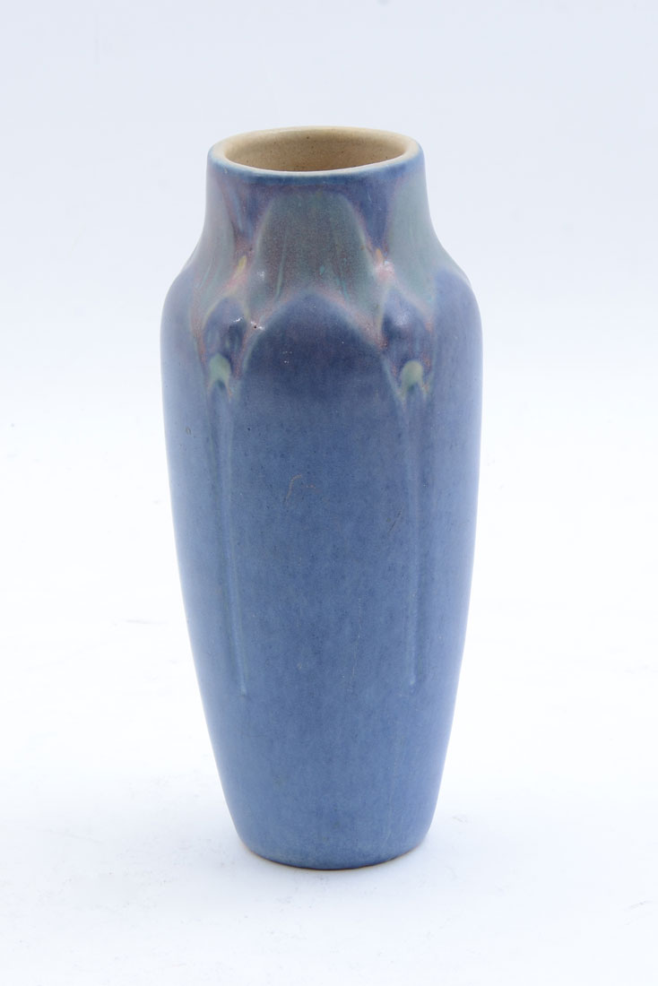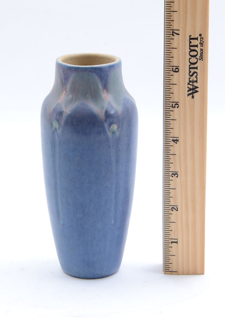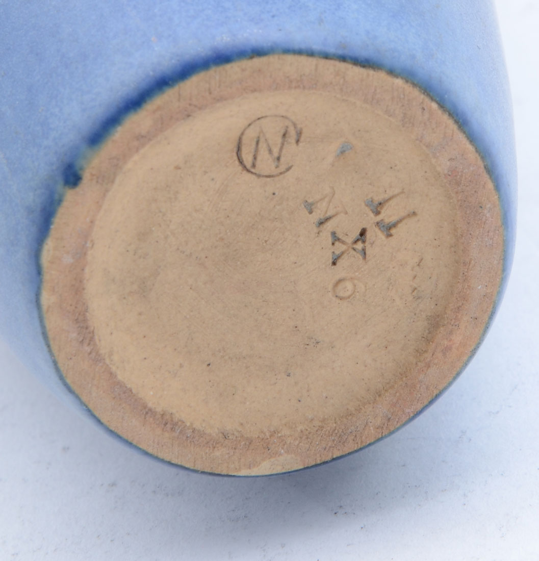NEWCOMB COLLEGE POTTERY BLUE CABINET VASE: Blue glaze ground with incised polychrome decorated stylized flowers. Impressed marks on base ''NC, 11, N X 6'' with incised MC? Overall measures 6 1/4'' h. x 2 3/4''.