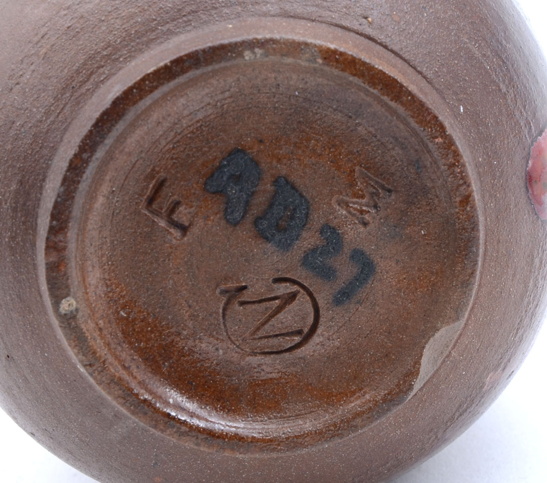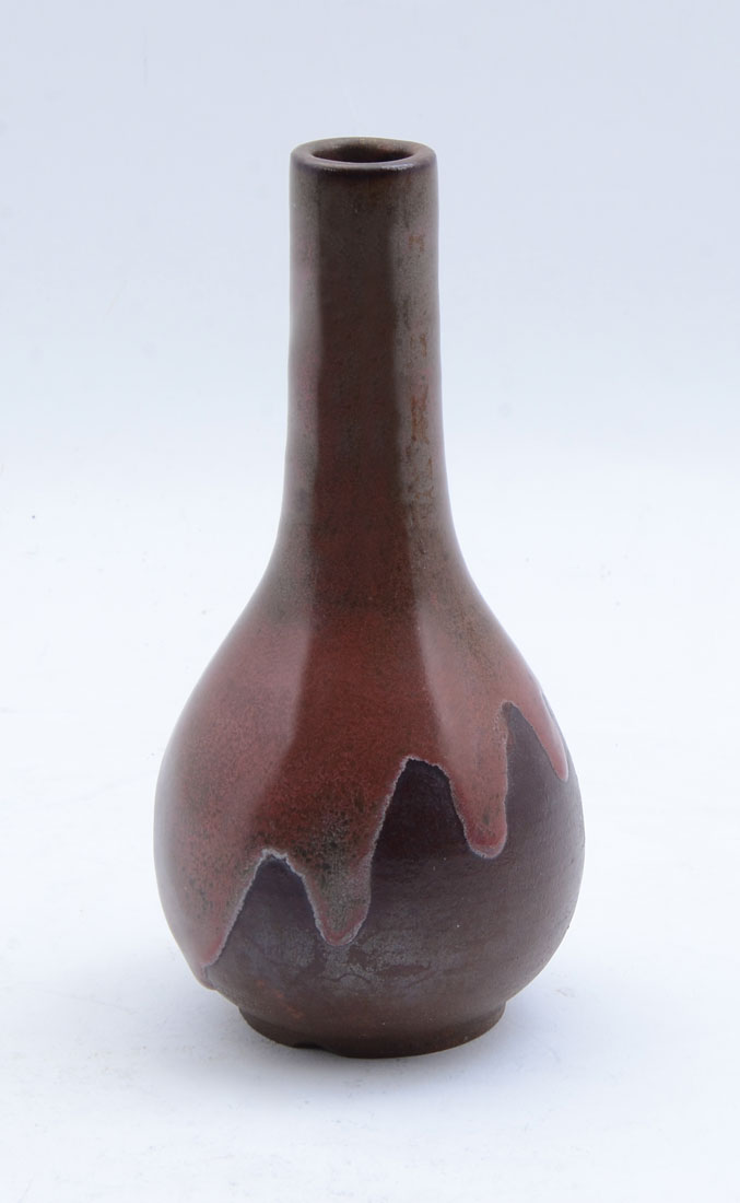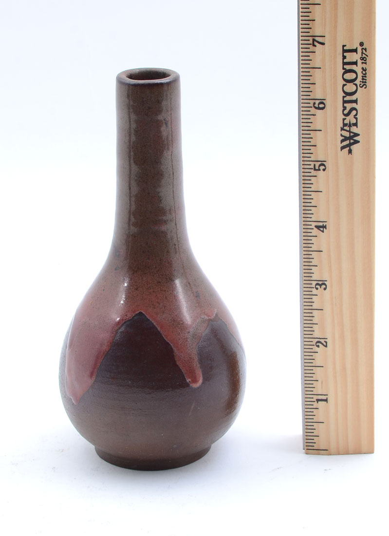 NEWCOMB COLLEGE COPPER RED BUD VASE: Bulbous brown clay body, tapered neck with copper red glossy slip glaze extending over shoulder. Base with impressed marks ''NC, E or F, M: and hand written AD 27. Measures 6 1/2'' h. x 3 1/4''.