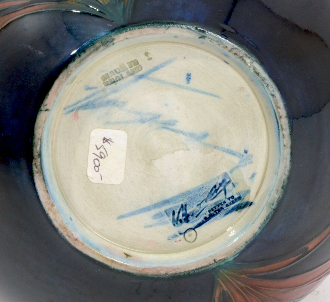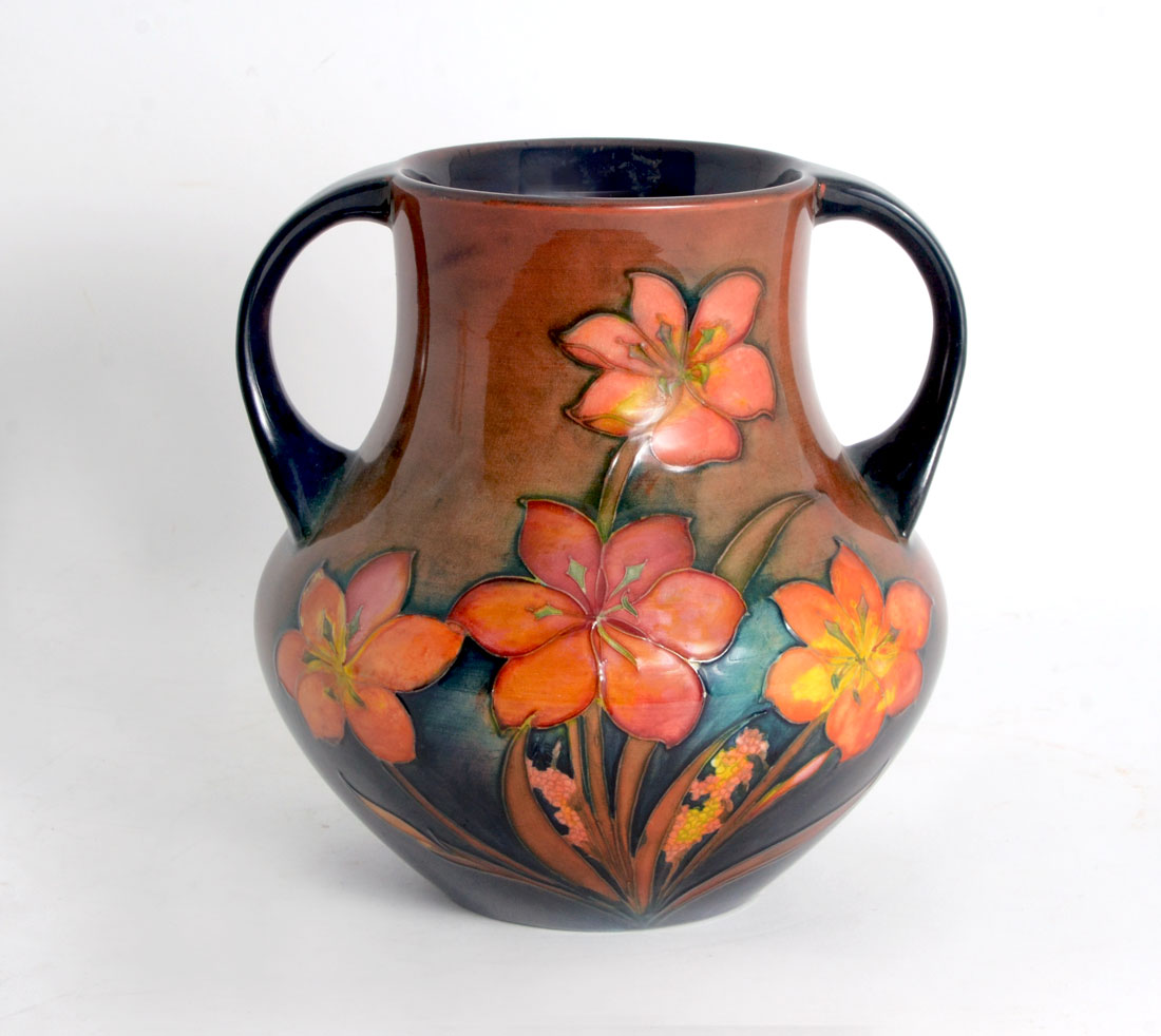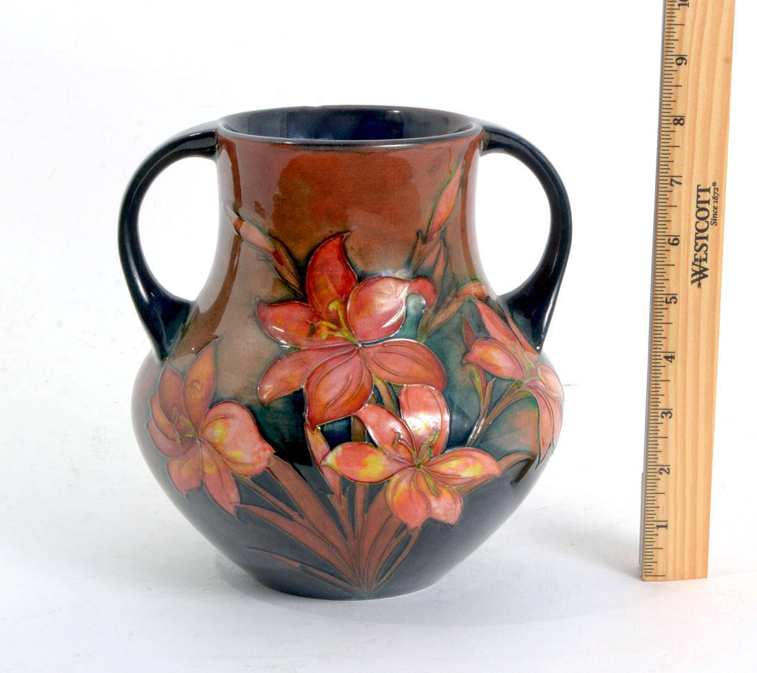 MOORCROFT POTTERY DOUBLE HANDLED FREESIA VASE: Mottled red to green ground. Polychrome freesia or lilies, Impressed and signature marks, 10'' h. x 7'' dia.