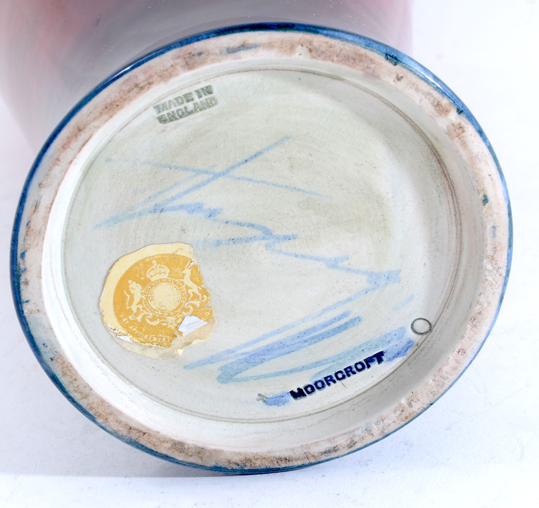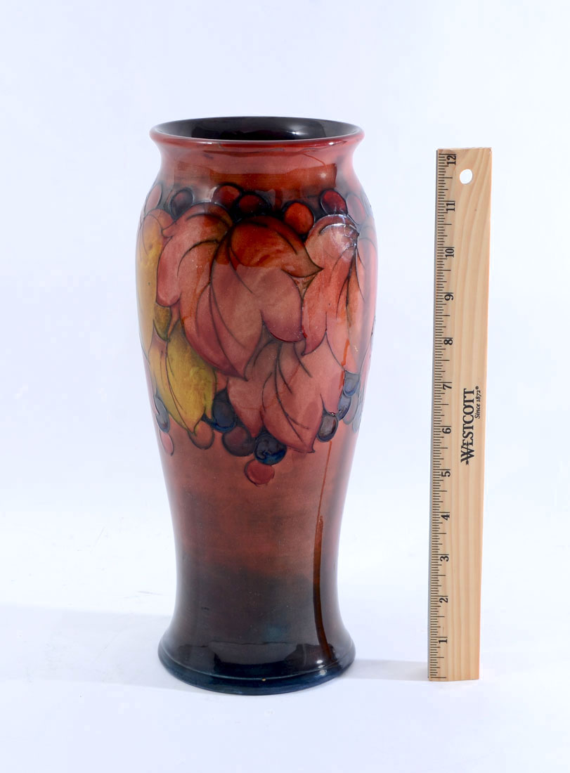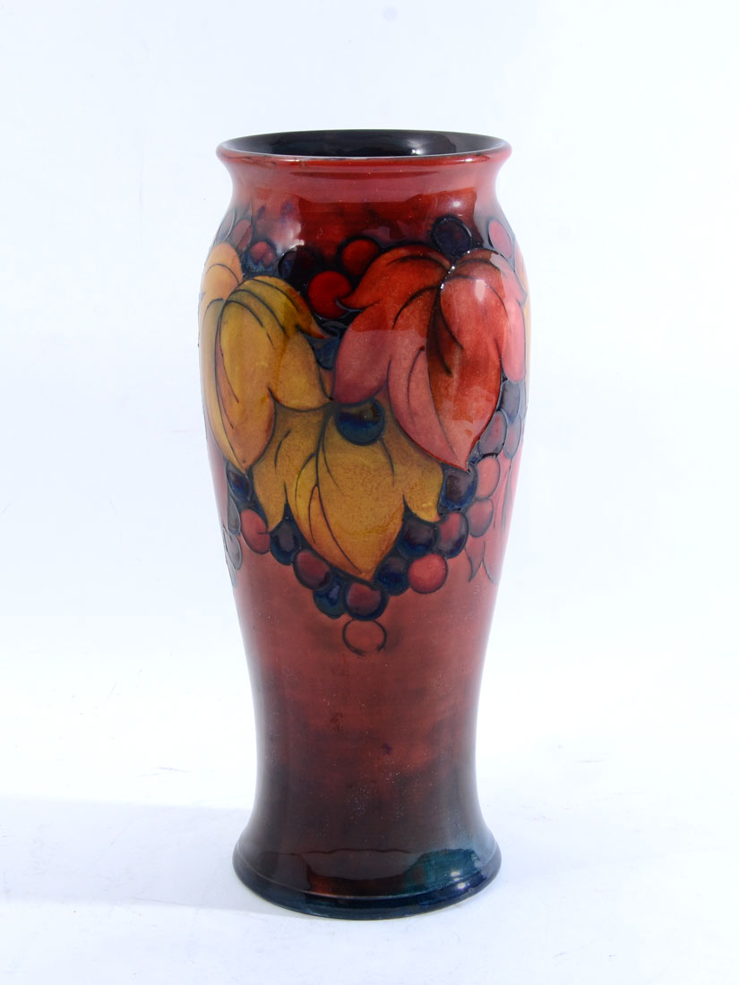 MOORCROFT FLAMBE GRAPE AND VINE VASE: Baluster form vase, flambe glaze with grape and vine motifs. Impressed markings with signature and partial foil label. 12 1/2'' h. x 5 1/2''.