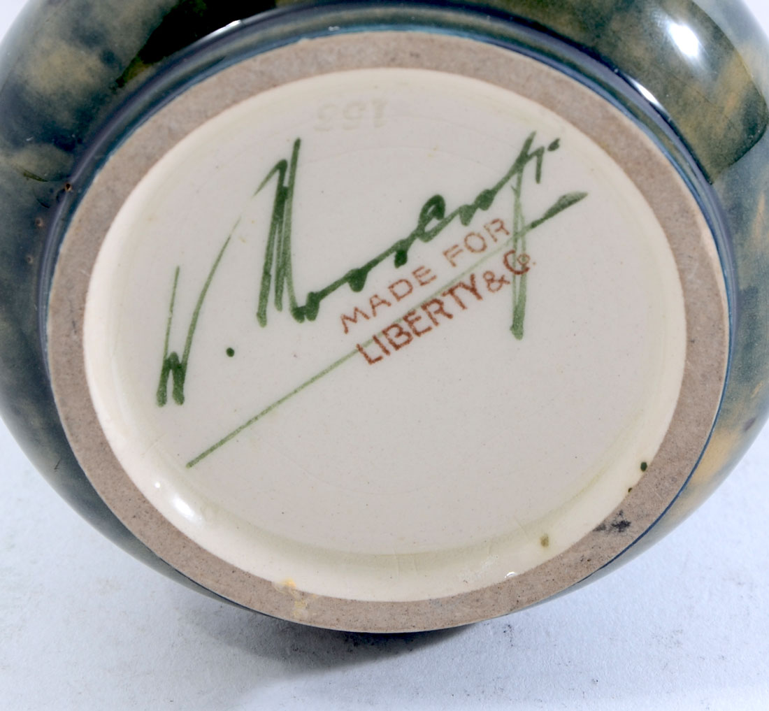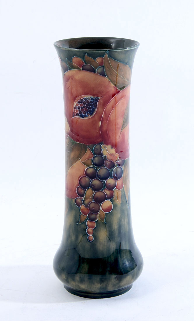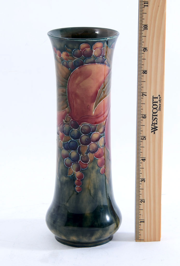 W. MOORCROFT FOR LIBERTY CYLINDRICAL POMEGRANATE VASE: Mottled green ground pomegranate and grapes motif, cylindrical shape with flared rim and base over foot. Painted W. Moorcroft, stamped Made for Liberty & Co., impressed 153. 9 1/2'' h. x 3 1/2''.
