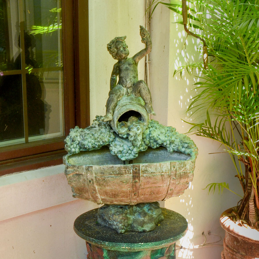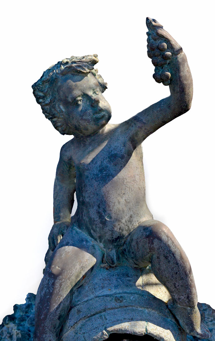 CAST BRONZE FIGURAL PUTTI ON WINE BARREL FOUNTAIN: Figure of a putti seated on a wine barrel with grape vines, deep basin, sold with the pump, 29 3/4'' h. x 21'' x 17''. Fountain only.