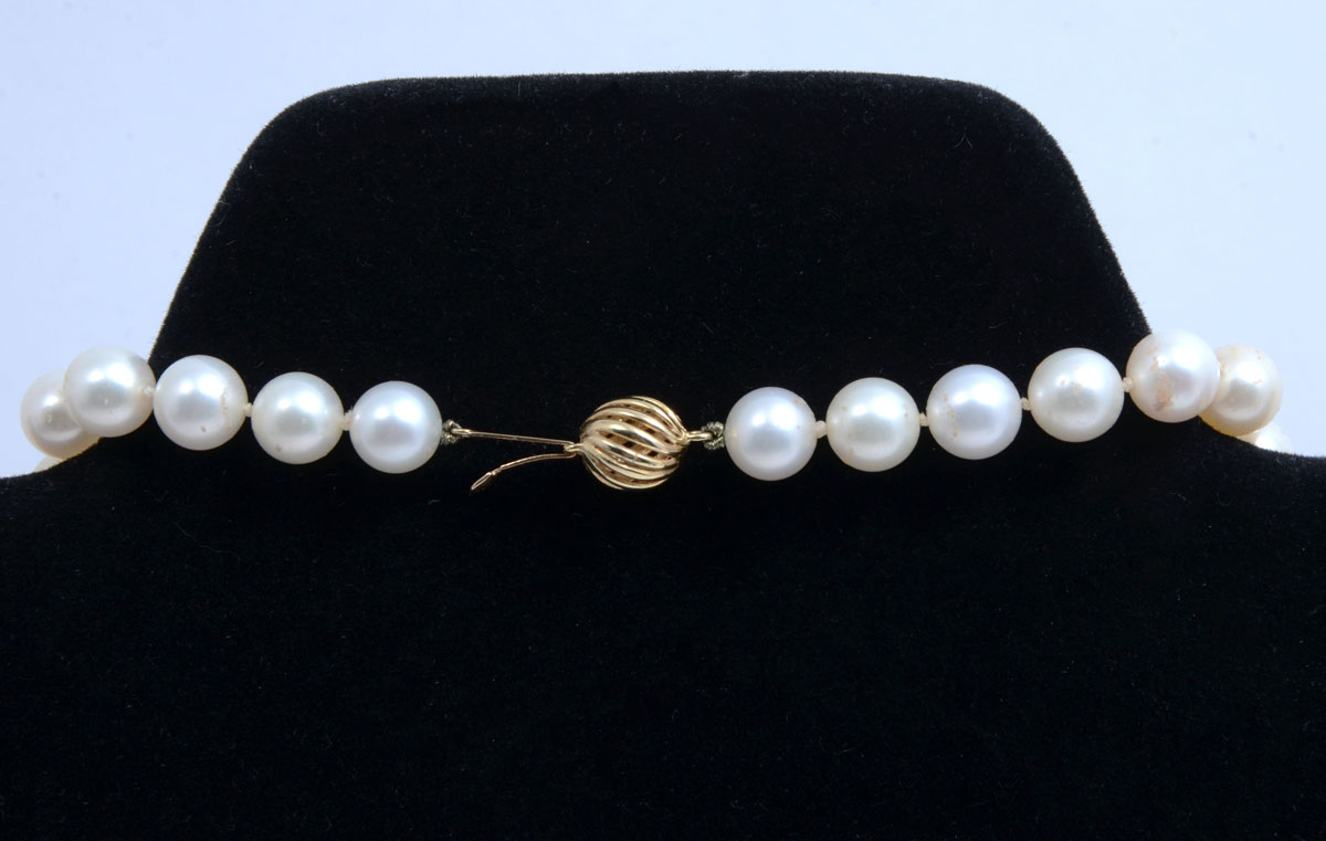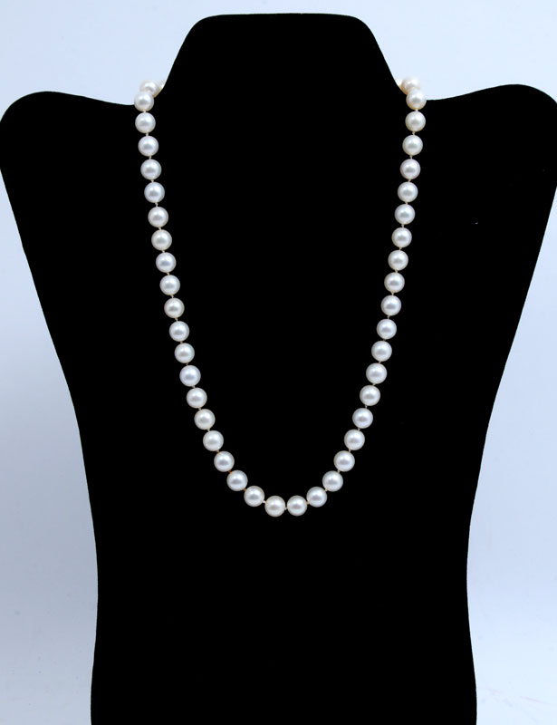 8.00-8.50 MM AKOYA CULTURED PEARLS WITH 14K CLASP: 8.00-8.50 mm Akoya cultured pearls. Light cream in color. Very slightly blemished with medium/high luster. 18'' necklace is secured with 14K ball clasp.