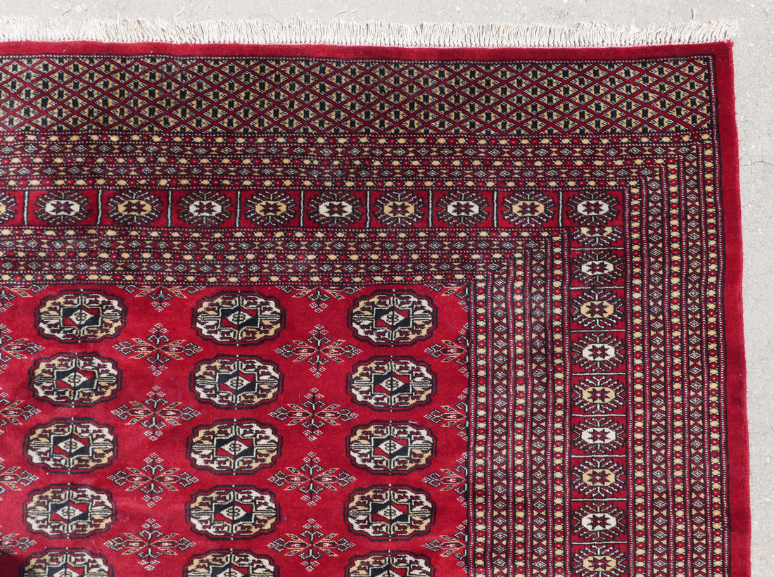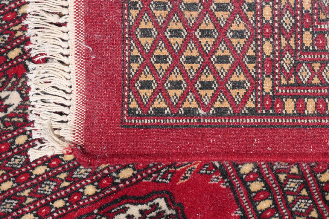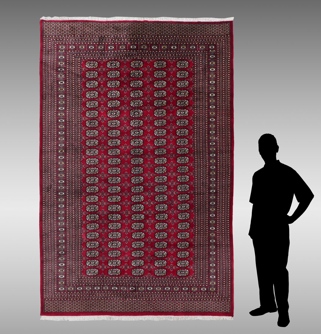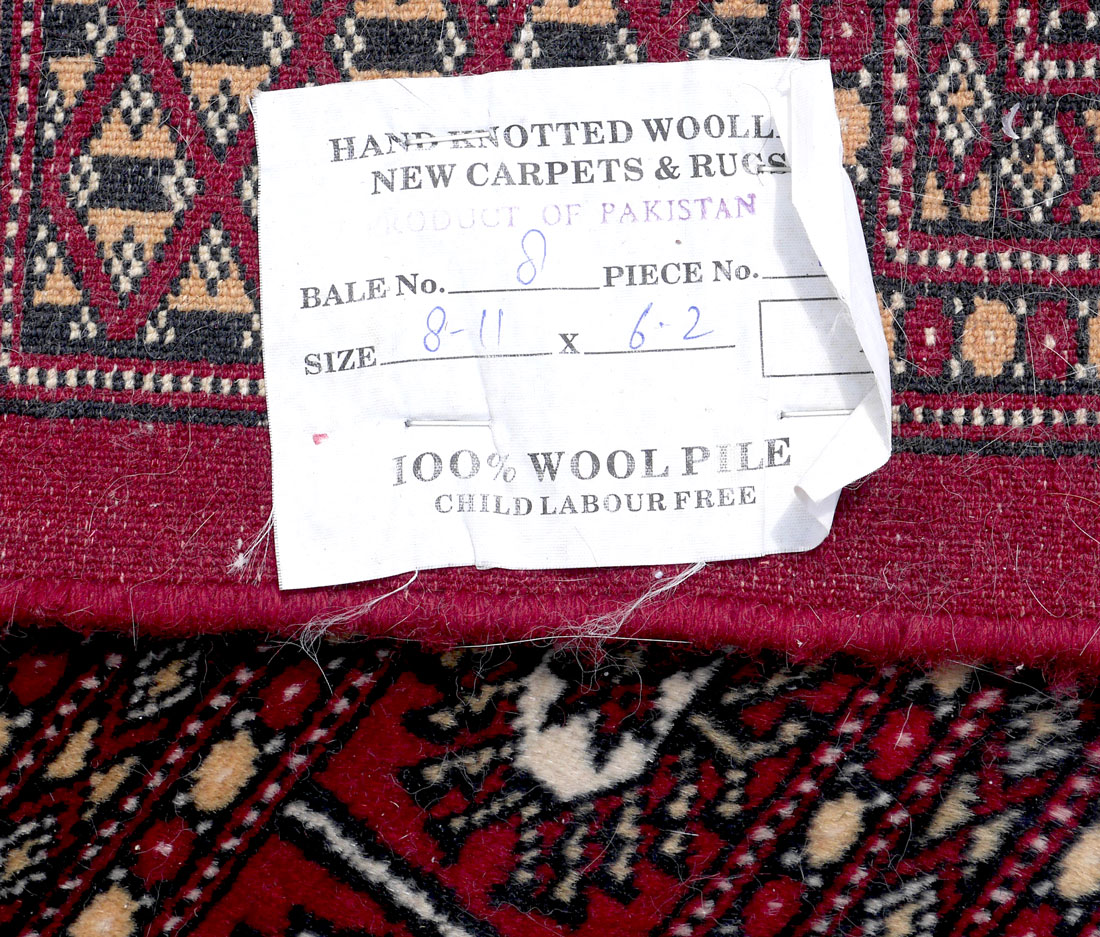 APPROX 20-45 YR OLD PAKISTANI BOKHARA HAND KNOTTED WOOL RUG, 6'1'' X 8'10'': This rug has a traditional Bokhara pattern and colors with its rich red ground covered by rows of two patterns of ''guls''. The larger guls have an ''elephants foot'' shape in white and pale yellow with red, black and white inner design. The rug also has the typical multiple small borders with an apron or extra, wide border at each end.