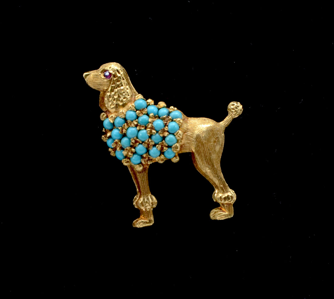 18K TURQUOISE POODLE PIN: 18K yellow gold pin with 22 cabochons of turquoise. One round faceted ruby. Bar pin closure. Weight: 4.6 grams.