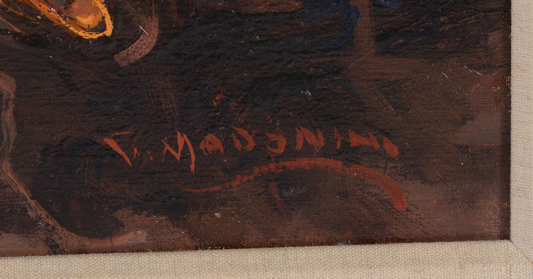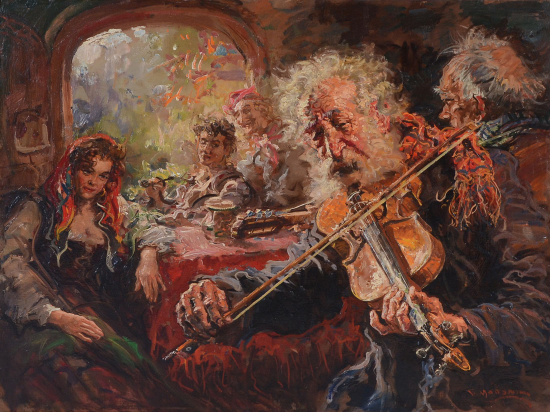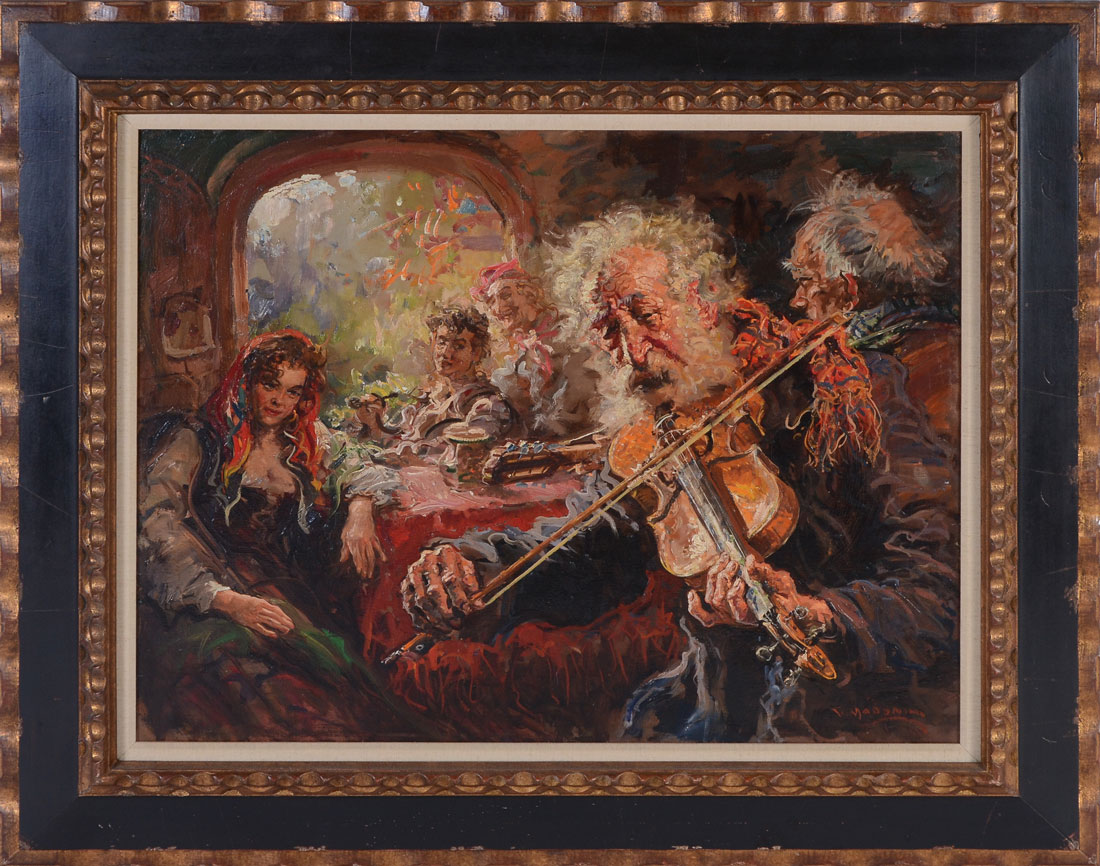 MADONINI, Giovanni, (Italian, 1915-1989): ''The Violinist'', pub scene with gypsies, Oil/Canvas, 26'' x 32'', signed, framed, 36'' x 42.5''.