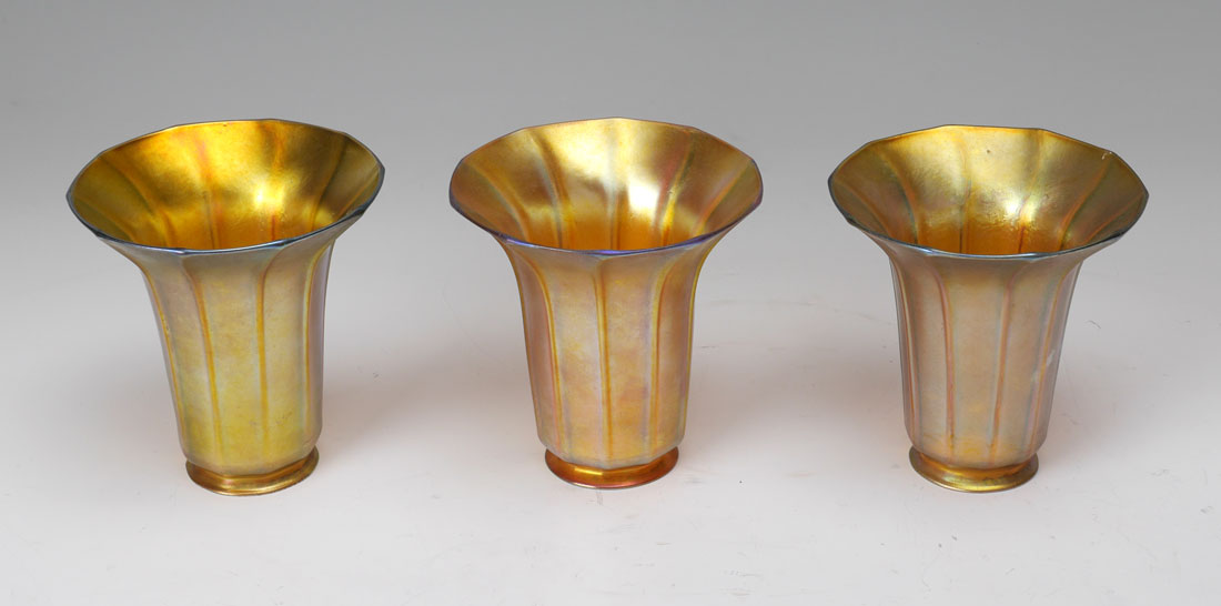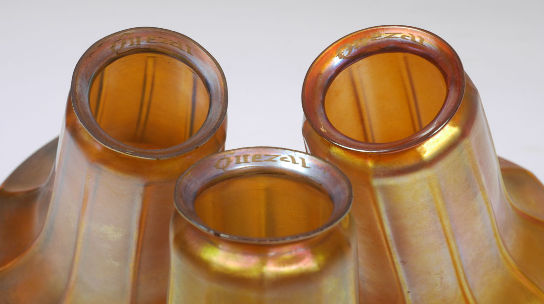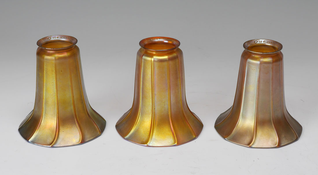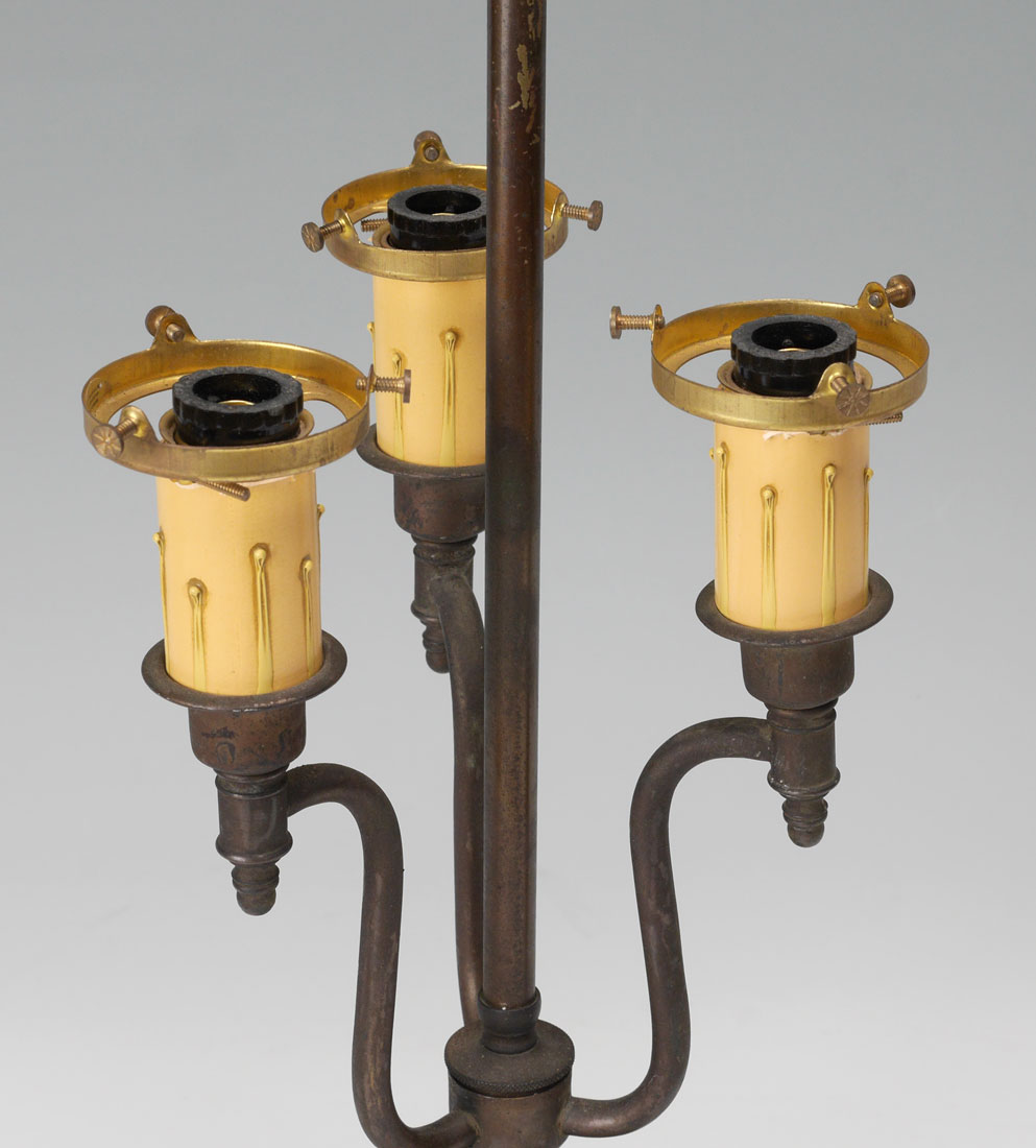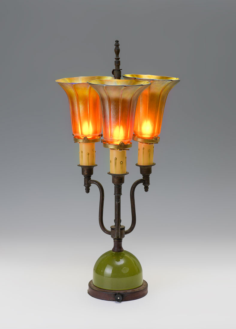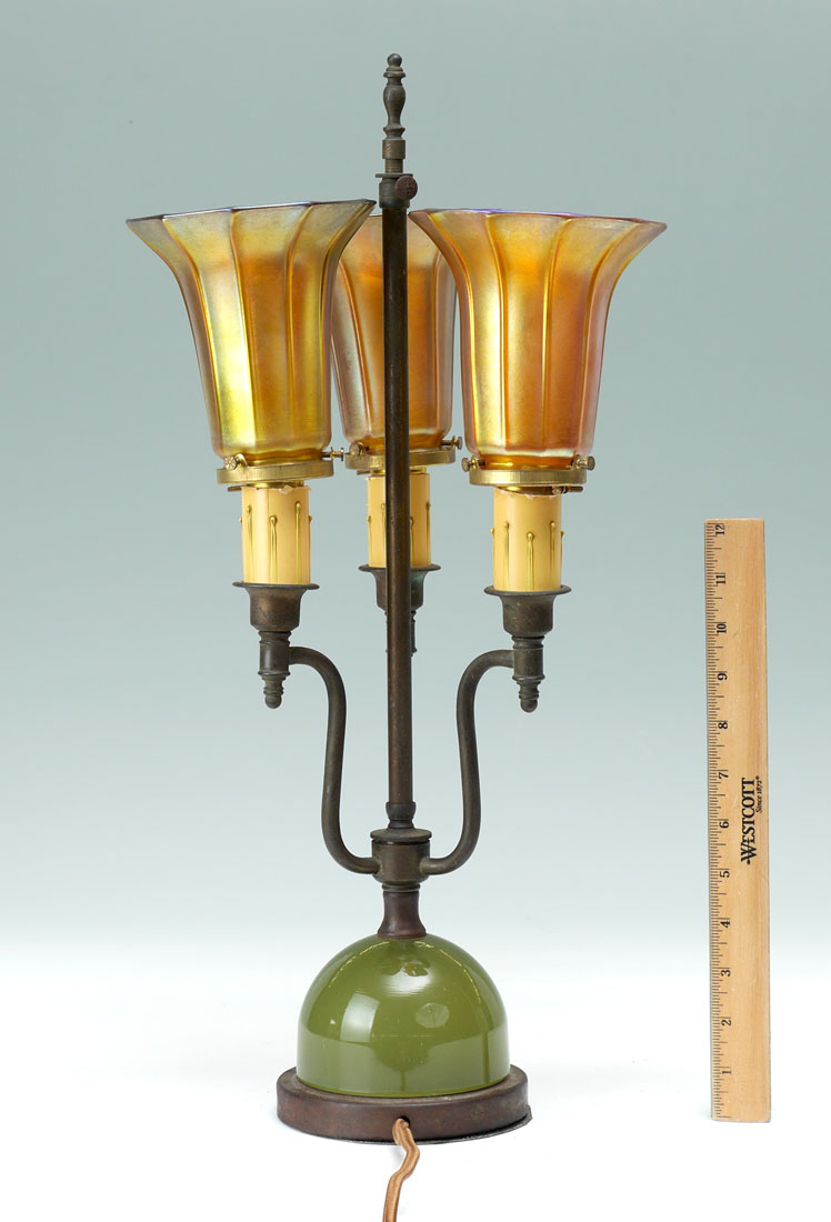3 IRIDESCENT QUEZAL SHADE LAMP: 3 arm patinated brass lamp with pea green domed glass at base, no visible marking, 21 1/2'' h. x 7 1/2''. 3 iridescent floriform shades marked Quezal on fitter rim, 5'' h. x 5'' dia., fitter rim 2 1/4''.