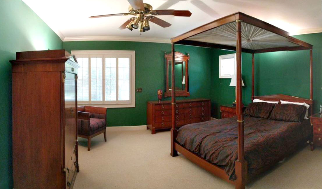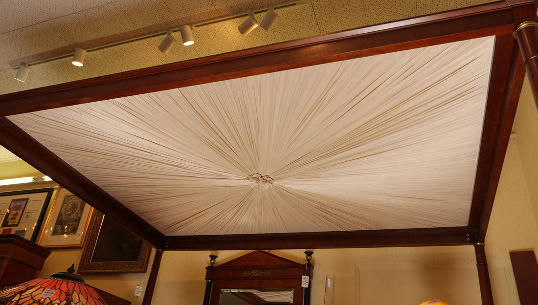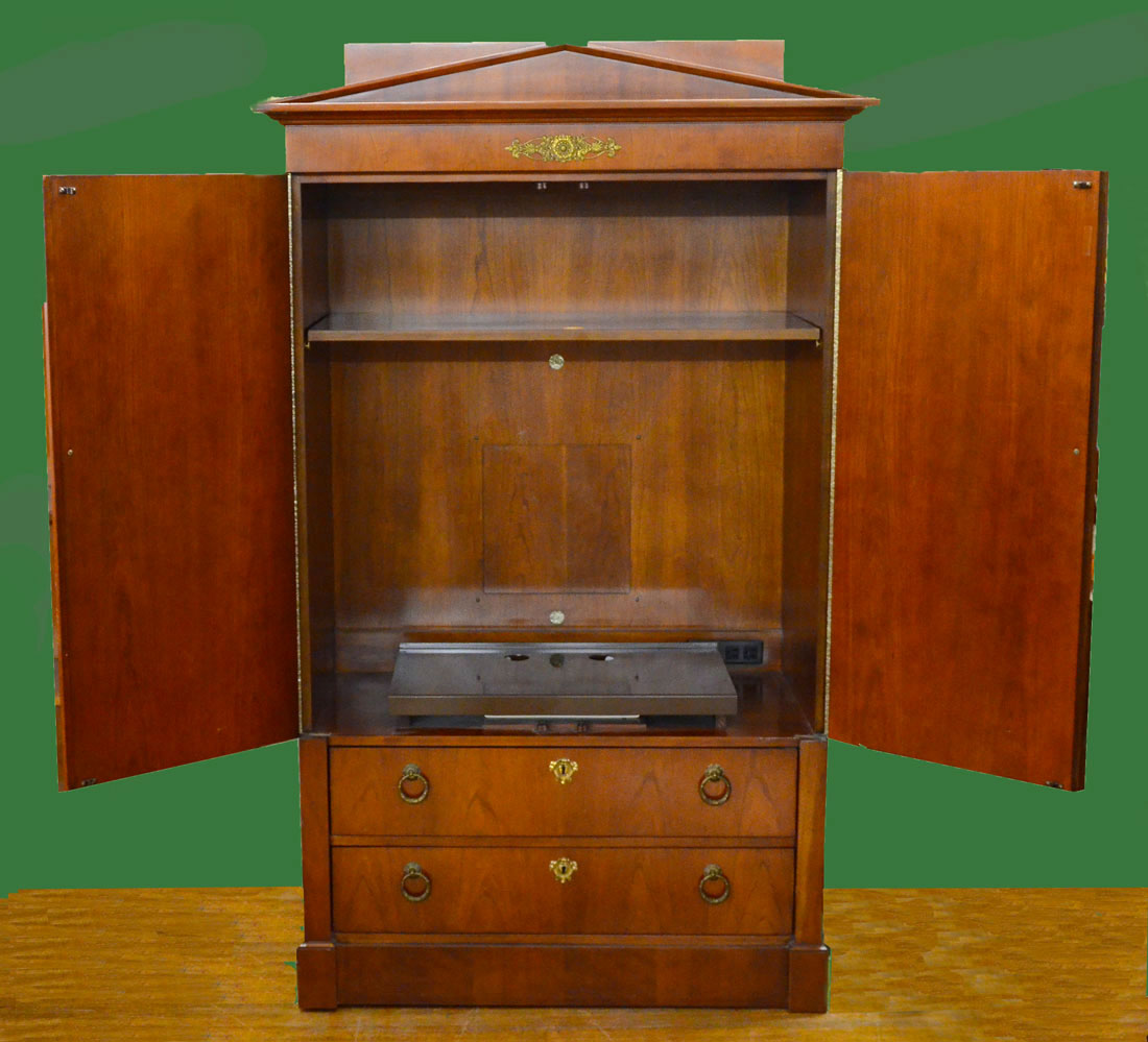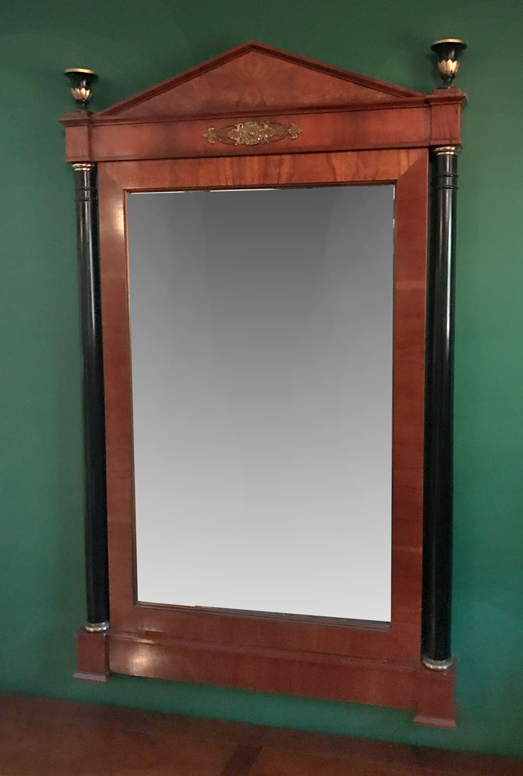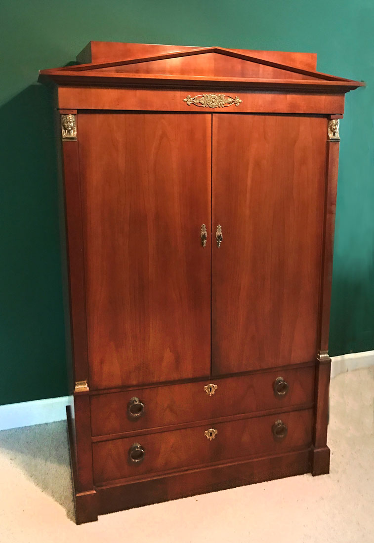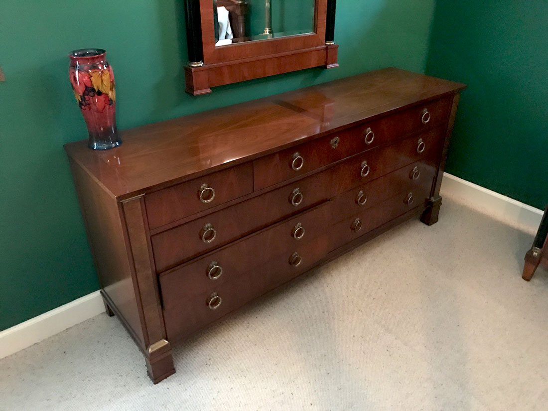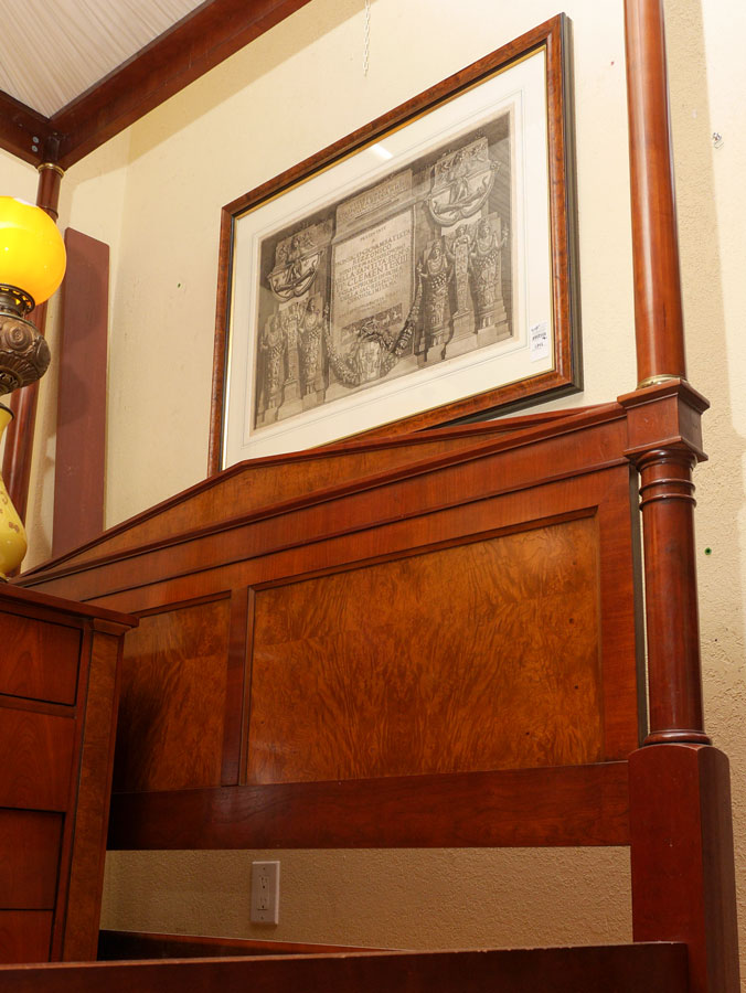 BAKER FURNITURE BIEDERMEIER BEDROOM SUITE: 4 pieces total in the Biedermeier style by Baker to include 1) 4 poster queen size canopy bed, cloth lined canopy, overall assembled measures 84 1/4'' h. x 88'' x 66''. 2) Entertainment armoire with 2 doors over 2 drawers, 67 1/2'' h. x 42 1/4'' x 23''. 3) Chest of 9 drawers, 3 drawers over 6 half length drawers, 23'' h. x 72'' x 19''. 4) Wall mirror with ebonized columns on frame, 52 1/2'' h. x 32'' x 2 1/2''.