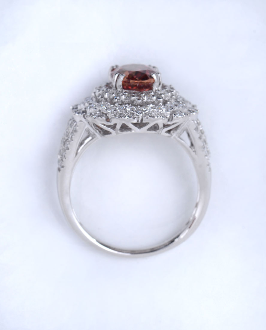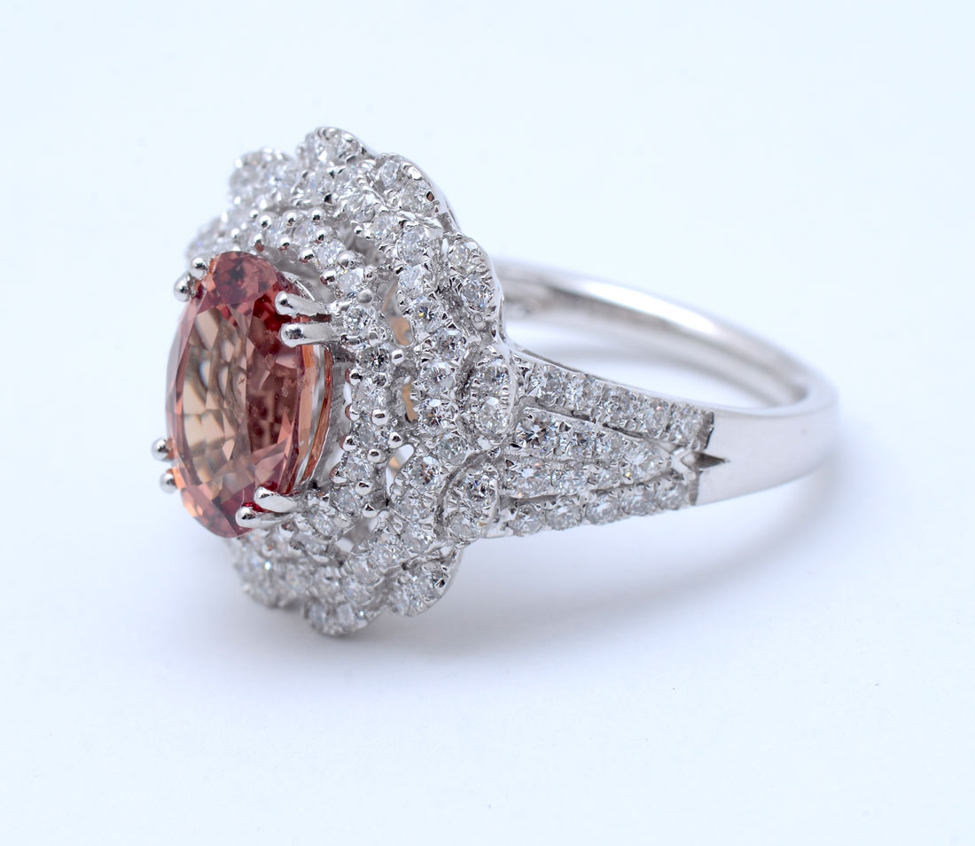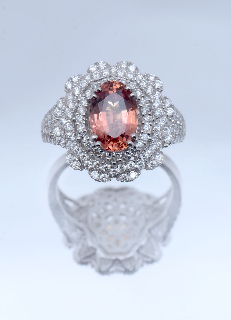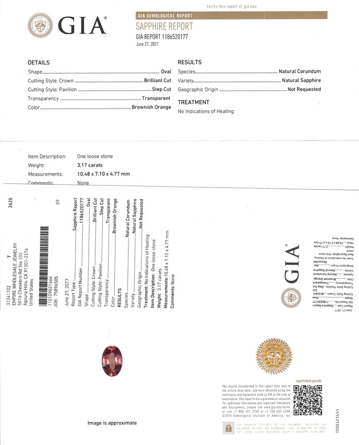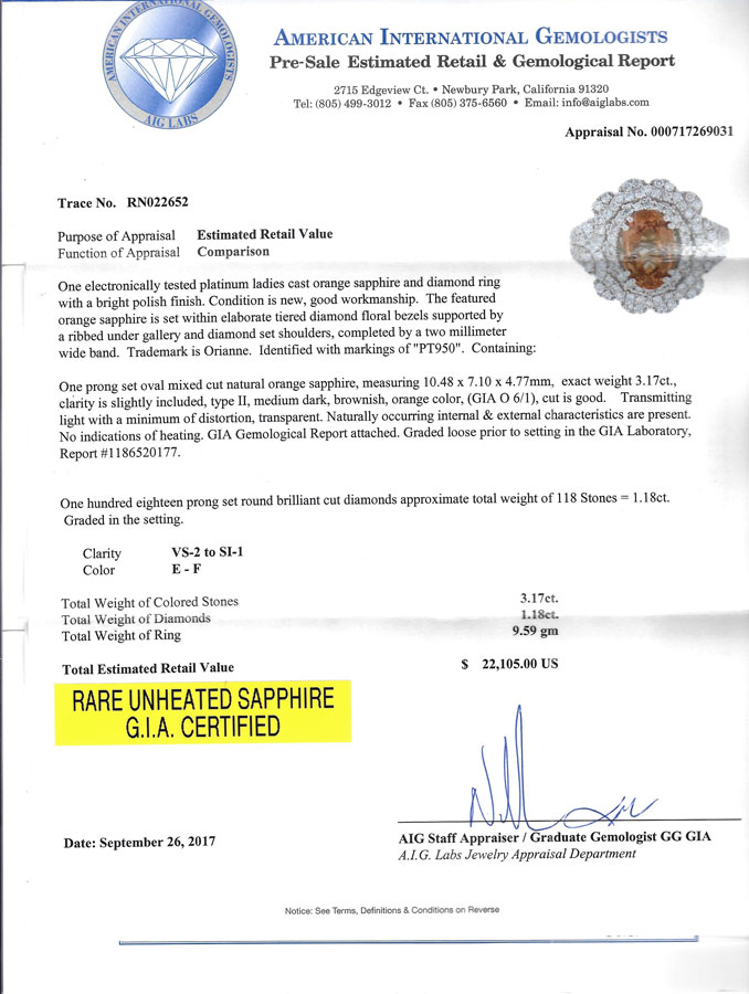 RARE NO HEAT 3.17CT MANDARIN SAPPHIRE & DIAMOND RING IN PLATINUM: Unique oval mixed cut natural brownish orange sapphire is nestled among 118 round brilliant cut diamonds. Sapphire is GIA certified to be no heat #1186520177. Diamond weight is 1.18CTW with VS2 clarity and E-F color. Total weight 9.59 grams. Size 7.5. Sold with current American International Gemologist graduates appraisal for $22,105.
