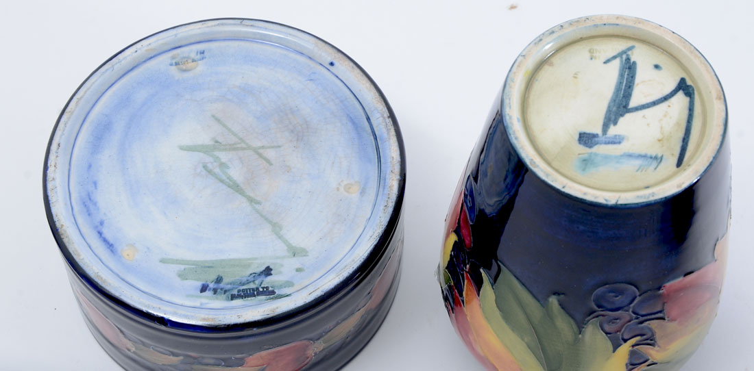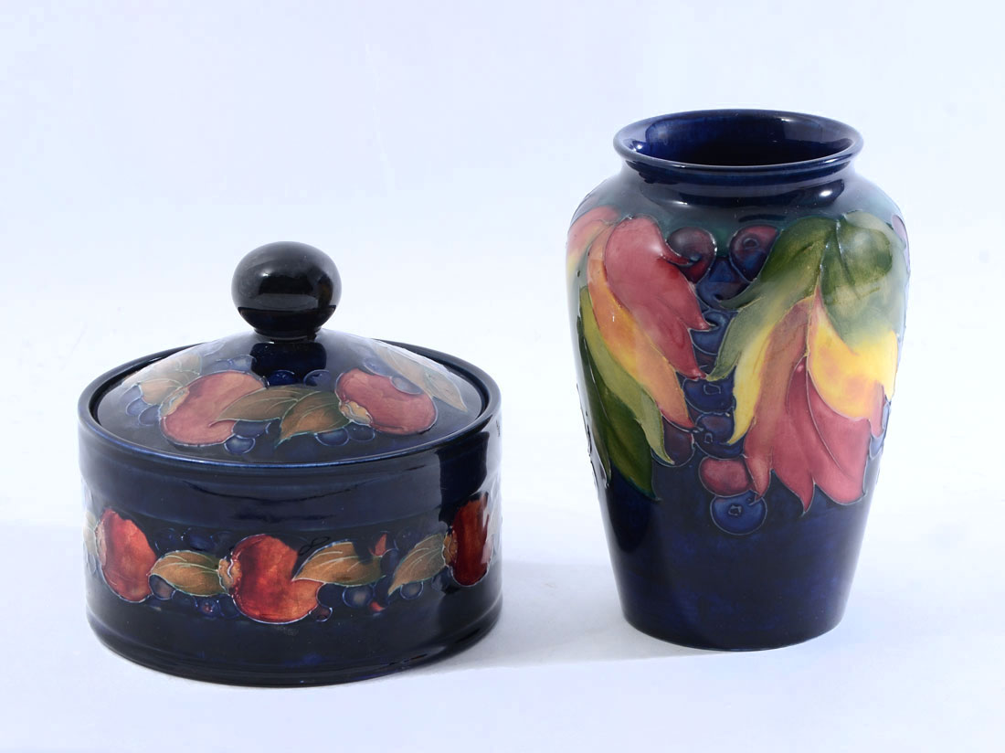 MOORCROFT POTTERY LIDDED JAR & VASE: 2 pieces total to include 1) Lidded round dresser jar, cobalt blue ground, pomegranate pattern, impressed and signature marks, overall 4 3/4'' h. x 5 1/4''. 2) Vase, cobalt blue ground, fruit and leaves motif, impressed and initial signature mark, 6'' h. x 4''.