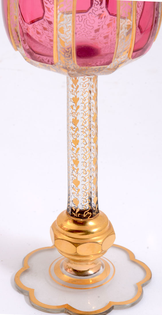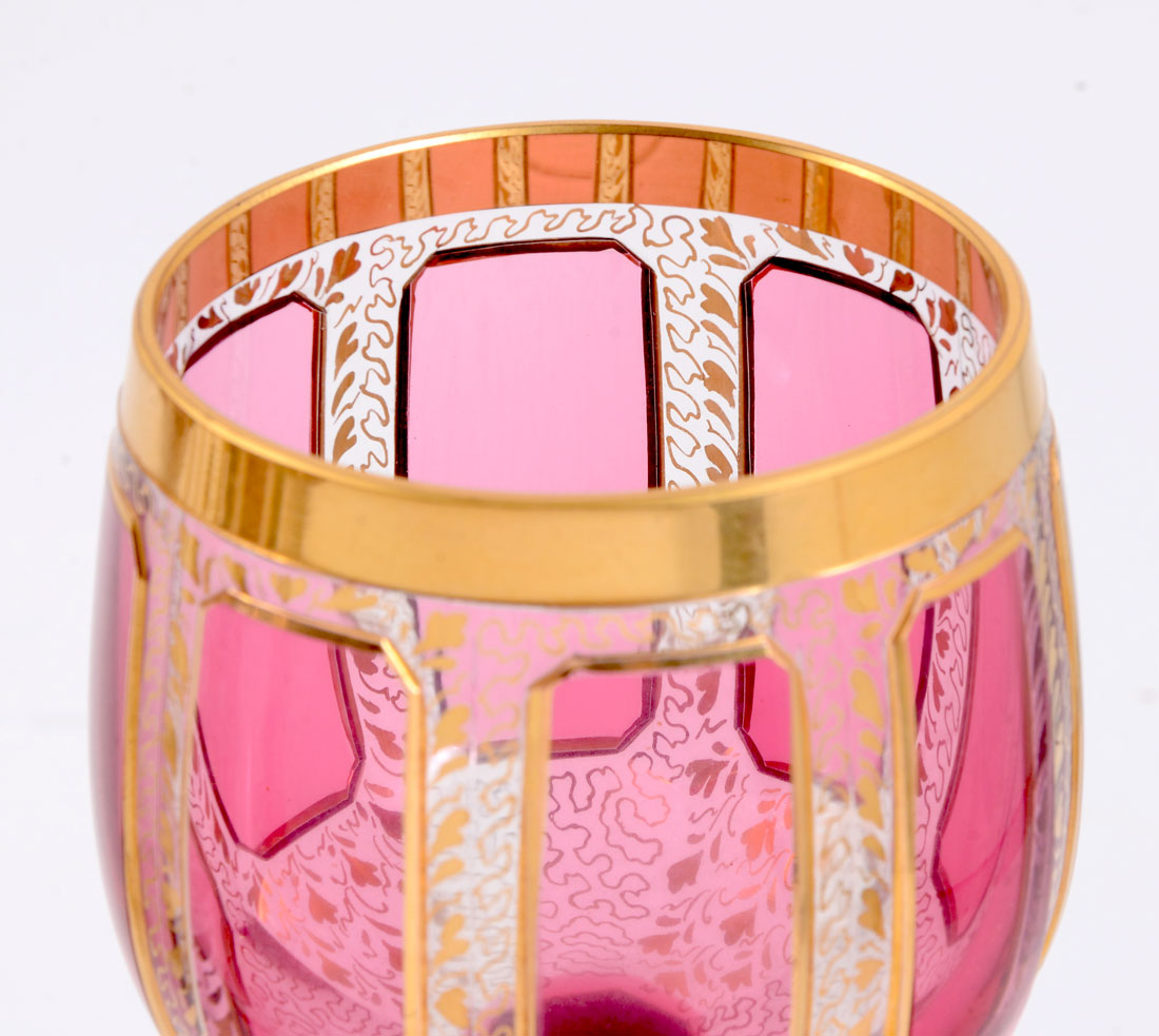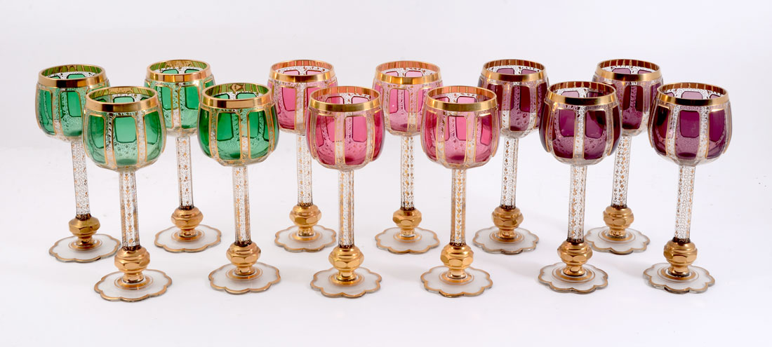 12 MOSER GILT DECORATED WINE STEMS: 4 of each color cabochons, amethyst, green, and ruby. Gold decorated with vines motifs, shaped foot, unmarked. Overall 8 1/8'' h. x 3''.