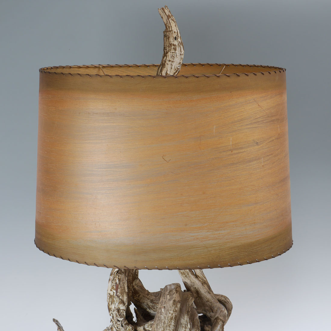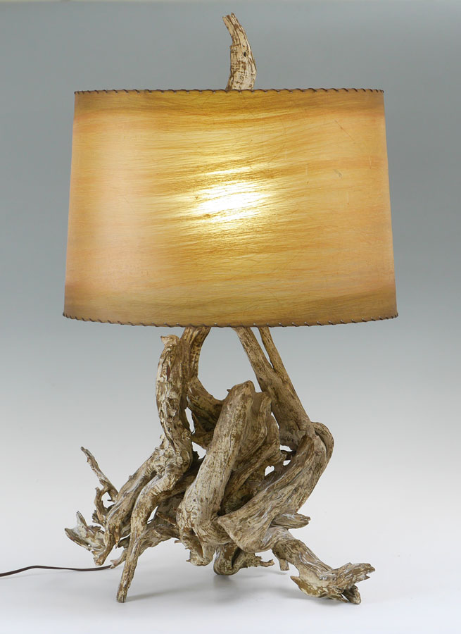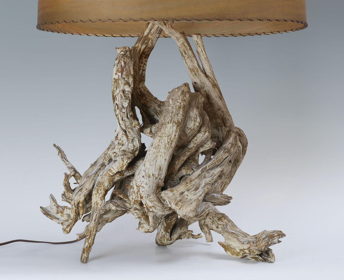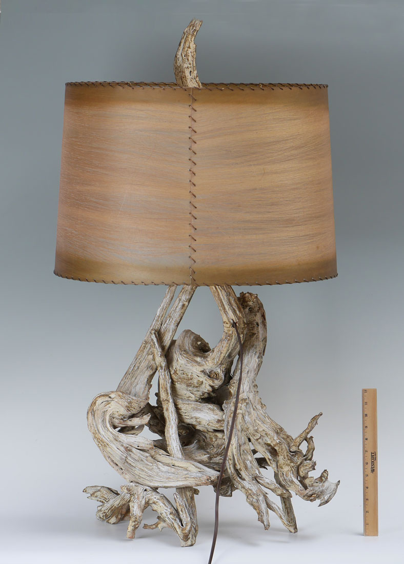LARGE MID CENTURY DRIFTWOOD TABLE LAMP: Circa 1950's-1960's, driftwood lamp with paint accents, single socket fixture, overall 43'' h. to top of driftwood finial x 23 1/2'' x 12''. Sold with original oval whip-stitch shade, 16'' h. x 22'' x 12''