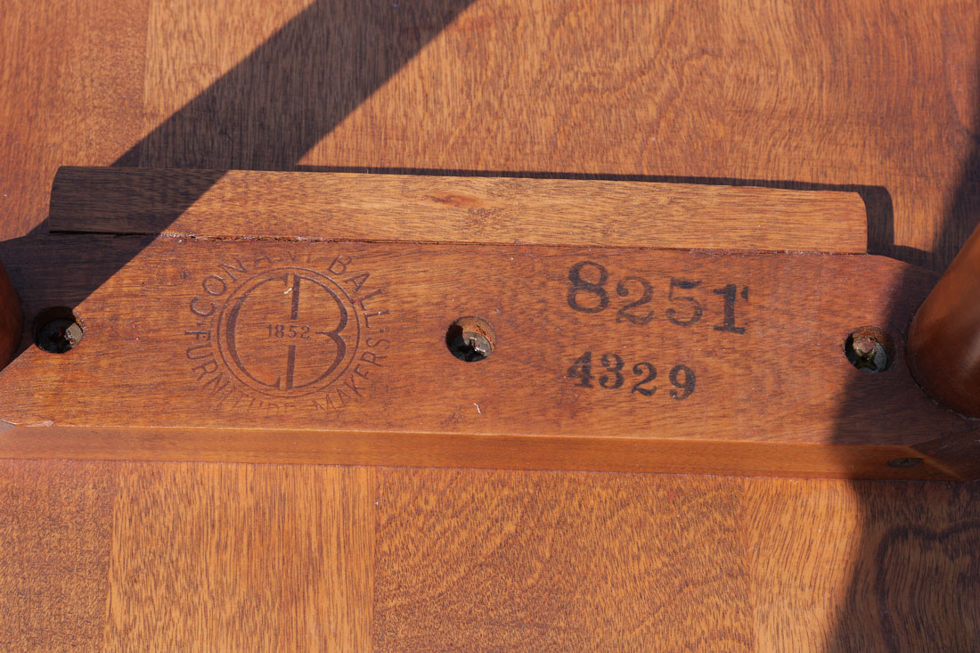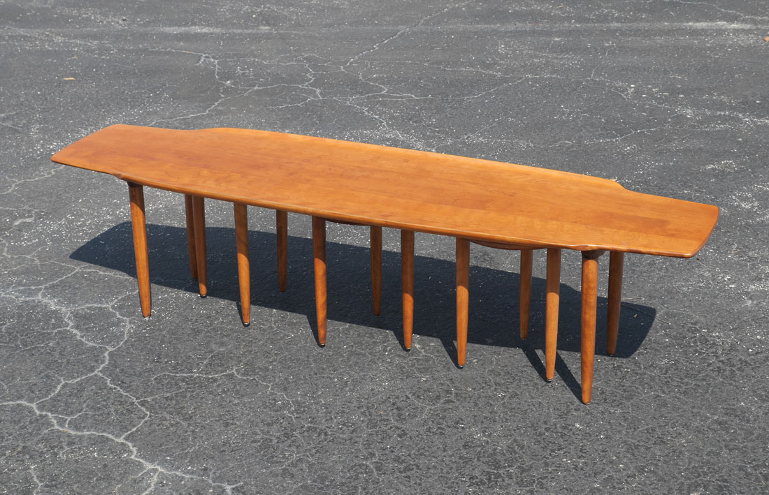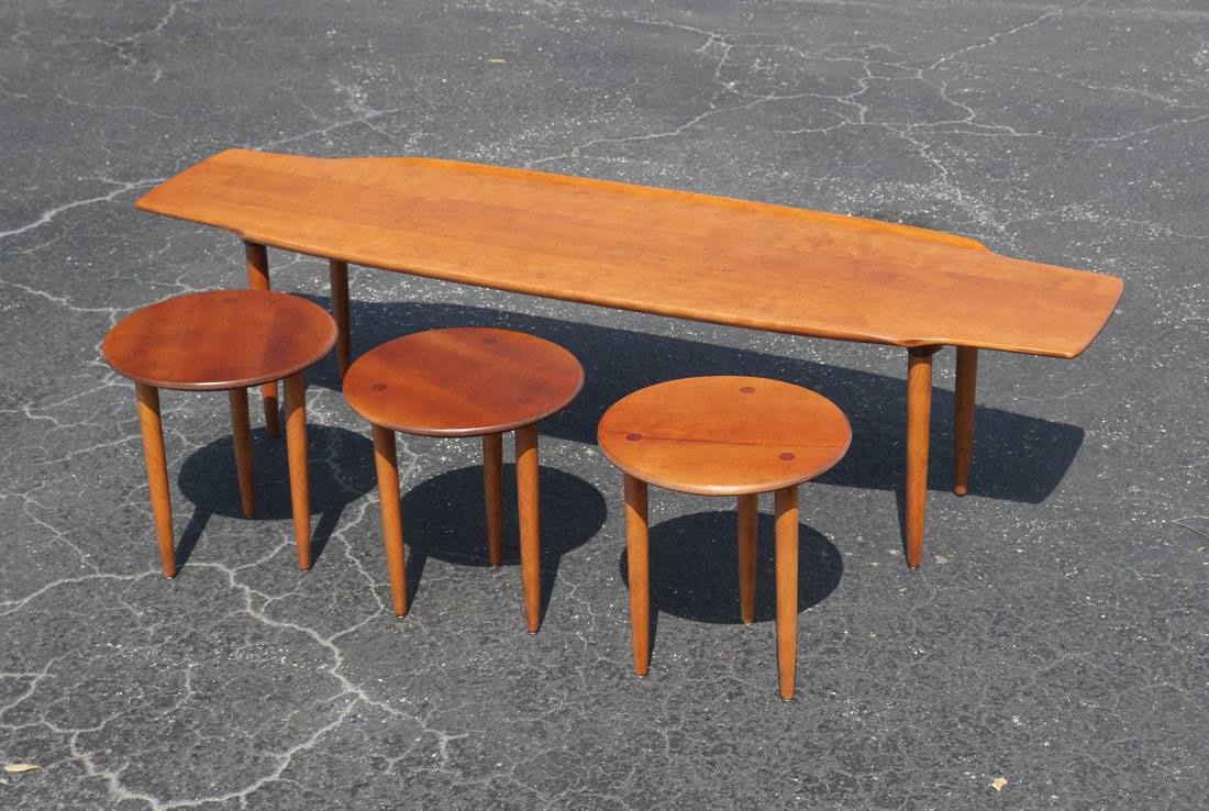CONANT BALL SURFBOARD COFFEE TABLE AND 3 STOOLS: Stylized teak surfboard design by Russel Wright for Conant Ball with a nest of 3 stools held in by cleats underneath. Top with concave sides, shaped ends, tapered feet, impressed mark. Measures 16'' h. x 64'' x 18'', each stool 15'' h. x 13 1/2''.