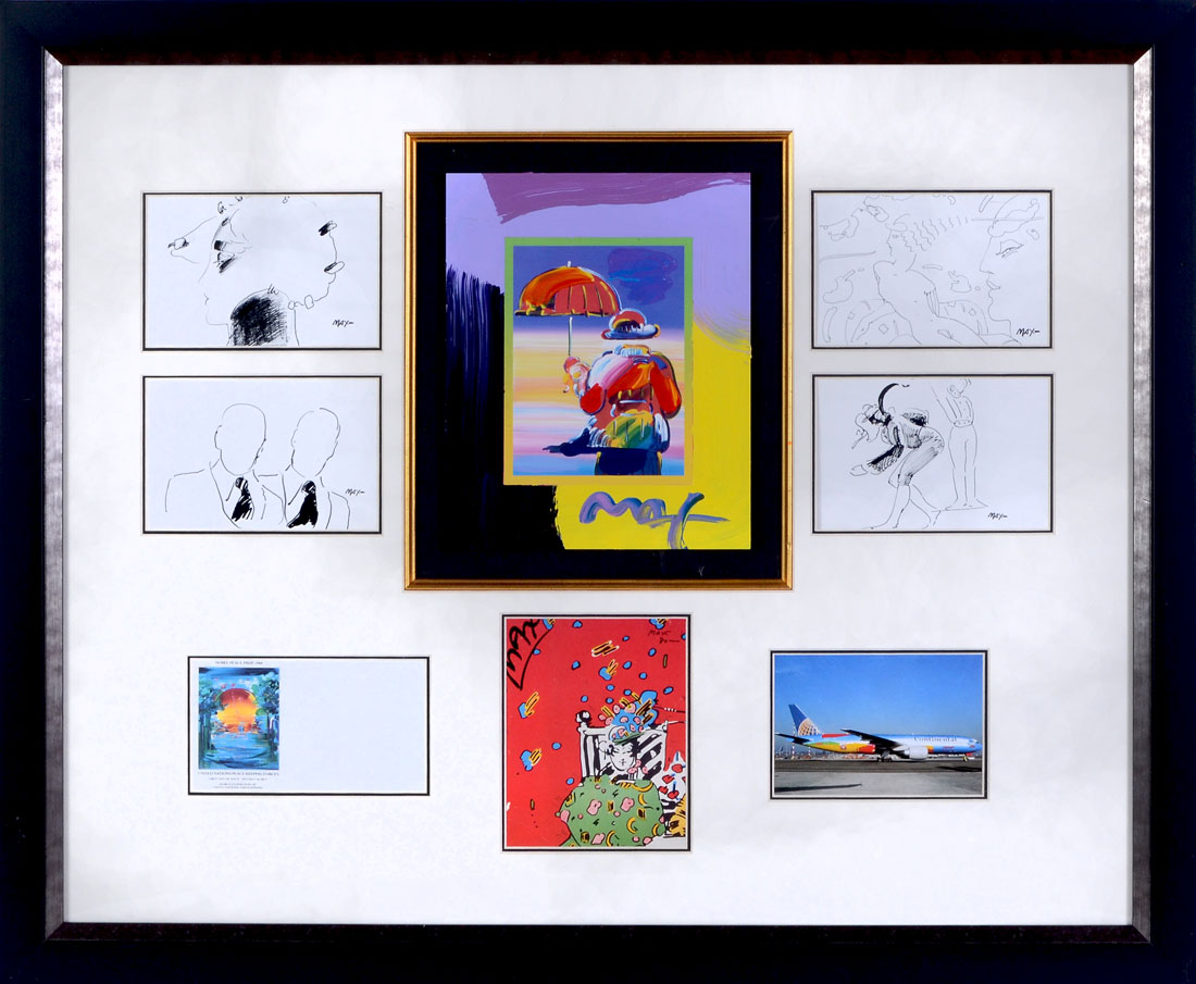 MAX, Peter, (American, 1937): ''Umbrella Man on Blends Collage with Memorabilia'', Mixed Media, sight size is 10'' x 8'', signed in lower right paint, framed, 26.5'' x 31.75''.