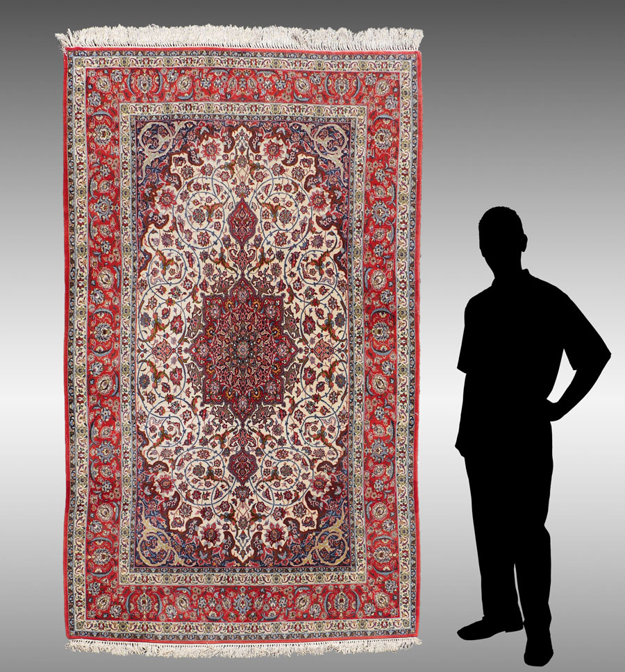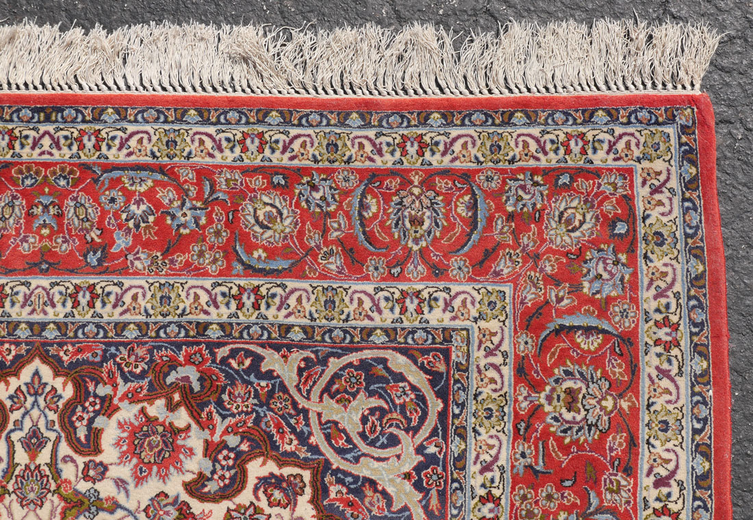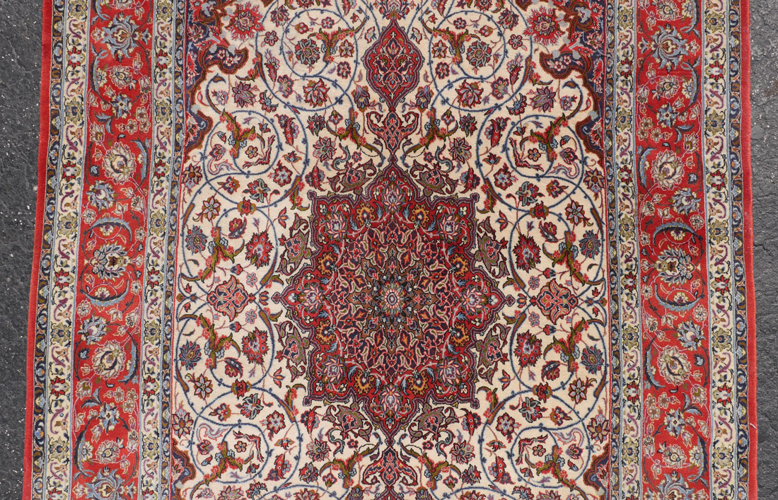 APPROX 20-40 YR OLD PERSIAN NAIN QUALITY HAND KNOTTED WOOL AND SILK RUG, 4'11'' X 7'7'': This beautifully made rug has a central medallion that look like a stained glass ''rose window'' with its intricate design of circles and stars within more circles and stars woven with rich dark colors. The medallion stands out on the white ground of the field. The dark matching spandrels and corners of the field also complement the design of the medallion. The flowers and leaves on the rest of the field are connected by blue/black vines that form looping circles all around the rug. The guard borders and the red ground main border completes this excellent rug.