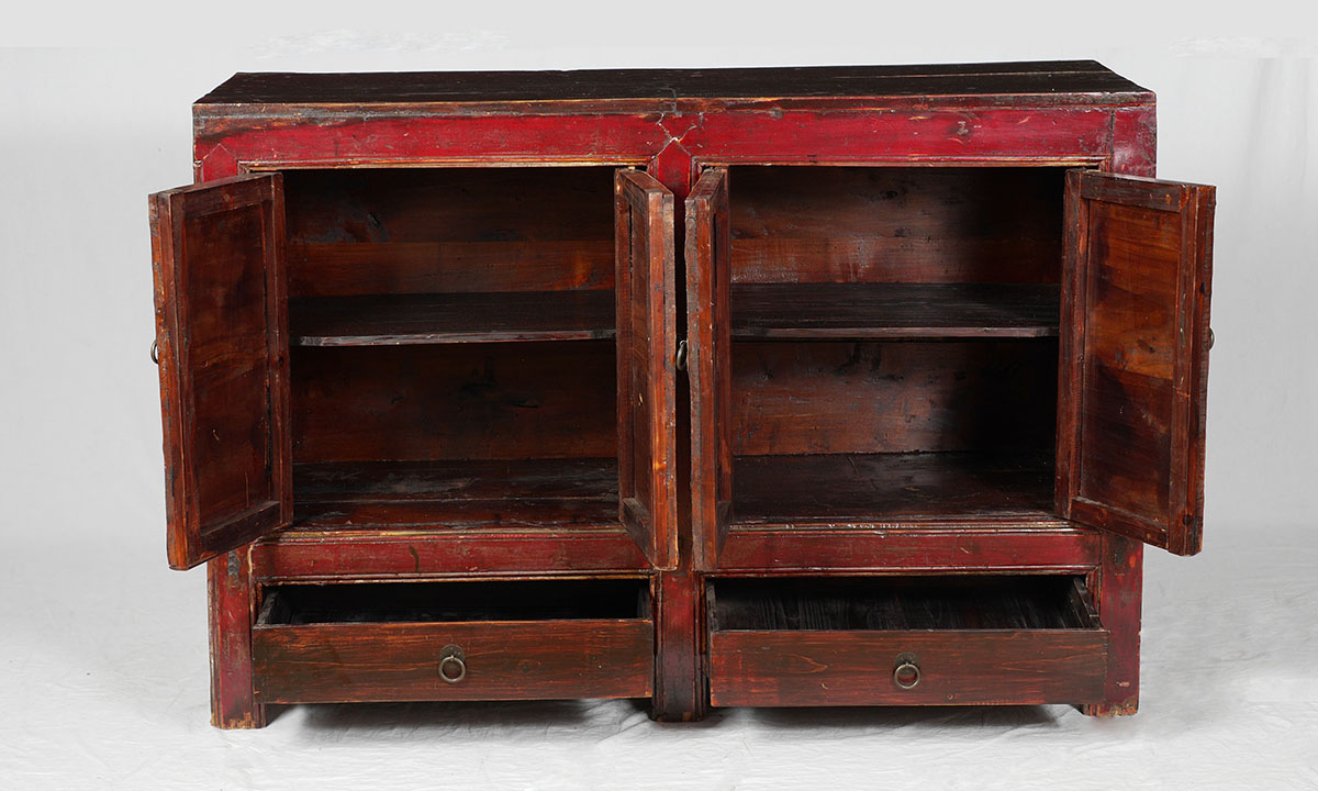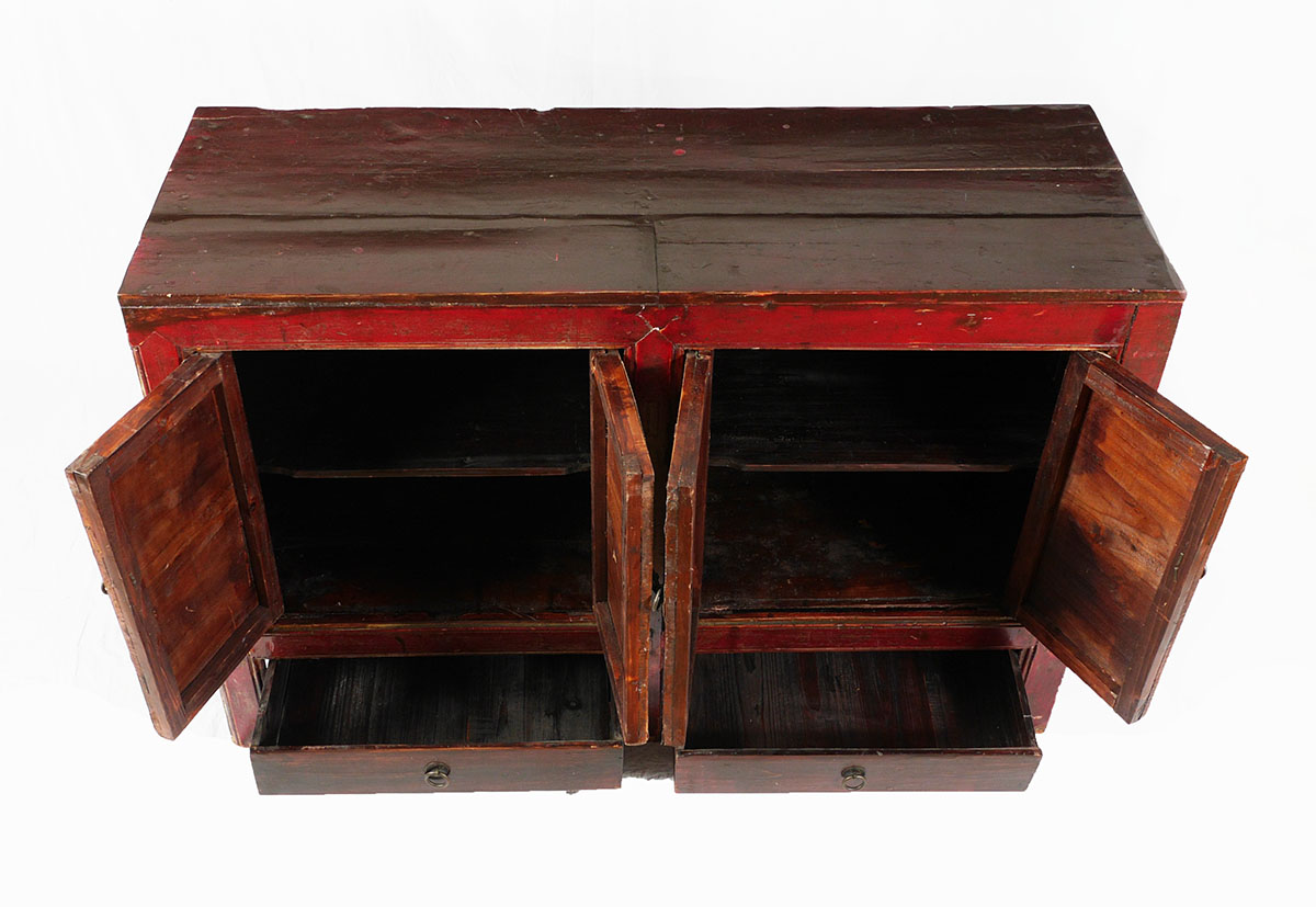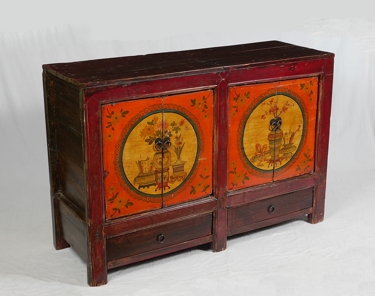 CHINESE PAINT DECORATED 4 DOOR CABINET: Most likely 19th century, red lacquer case, through tenon and peg construction, 4 painted decorated doors with interior genre scene motifs over 2 drawers, 4 legs. Overall measures 37 1/2'' h. x 55'' x 20''.