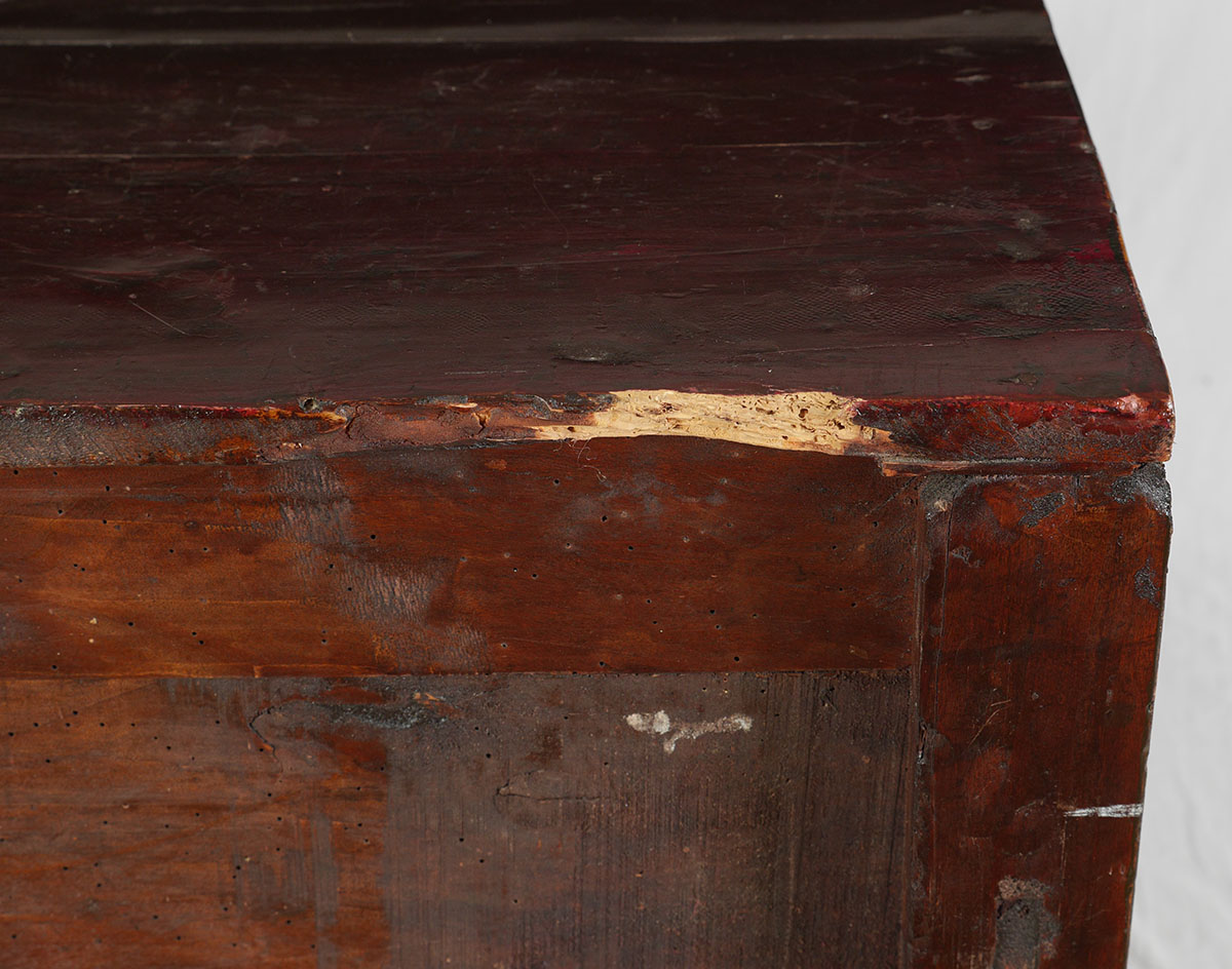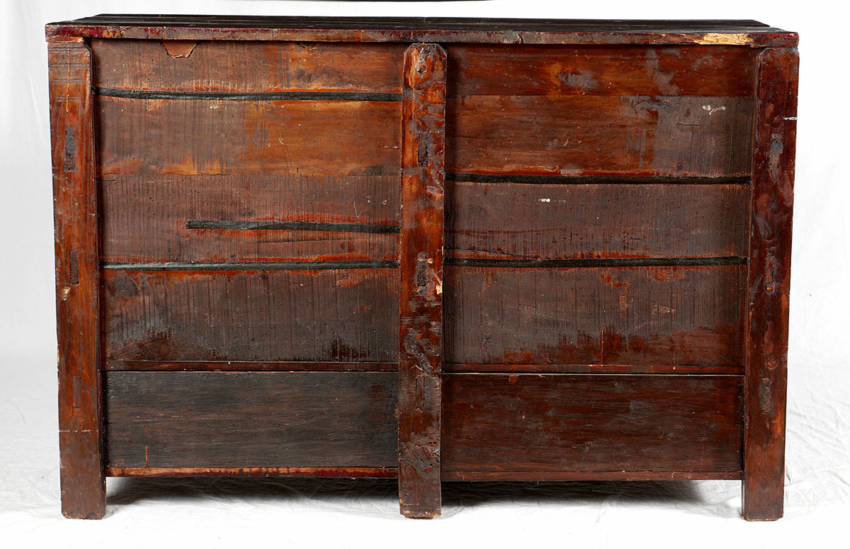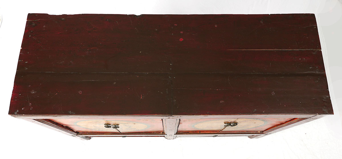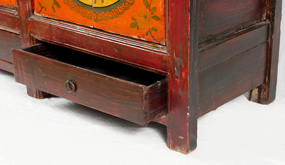 CHINESE PAINT DECORATED 4 DOOR CABINET: Most likely 19th century, red lacquer case, through tenon and peg construction, 4 painted decorated doors with interior genre scene motifs over 2 drawers, 4 legs. Overall measures 37 1/2'' h. x 55'' x 20''.