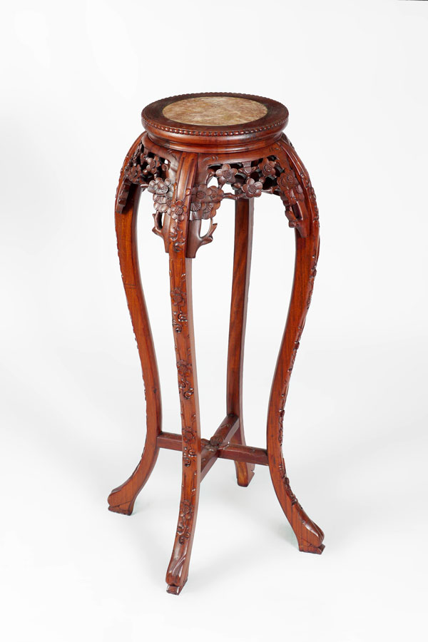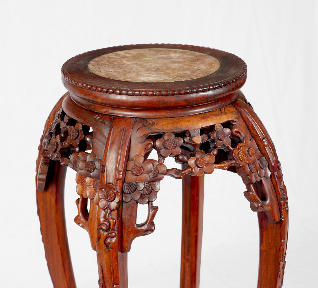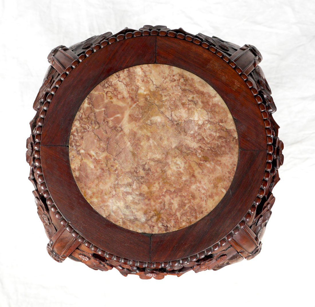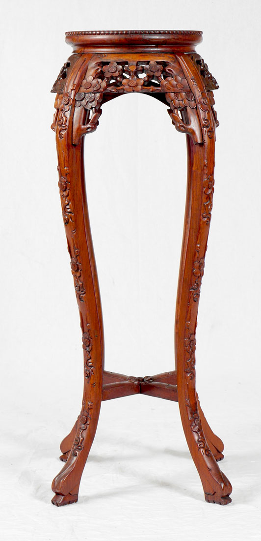 ORIENTAL CARVED MARBLE TOP PLANT STAND: Round inset marble top, pierced carved and shaped floral motif skirt, carved and shaped legs, overall 36'' h. x 10 1/2'' top dia., 19'' base dia.
