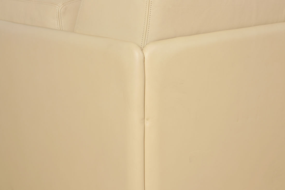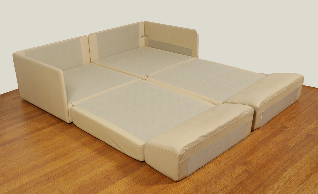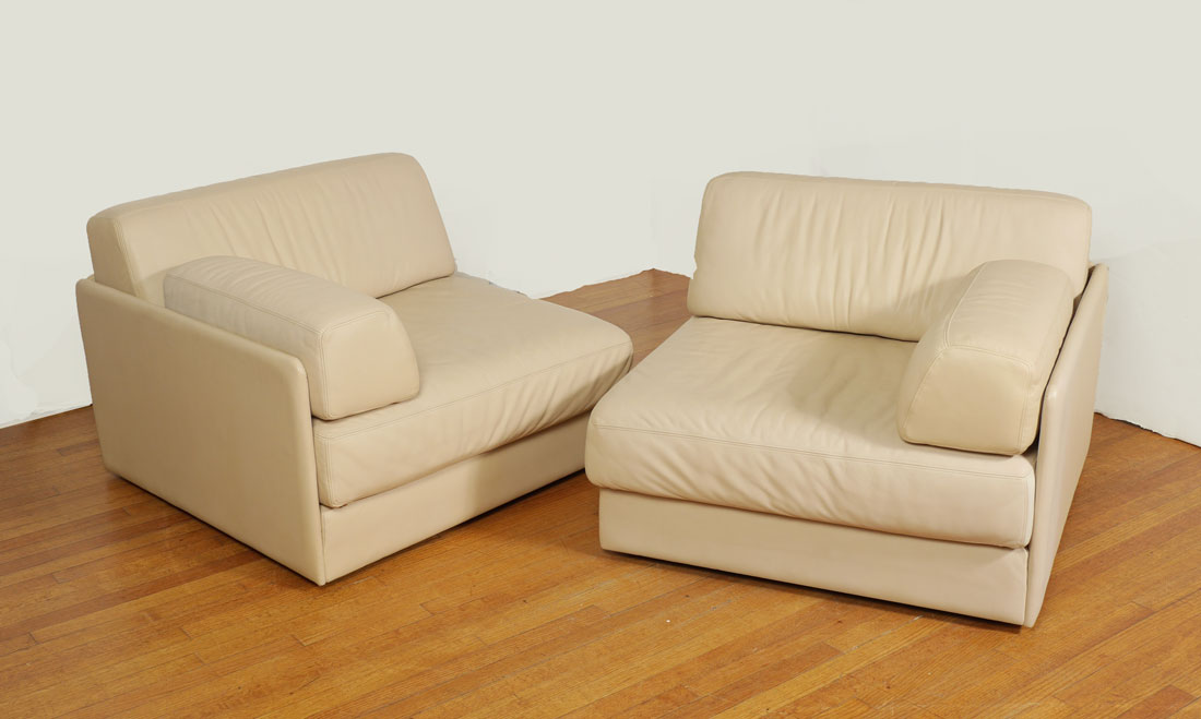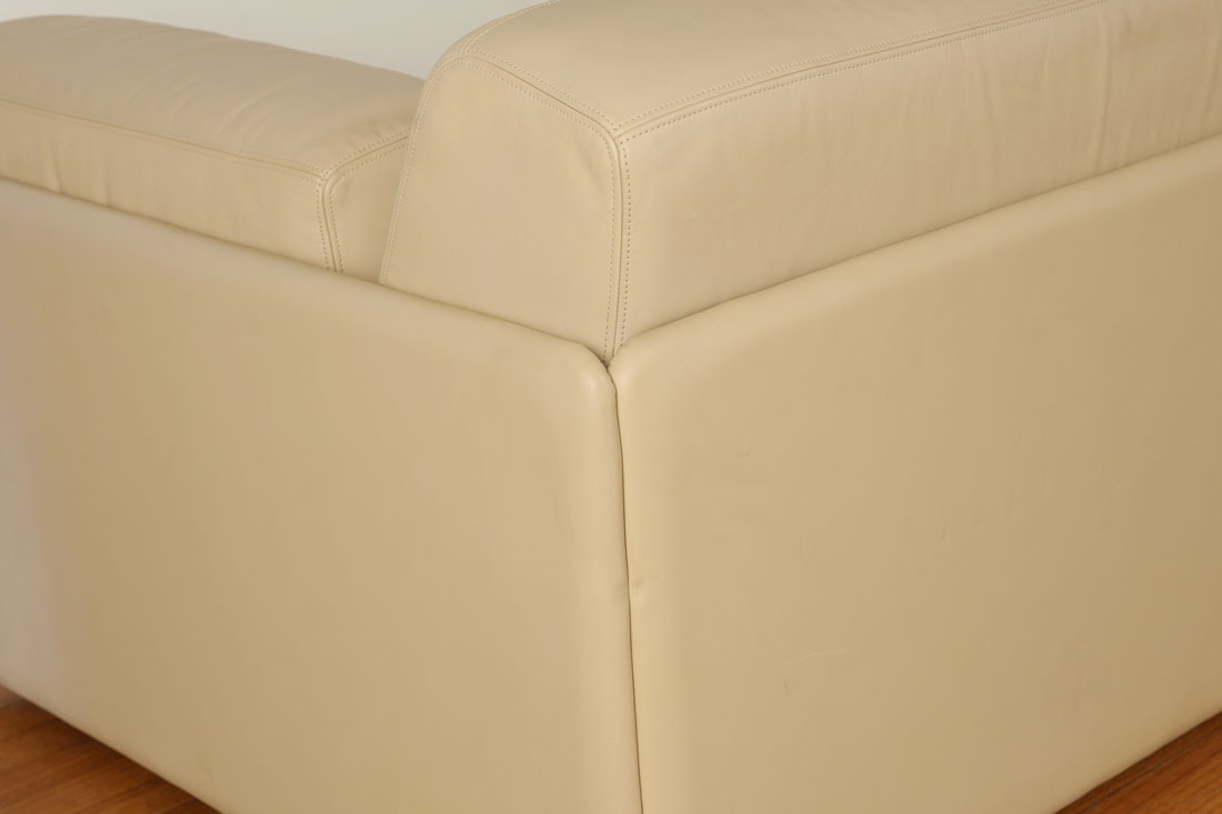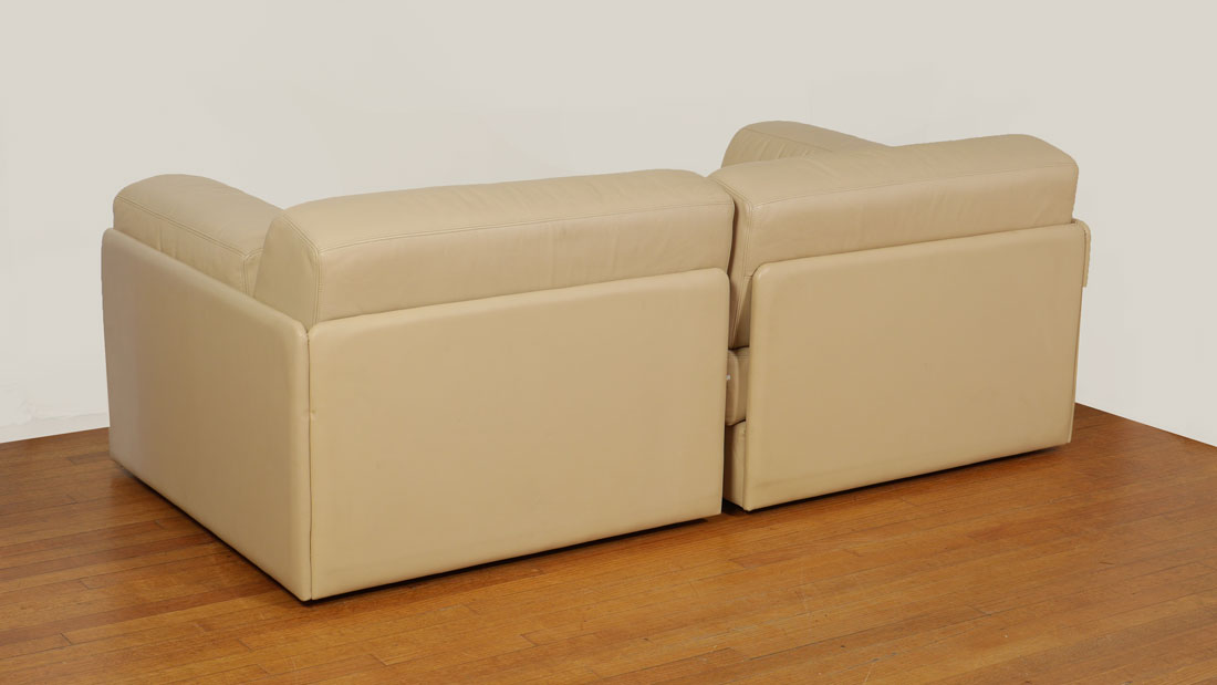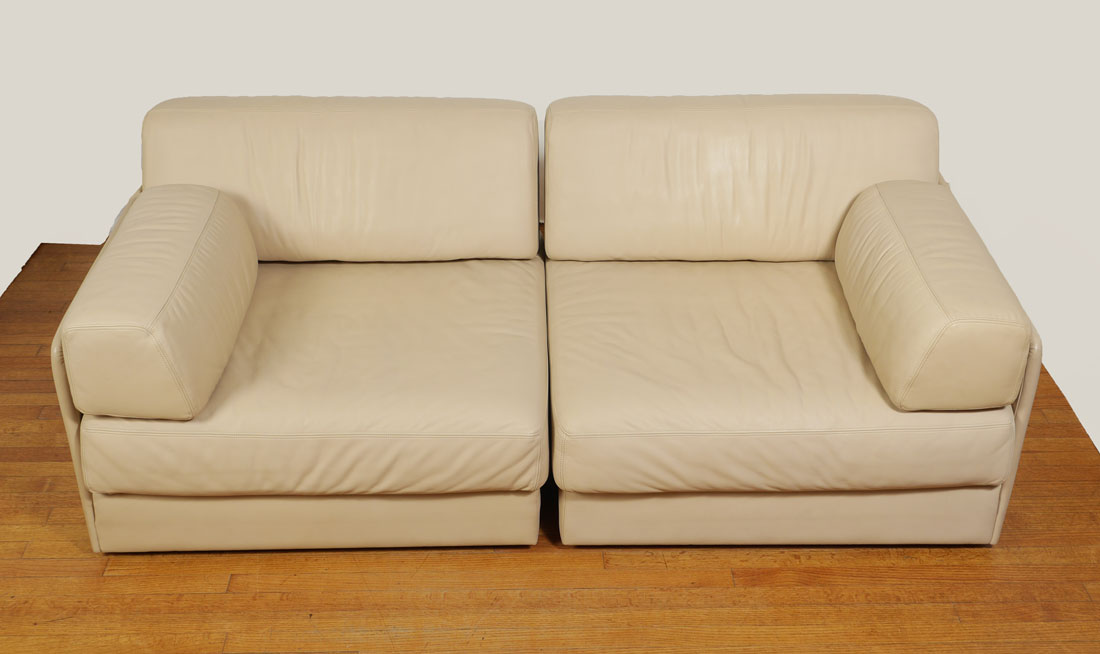 DE SEDE 2 PIECE CONVERTIBLE SECTIONAL LOVESEAT: Cream leather upholstered sectional loveseat in 2 parts, each section unfolds and convert to bed. Embossed marking on sides. Each module measures 28'' h. x 37'' x 37''.