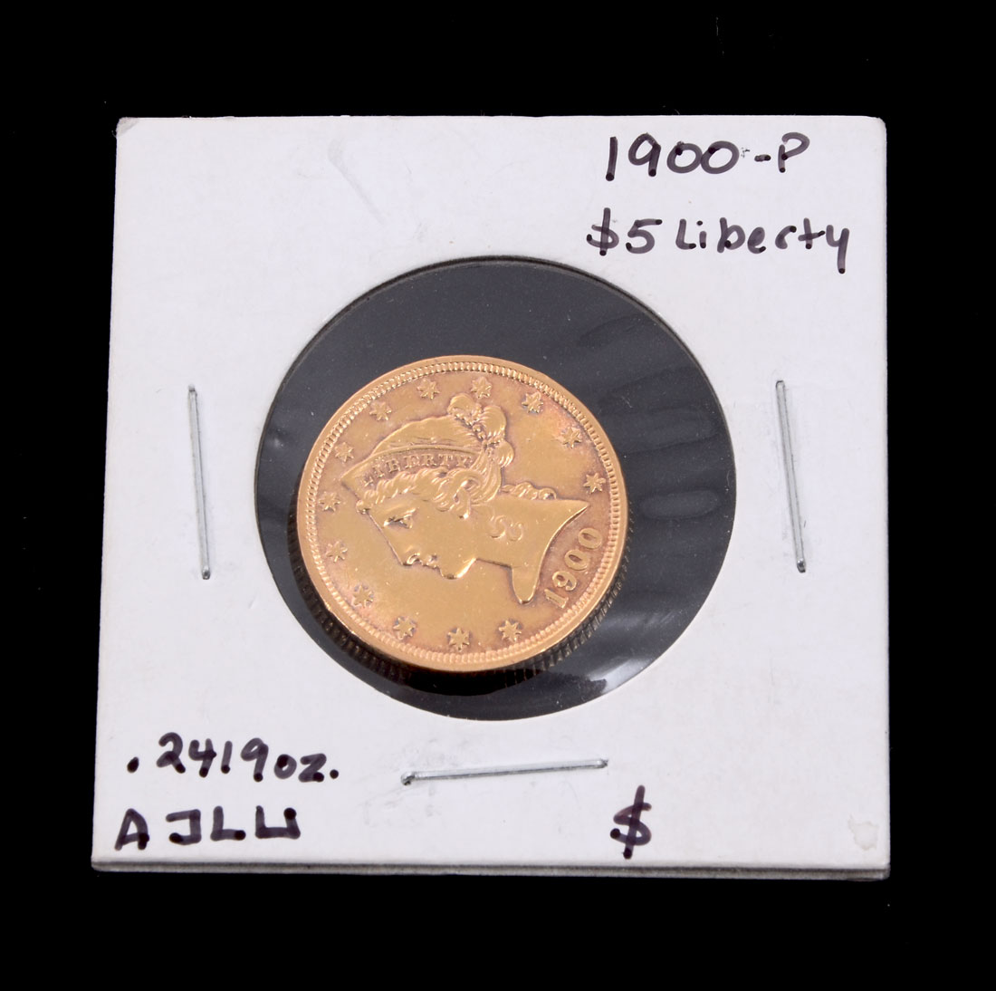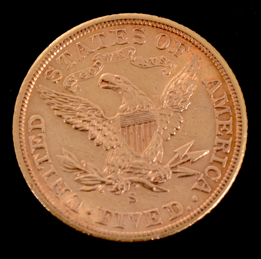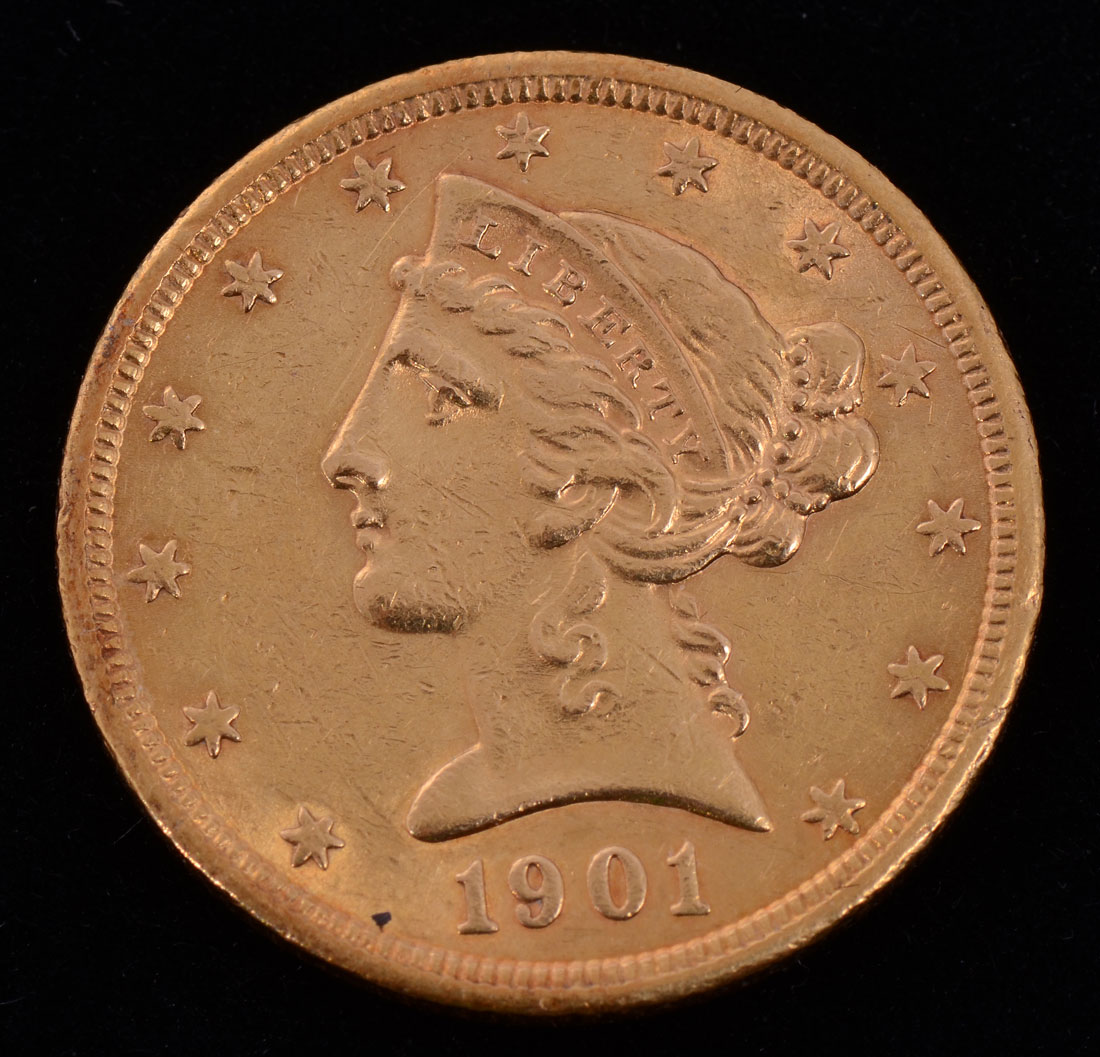 1901-S US $5 GOLD LIBERTY HEAD COIN: Ungraded, approx. 8.36 grams