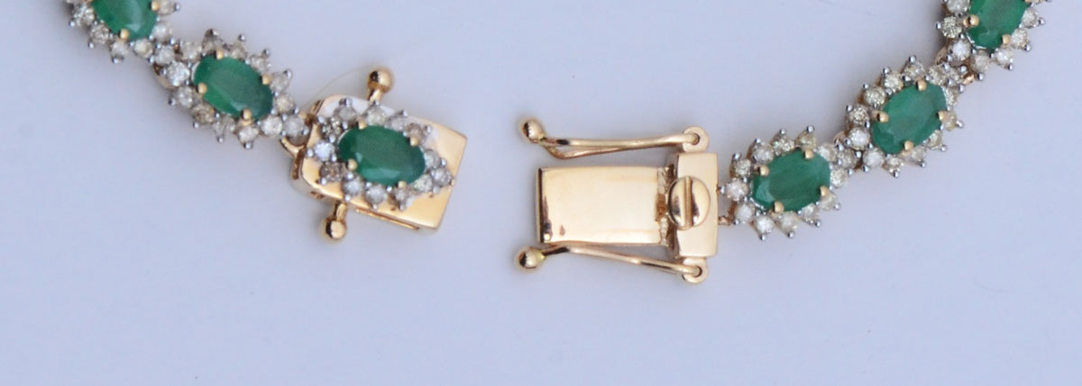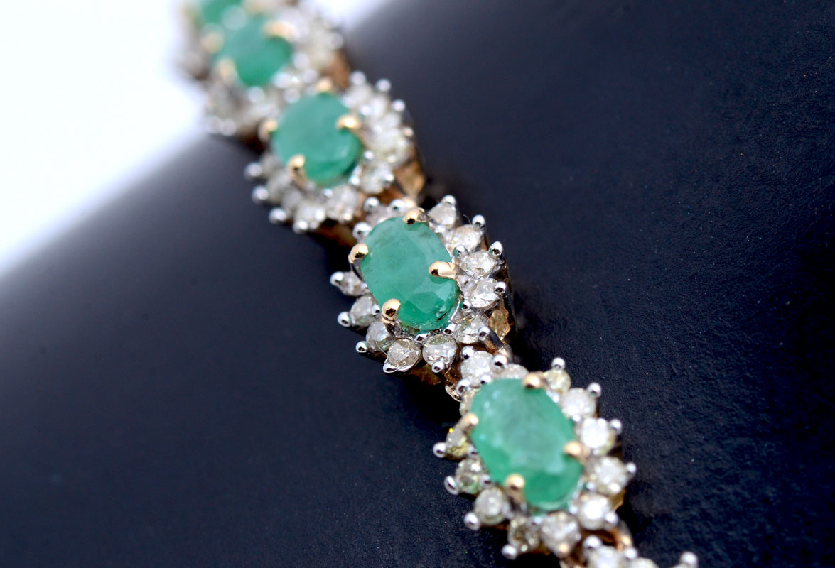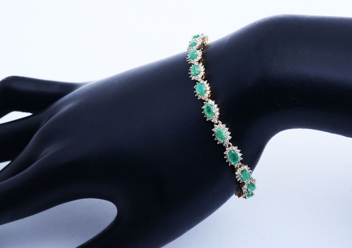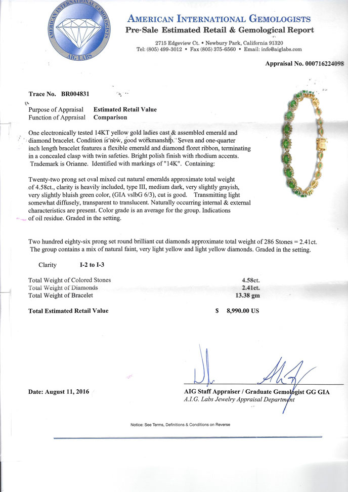 14K 4.58CT EMERALD AND DIAMOND BRACELET: 14K yellow gold plays a supporting role in this bracelet adorned with emeralds and diamonds. 22 prong set oval mixed cut natural diamonds are individually accented by 286 round brilliant cut diamonds in florets. Emeralds are approx 4.58CT and are heavily included. 2.41CT in diamonds are approx 2.41CTW. Bracelet is 7'' length. Total weight 13.38 grams. Sold with AIGL appraisal which reflects $8990 as their opinion of replacement value for this bracelet. Sold with AIGL appraisal which reflects $8990 as their opinion of replacement value for these earrings.