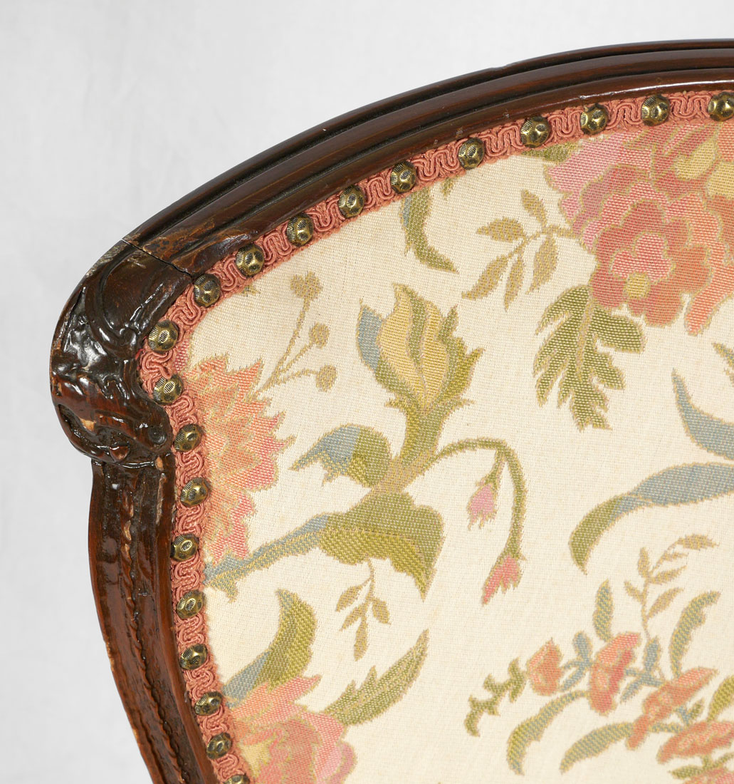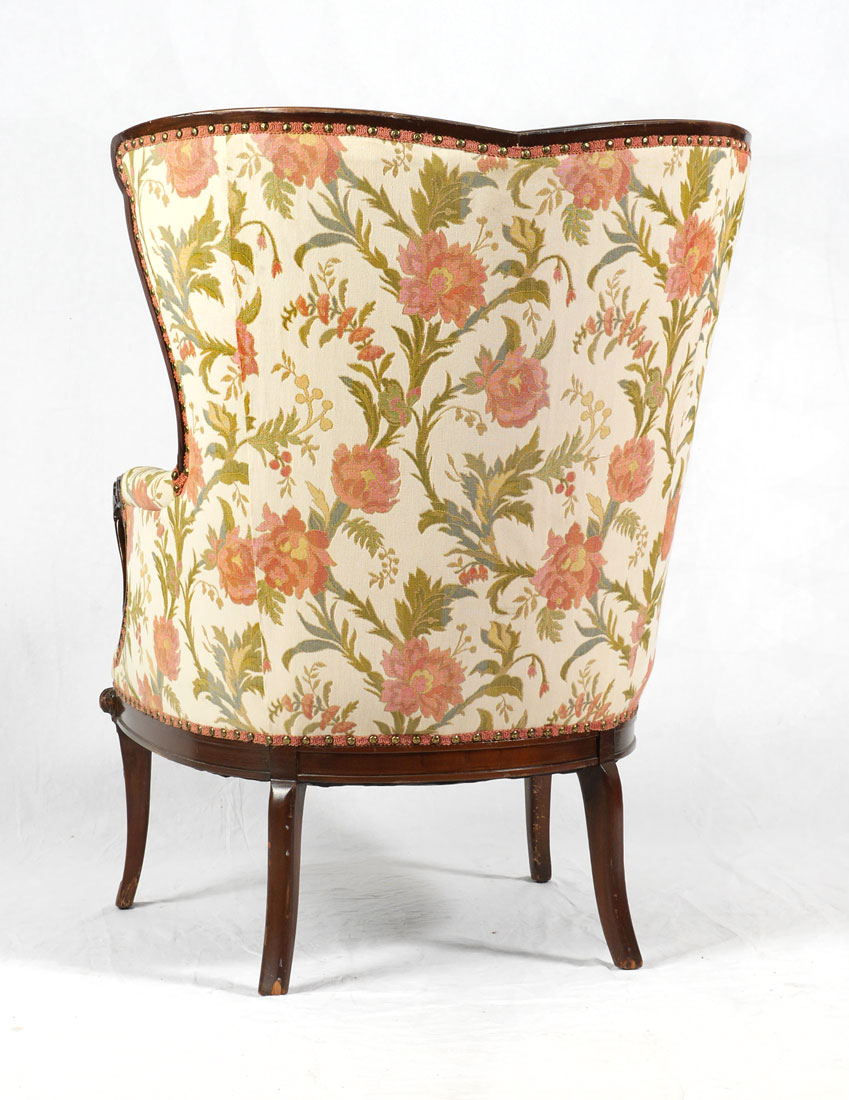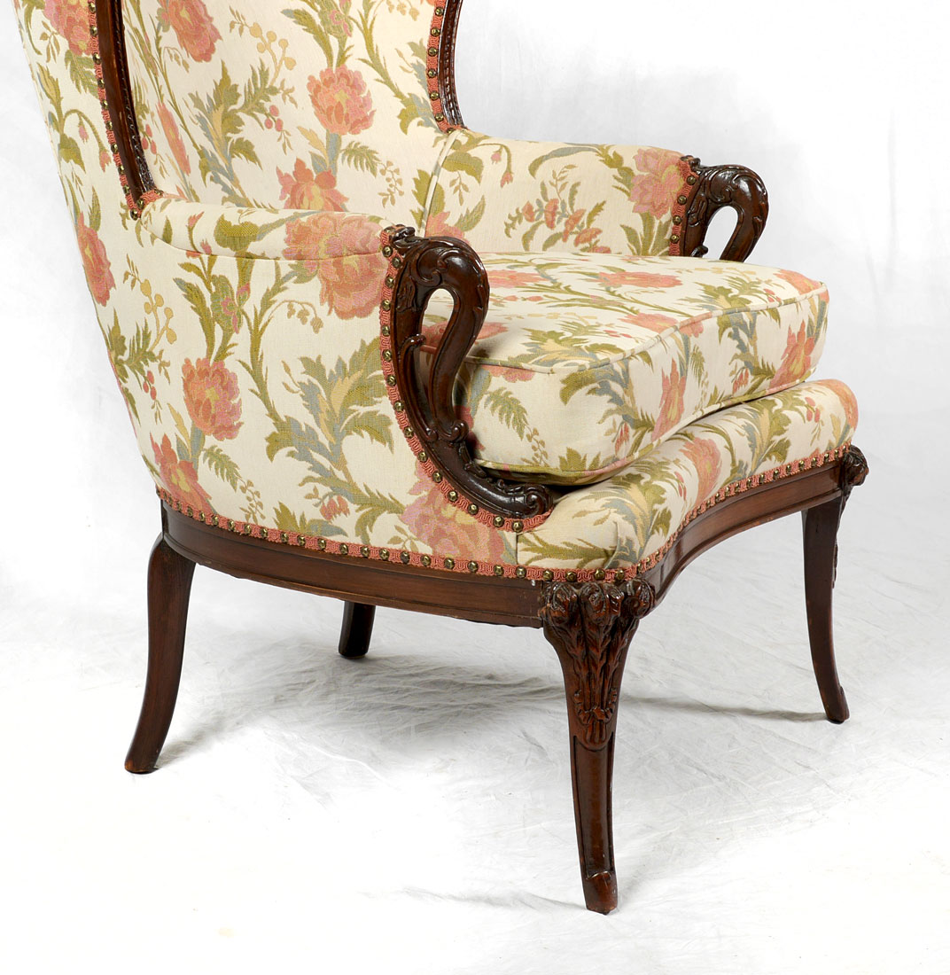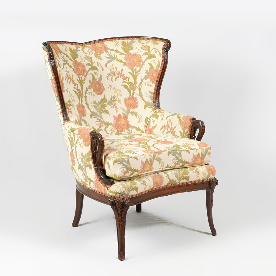 CARVED BERGERE WINGBACK ARM CHAIR: Late 19th to early 20th century carved frame, foliate scroll hand holds and supports, shaped skirt with acanthus leaves at front joints, floral upholstery. Overall 40 3/4'' h. x 27 1/2'' x 32''.