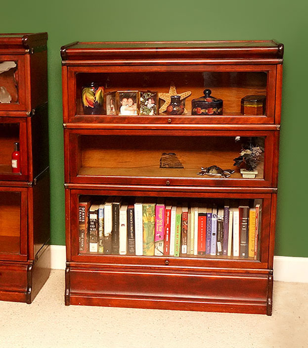 3 STACK GOLBE-WERNICKE MAHOGANY BARRISTER BOOKCASE: 3 stacking lawyers or barrister bookcase, two D-8 1/2, one D-12, plus base and top, overall 45 1/2 ''h. x 34'' x 12''.