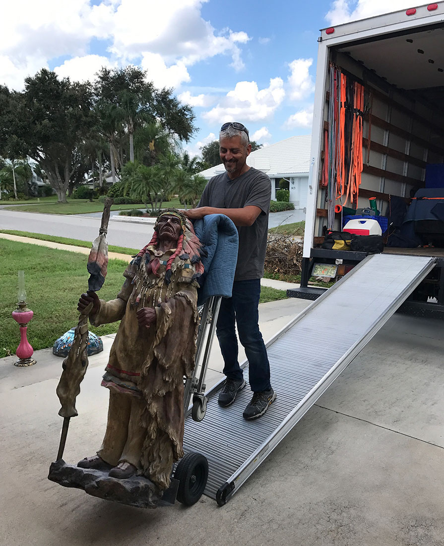RESIN CIGAR STORE INDIAN: Decorative resin figure of an Native American chief in full regalia, holding a staff in one hand. No visible marking, overall measures approx. 59 1/2'' h. x 23'' x 26''