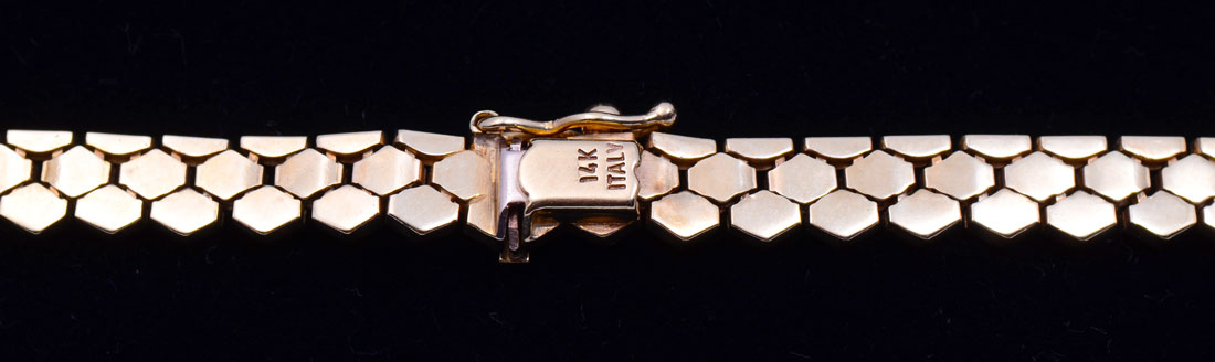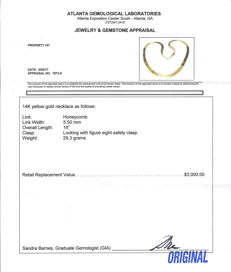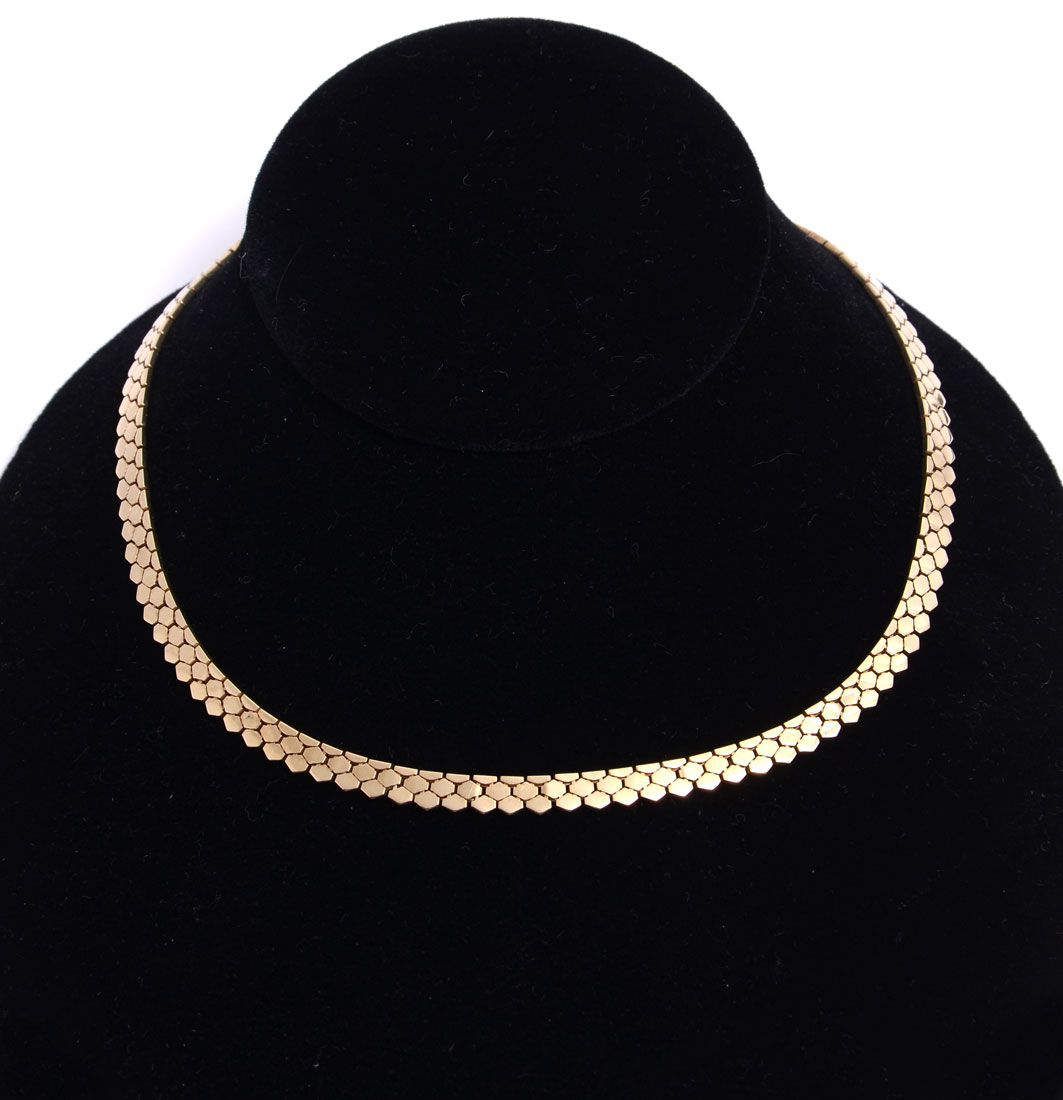 29.3 GRAM ITALIAN 14K TEXTURED CHOKER: Ca 1980 honeycomb textured choler is 16'' long and 5.5mm wide with a safety clasp. Total weight is 29.3 grams. Sold with current Atlanta Gemological GIA graduate's appraisal for $3000.