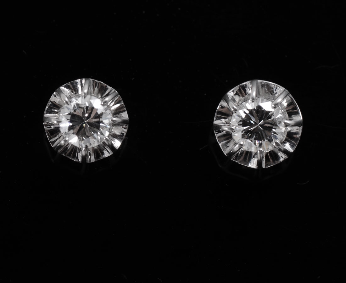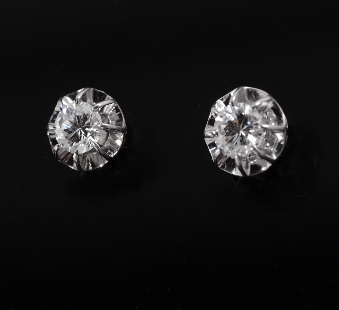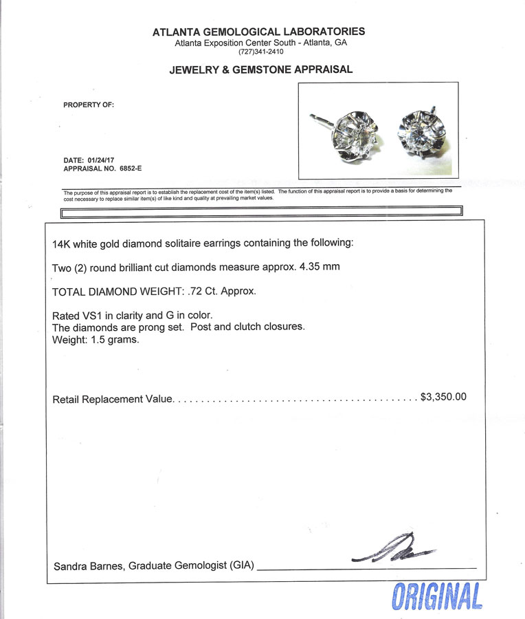 14K DIAMOND SOLITAIRE STUDS: .82 CTW diamonds are set in handcrafted scalloped settings with soft clutch closures. Diamonds are rated VS1 in clarity and G in color. Total weight 1.5 grams. Sold with current Atlanta Gemological GIA graduate's appraisal for $3350.