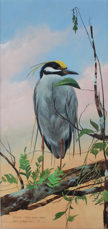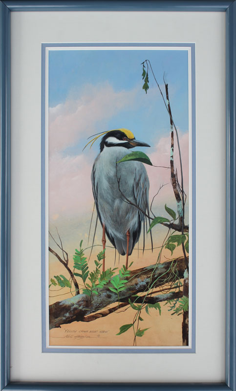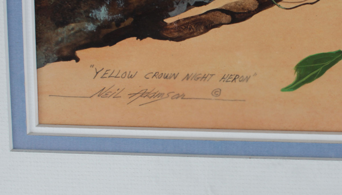 ADAMSON, Neil (American, 20th Century): ''Yellow Crown Night Heron'', Watercolor and Gouache, site size is 19.5'' x 9.5'' signed and titled lower left, framed, 26.5'' x 16''.