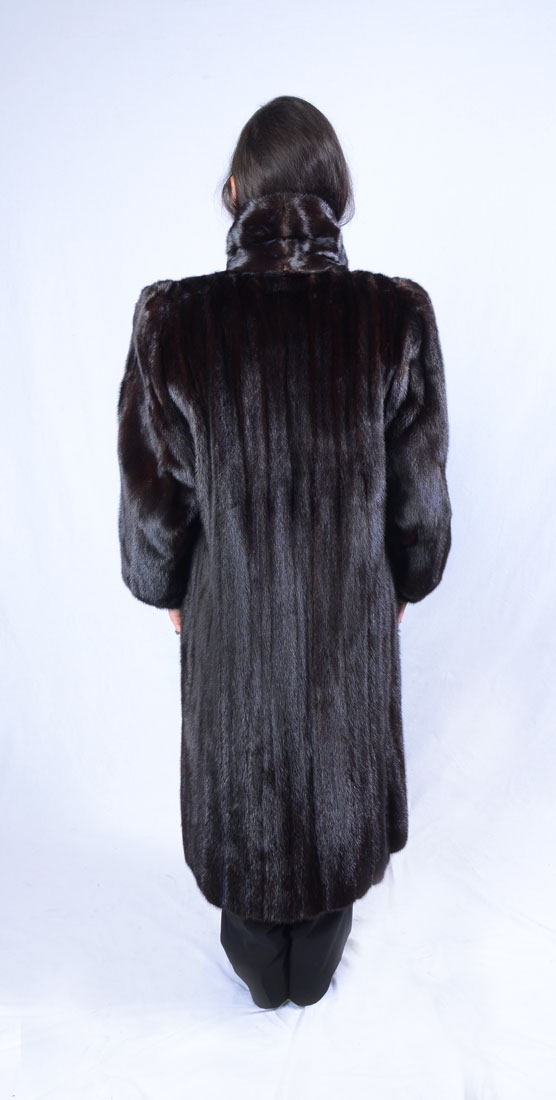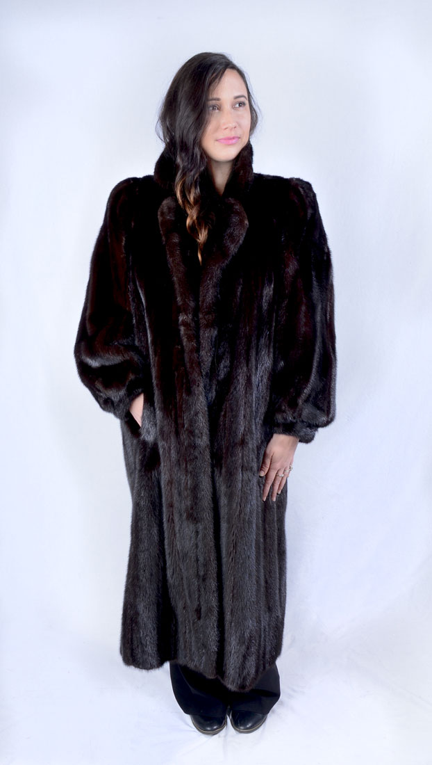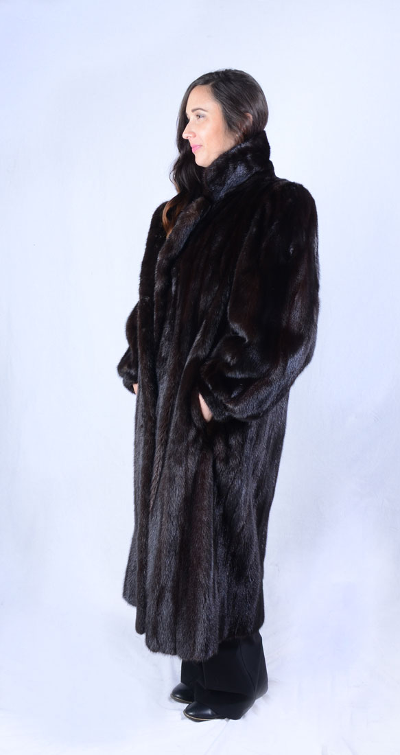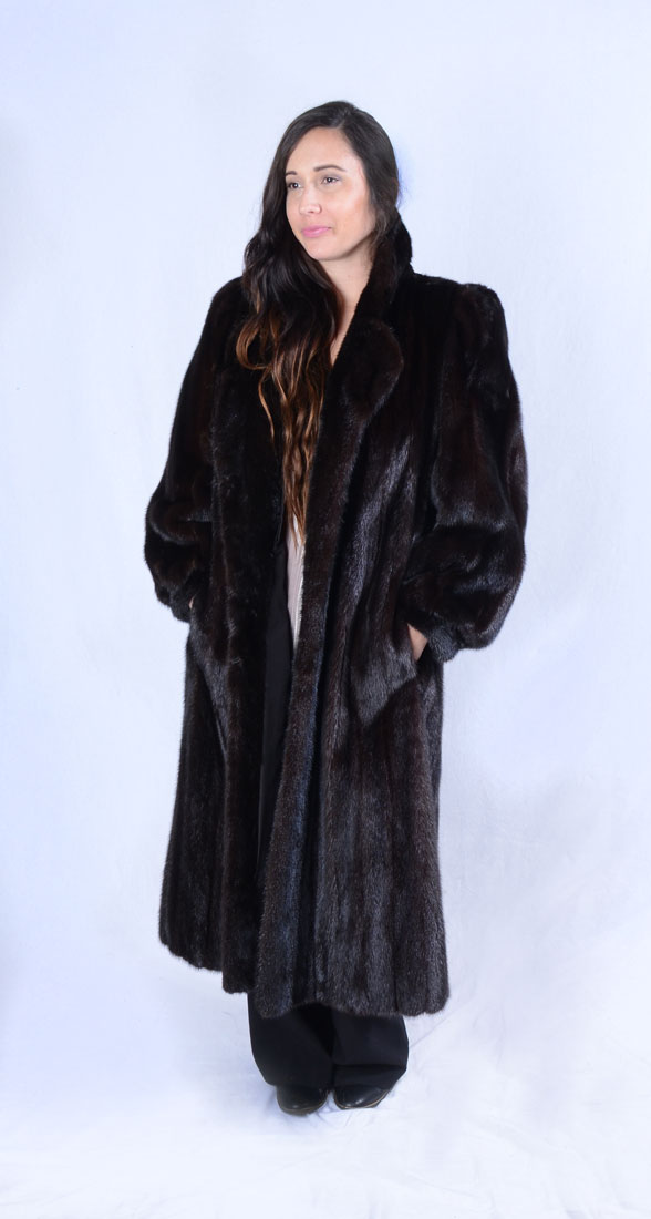 EXCELLENT VINTAGE FULL LENGTH RANCH MINK COAT: This ranch mink has been kept in cold storage and has had only one owner. It is in excellent condition. Approximate measurements: 28.5'' from neck to sleeve cuff/hem, 16.5'' across back and 47'' length from neck to hem. Approximate size 10. Recently verbally appraised by a local fur expert to be in excellent condition and current market value as $2500.