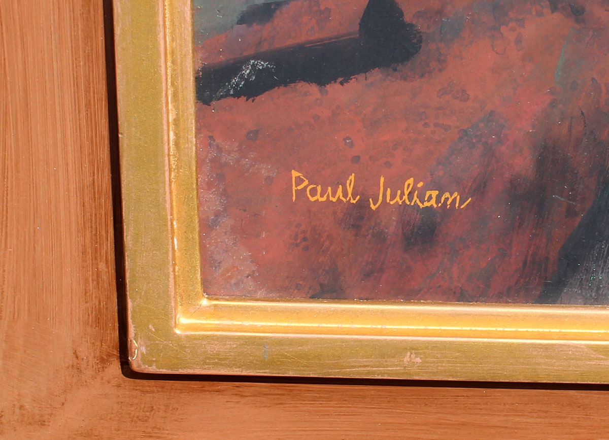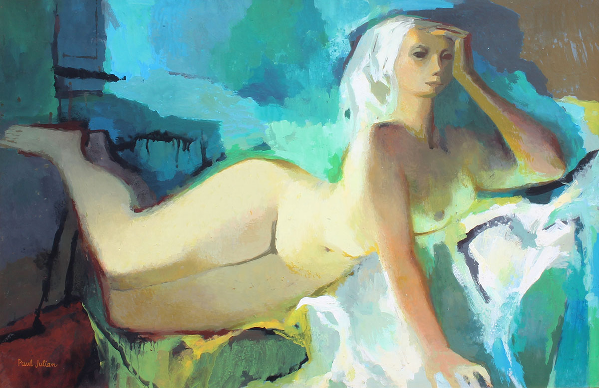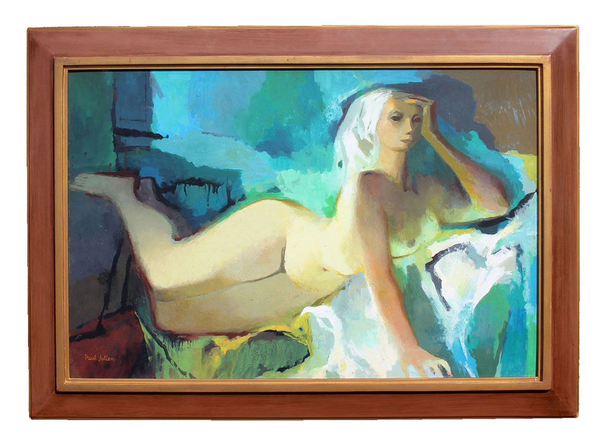 JULIAN, Paul, (American, 1914-1995): ''Reclining Female Nude'', Oil/Board, 24'' x 30'', signed lower left, fine framing, 30'' x 42''. Julian was primarily active and working in the Santa Barbara, Los Angeles, California area, and this painting sold at auction in the past for over $4,000.