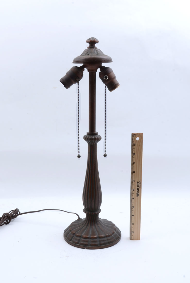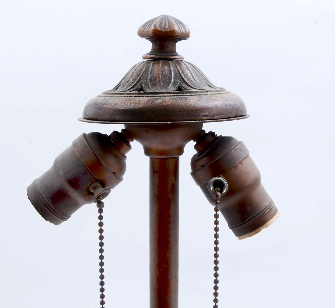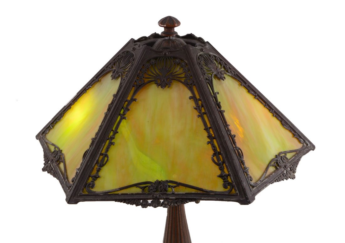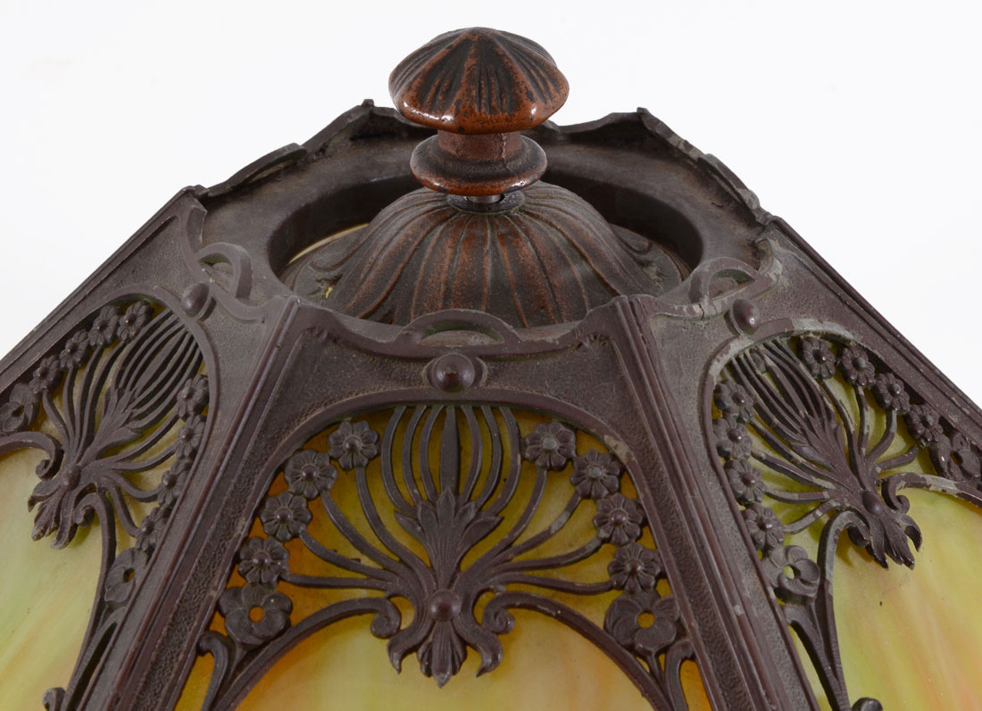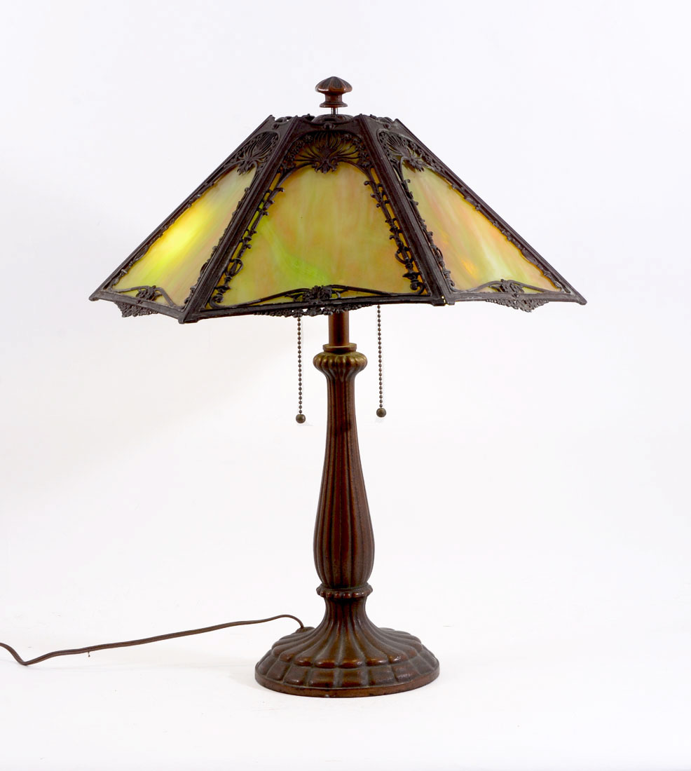 CAST IRON GREEN SLAG GLASS LAMP: Unmarked fluted patinated cast iron base, double socket fixture, 22'' h. x 6 1/2'' base dia. 6 panel green slag glass lamp, filigree cast iron frame, 7 1/4'' h. x 16 1/2''.