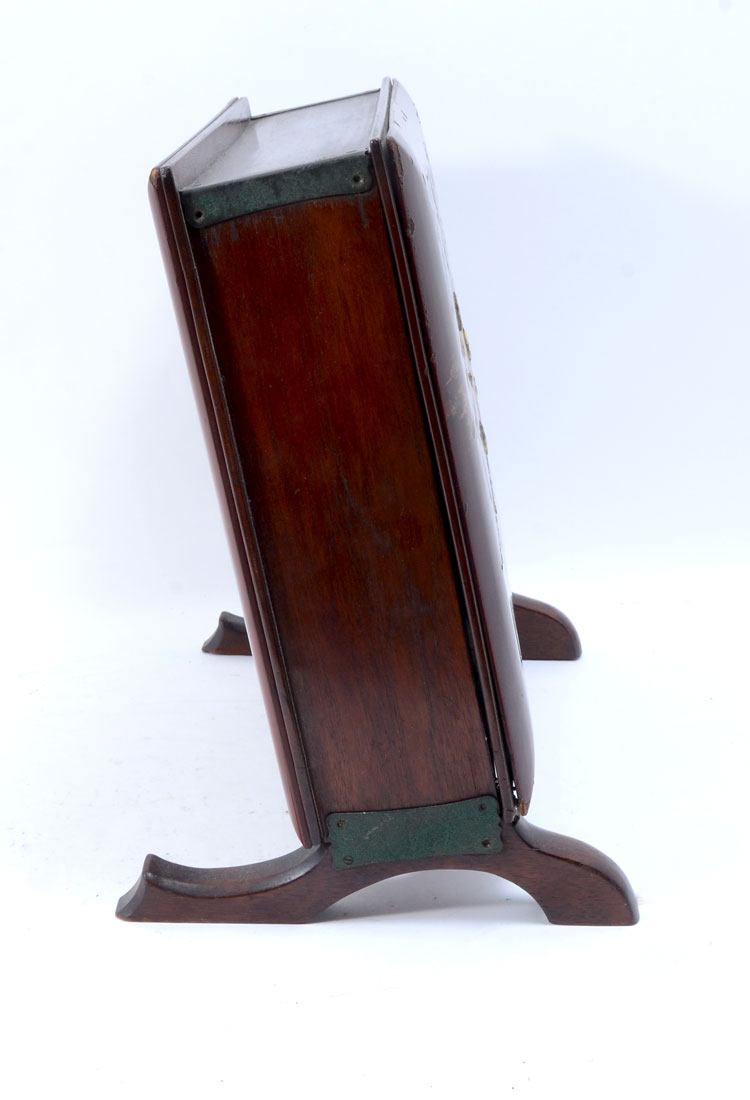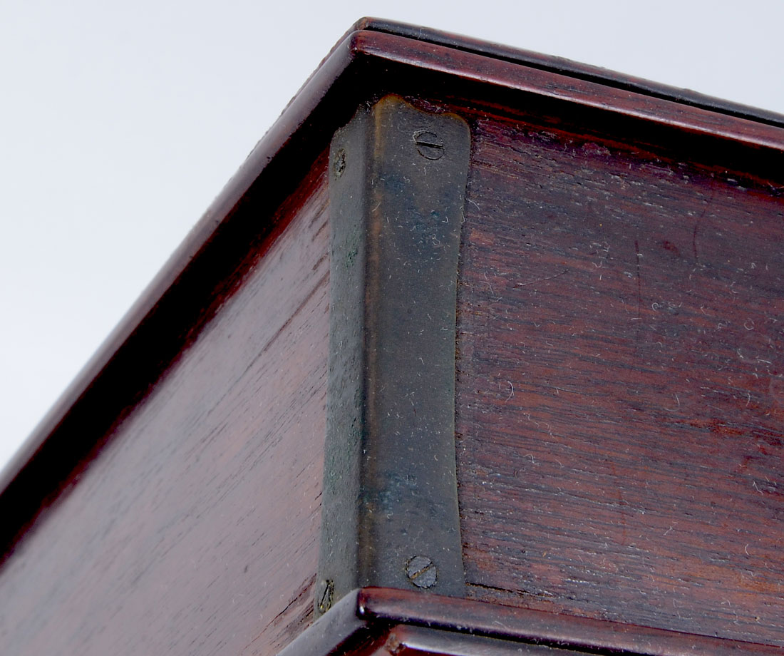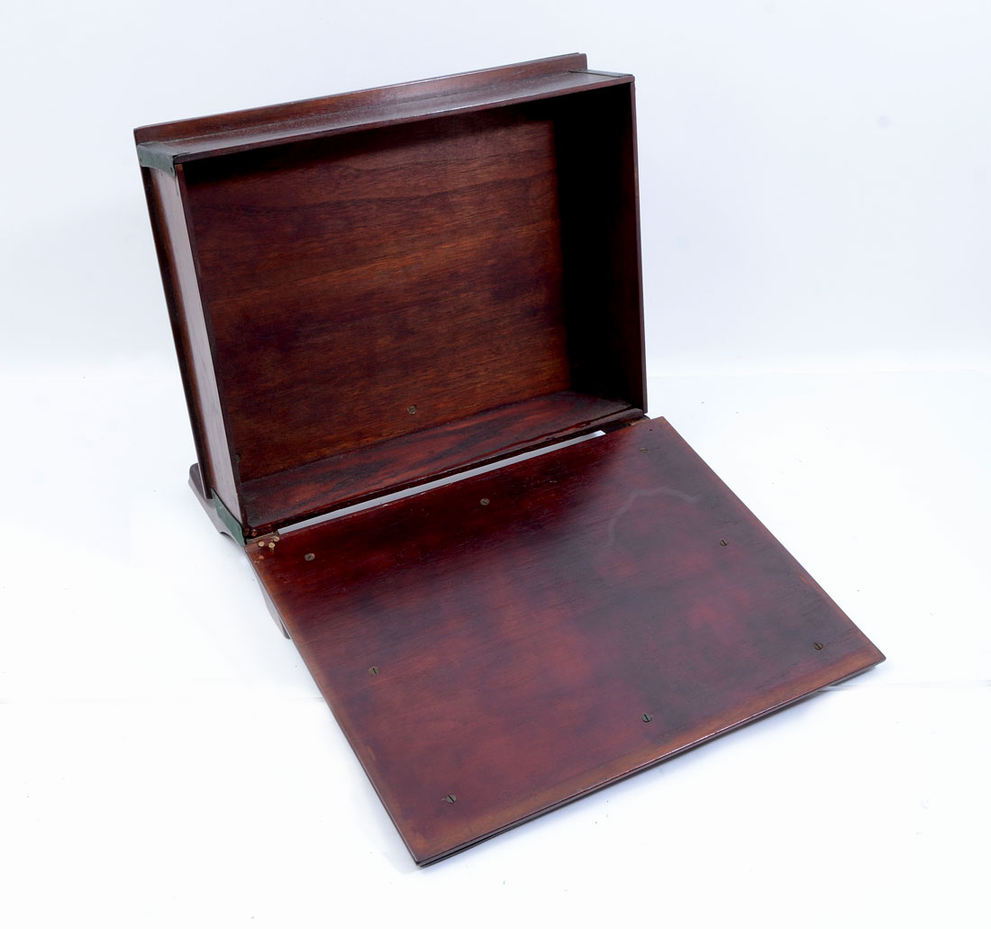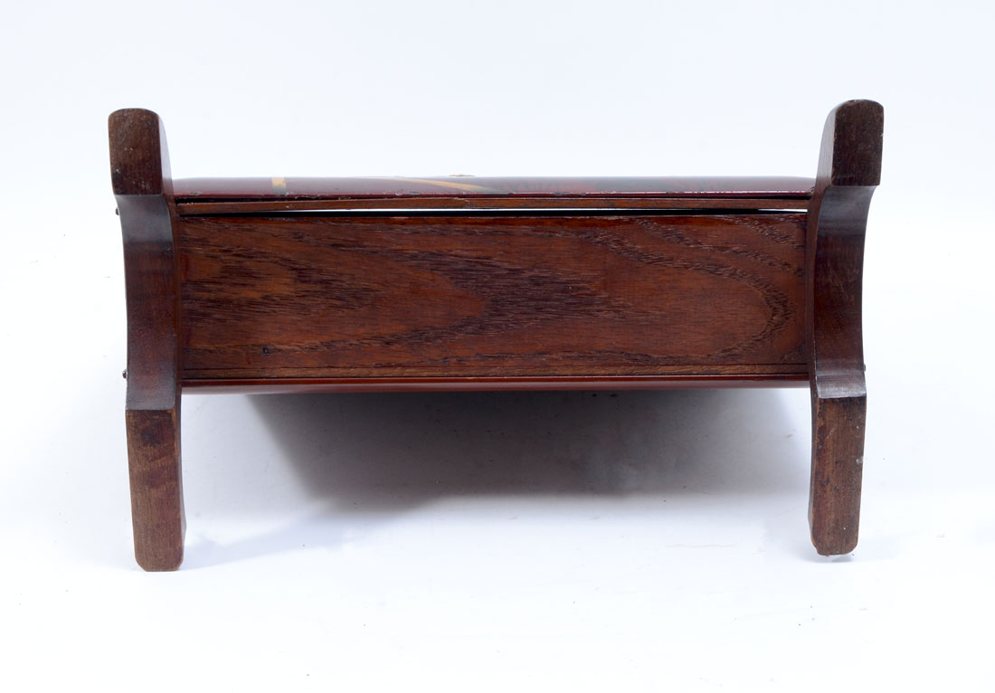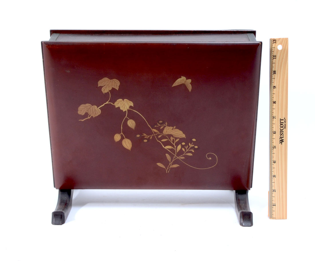 JAPANESE SHIBIYAMA LACQUER BOX: Red lacquer with raised polychrome outdoor genre scene on fall front lid, on later applied legs. Overall 12 1/2'' h. x 13 1/4'' x 8 1/4''.
