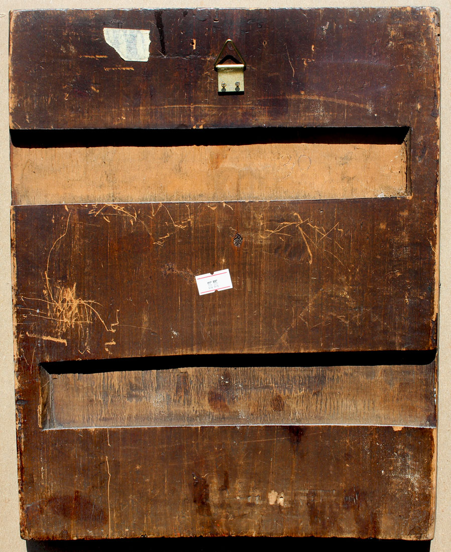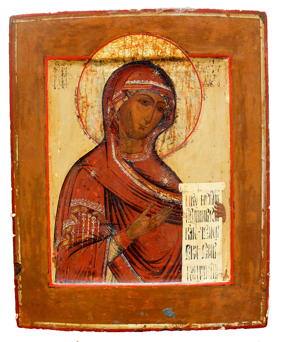 ICON PAINTING OF THE MADONNA: Oil/Wood panel, depicts Madonna holding a scroll with Cyrillic inscriptions, 13'' x 11''. Bowing to wood panel, scattered flecks of loss, sold as is.