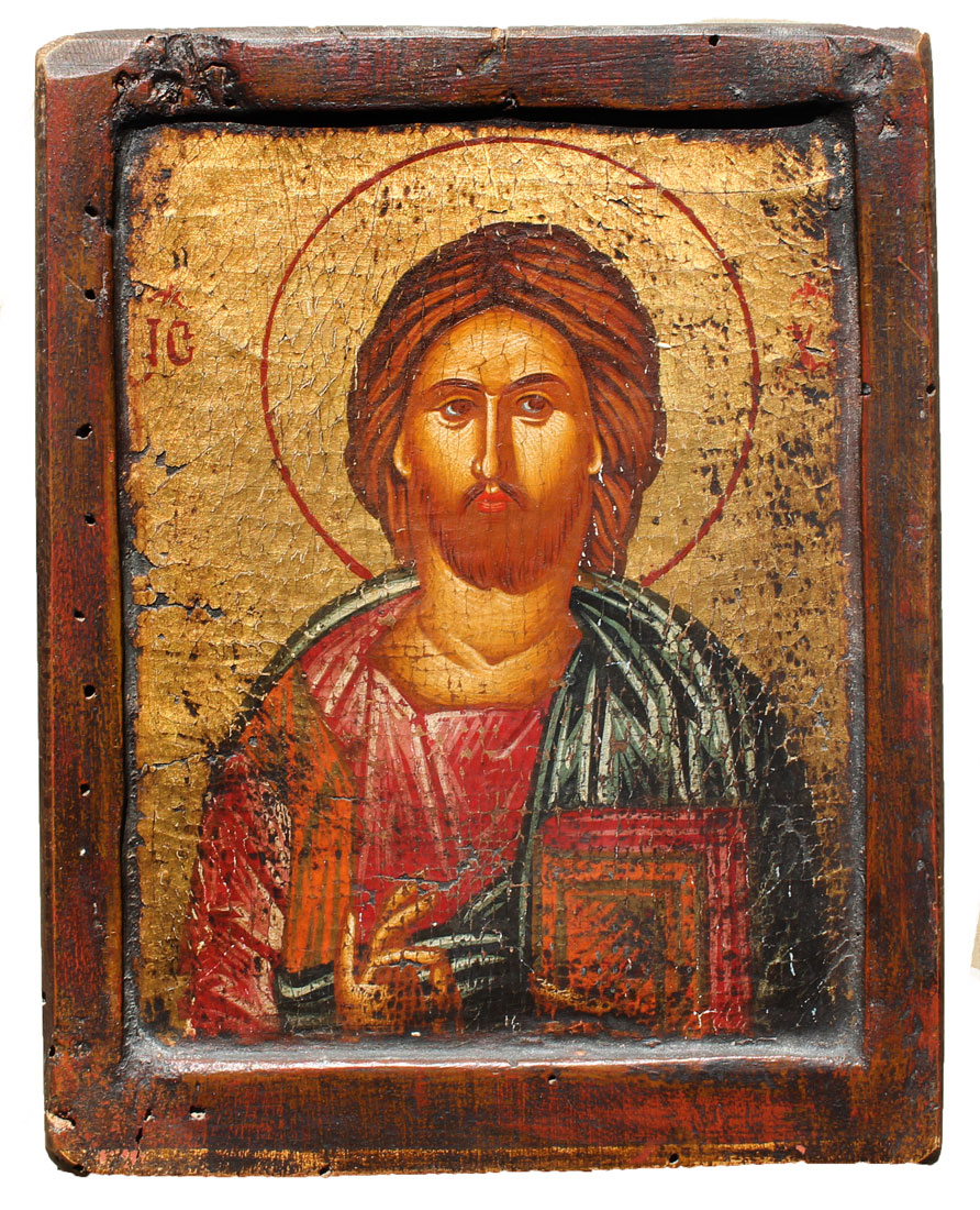 CHRIST ICON PAINTING: Oil/Wood panel, 11'' X 8.75'', gold background with Cyrillic inscriptions,