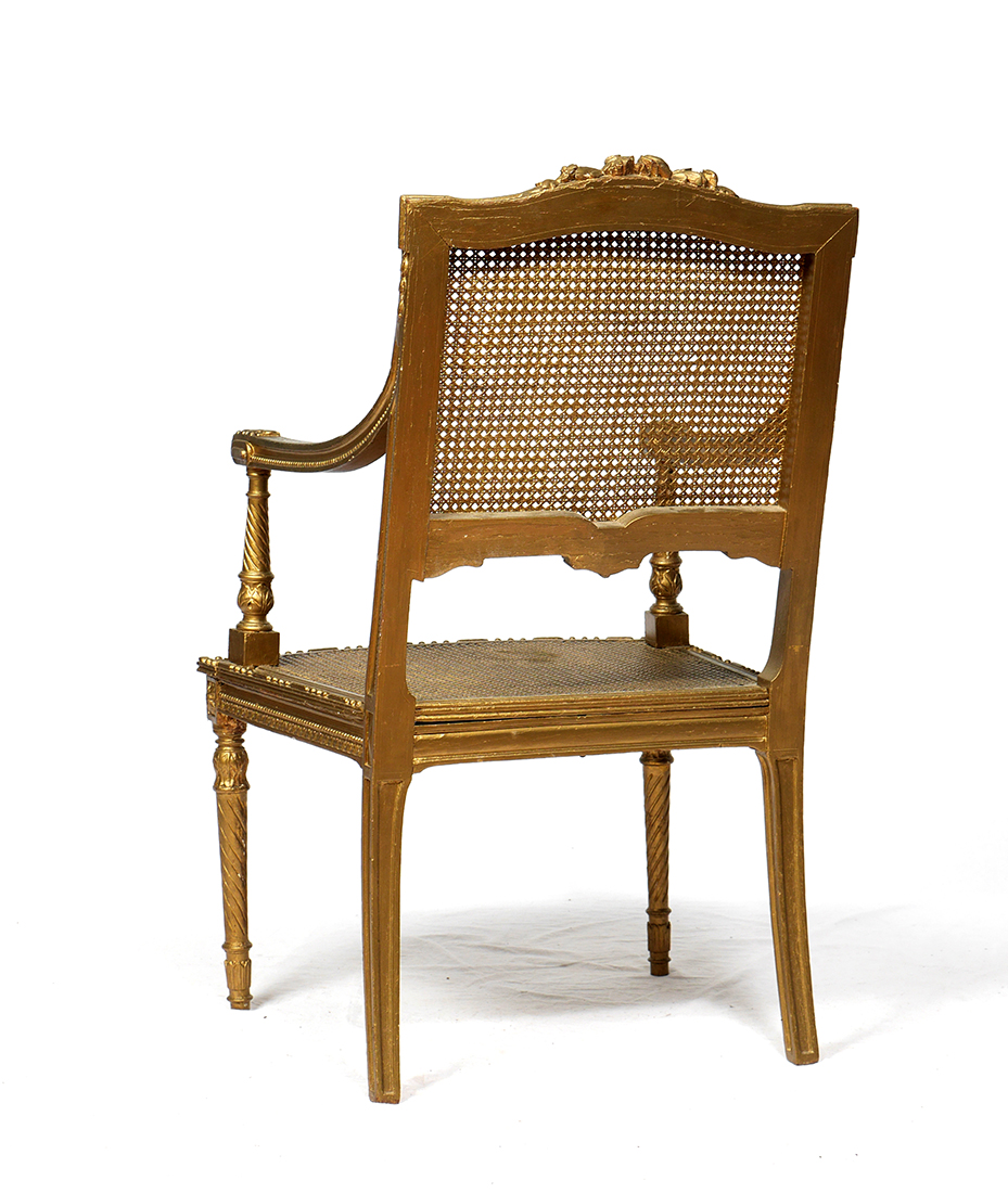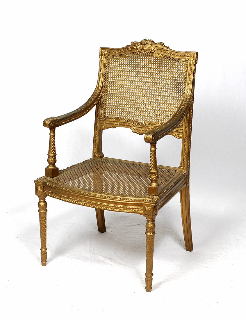 LOUIS XV GILT DECORATED CANED FAUTEUIL CHAIR: Carved gold paint decorated frame, top rail with floral crest, foliate arms, shaped skirt, carved and turned legs, caned seat and back. Overall 37 1/4'' h. x 23'' x 22''.