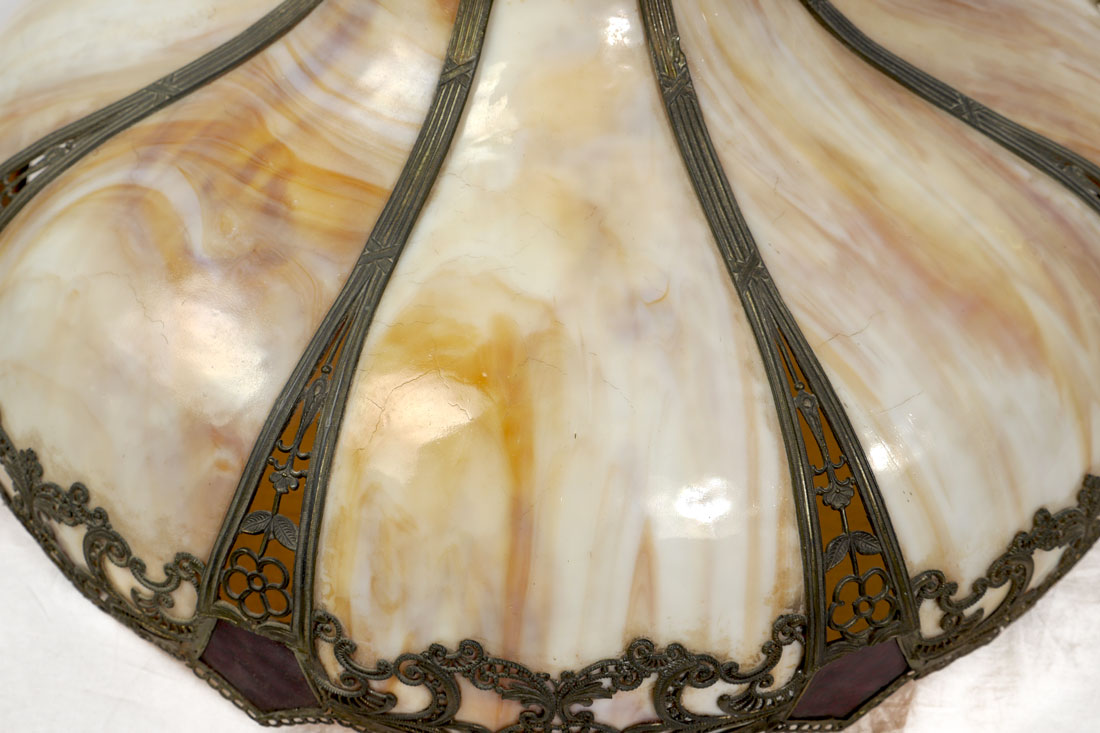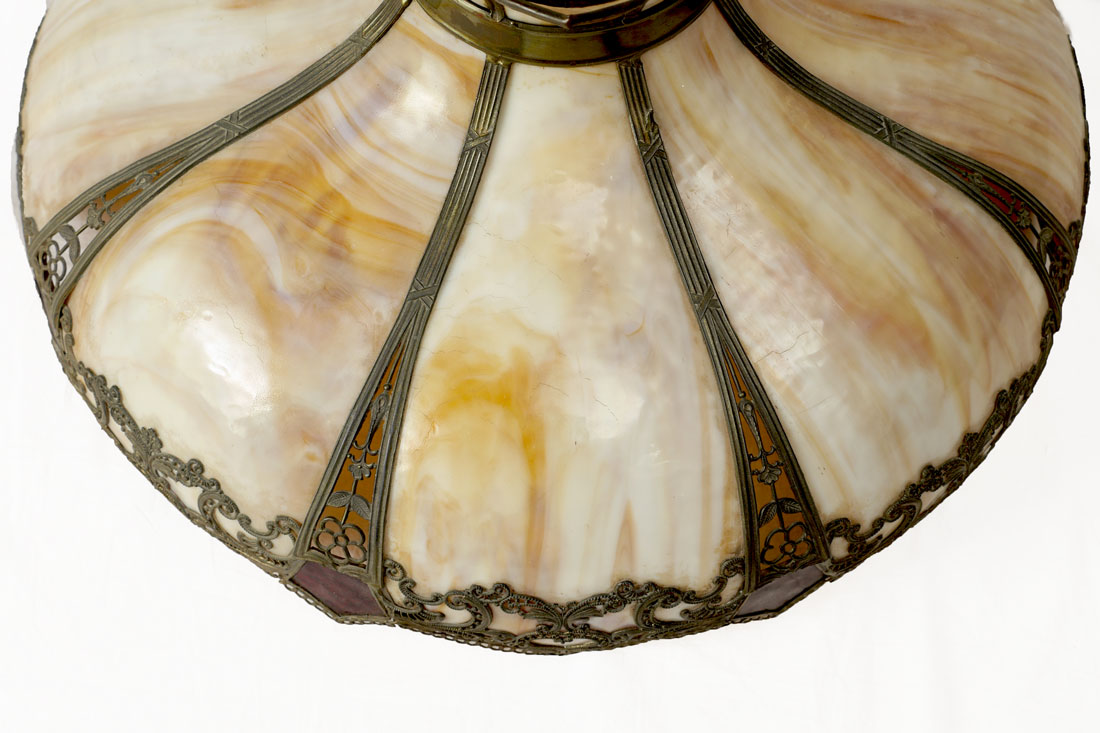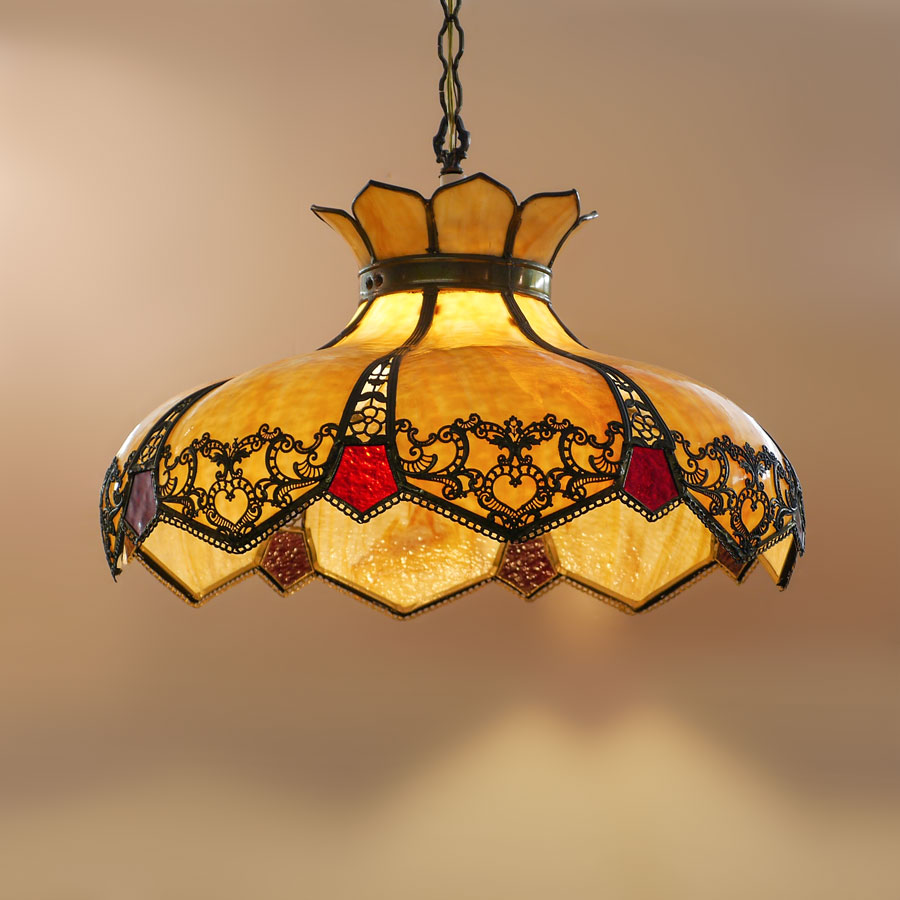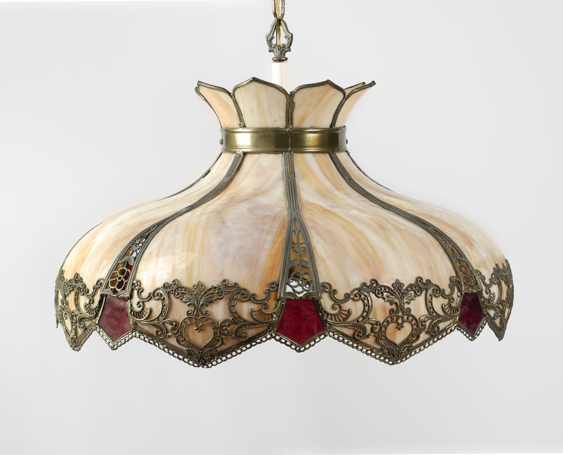 CARAMEL SLAG GLASS BENT PANEL HANGING LAMP: 8 double bent caramel slag glass panels, pierced filigree metal frame with red glass inserts, 15 1/2'' h. x 24''.
