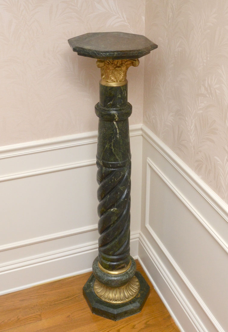 GREEN GILT METAL MOUNTED MARBLE PEDESTAL: Octagonal top, column shaft with cast metal acanthus leaf capital, lower half with carved twist, octagonal base, cast gilt metal spacers, 56'' h. x 13 1/2'' dia. base and top.