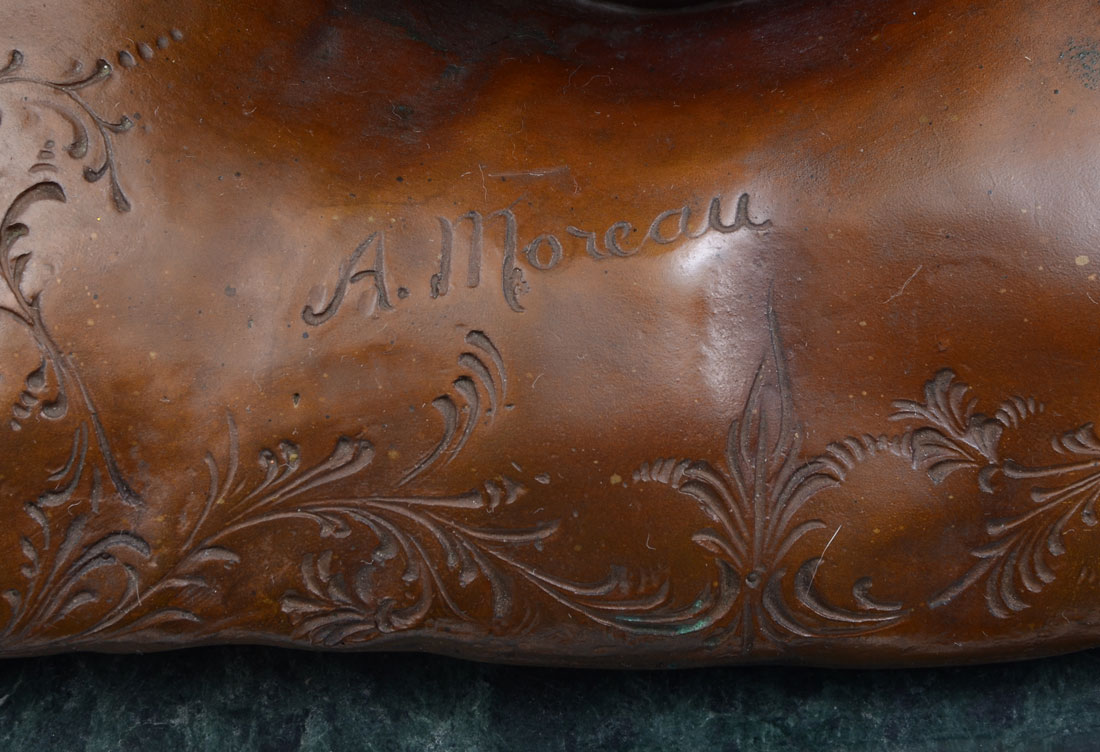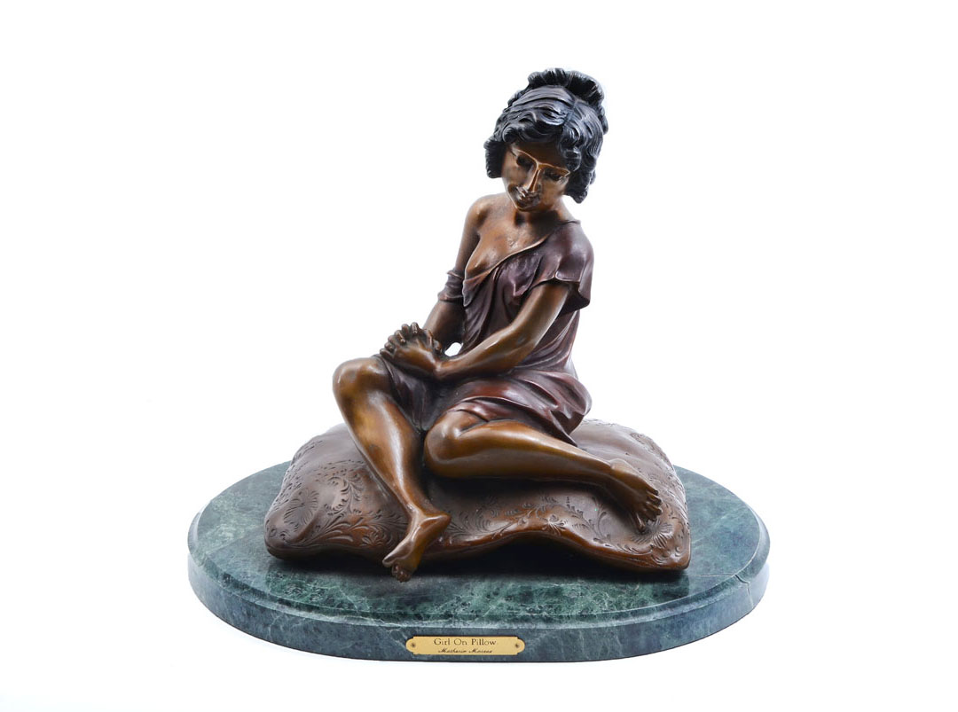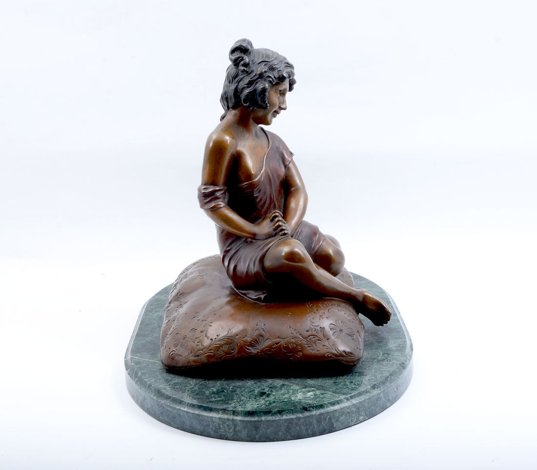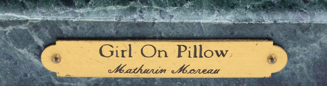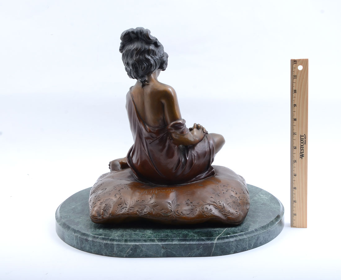 BRONZE SCULPTURE AFTER MOREAU: ''Girl on Pillow'', Patinated Bronze, 13''H x 11.5''W x 10'' deep. Incised signature affixed to beveled green marble plinth.